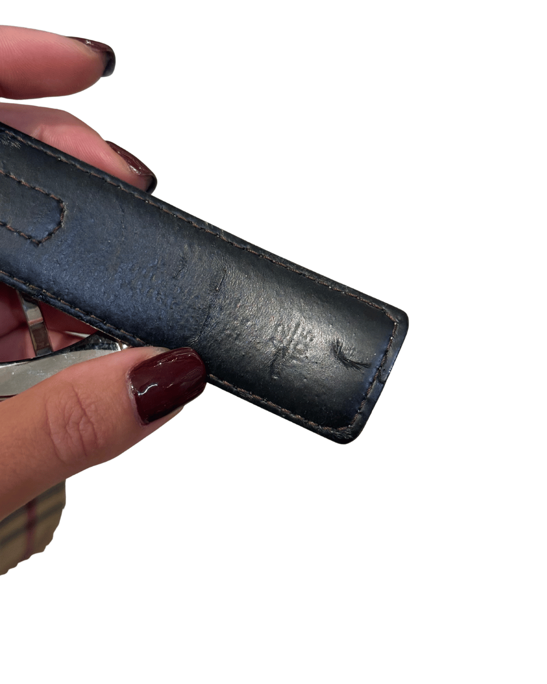 Condizioni: L’interno in pelle presenta segni di utilizzo, visibili nelle foto, che non compromettono la funzionalità dell’accessorio. La fibbia mostra lievi graffi dovuti al normale utilizzo.
