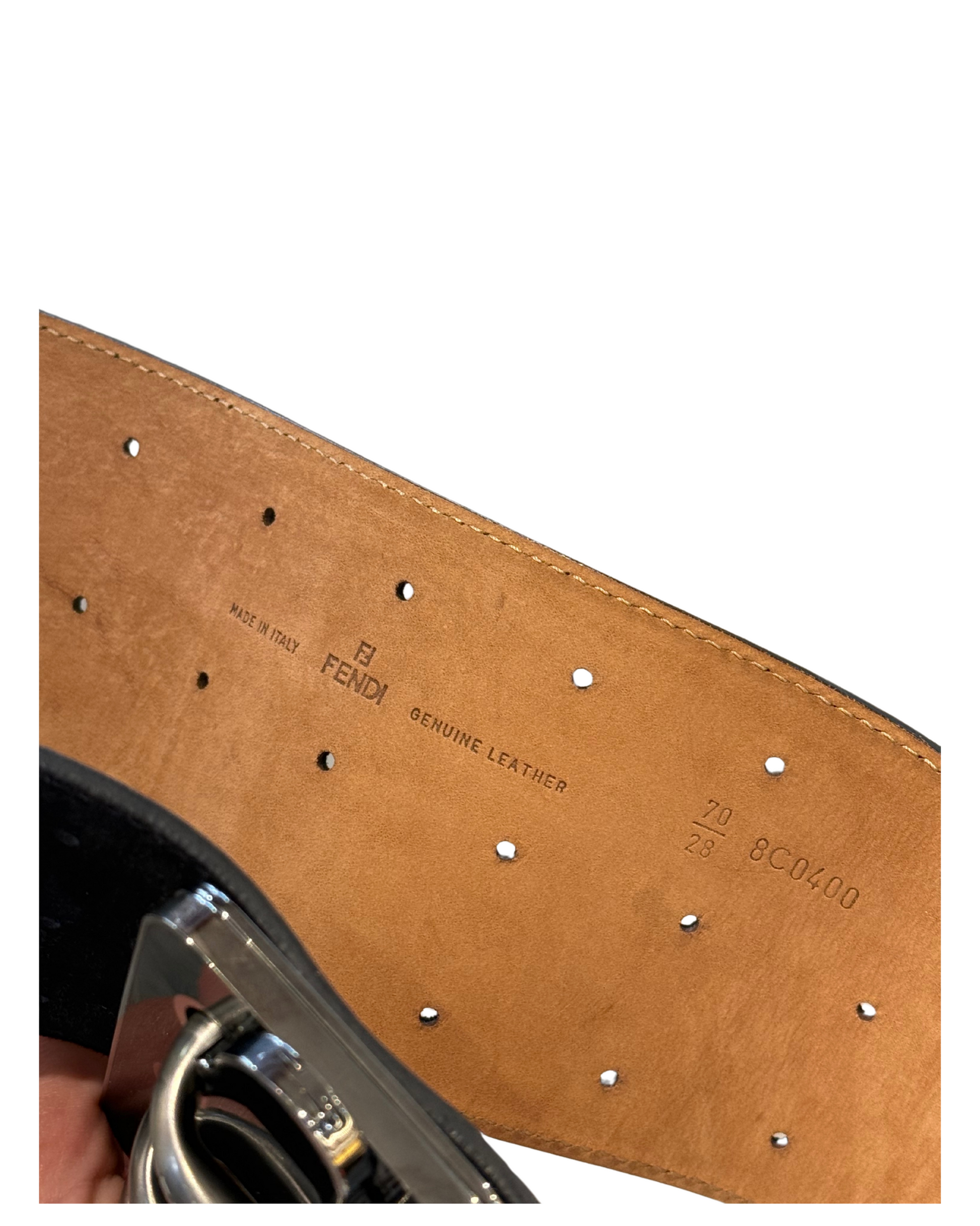 Cintura di Fendi con design strutturato, perfetto per aggiungere un tocco di carattere anche al look più semplice. Realizzata in pelle scamosciata nera, perfetta da utilizzare in vita per esaltarla. Fibbia frontale con anelli metallici argentati e placca smaltata di nero.