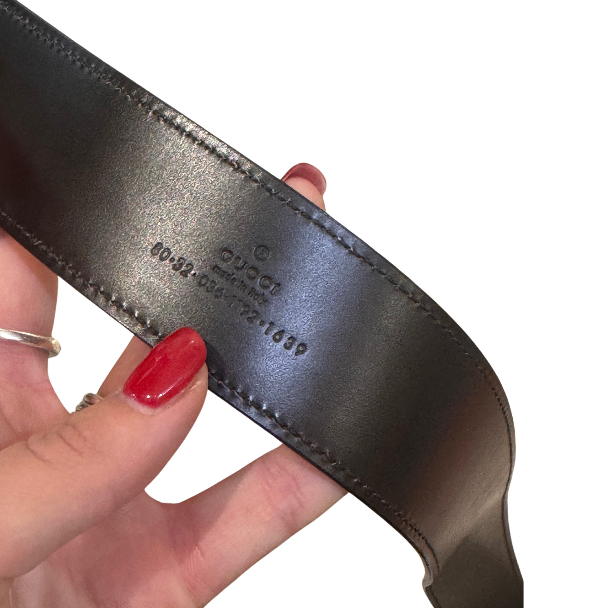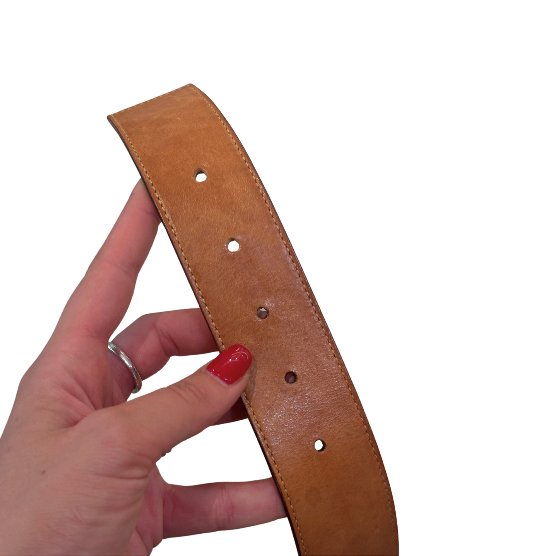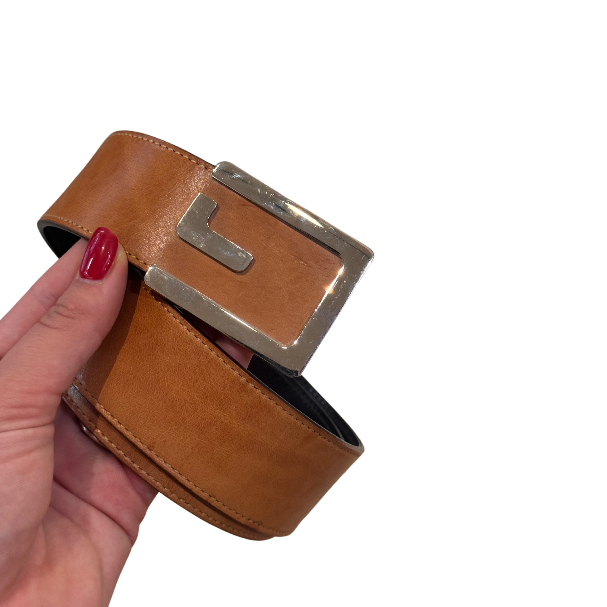 Cintura di Gucci in pelle color cuoio con fibbia G in metallo argentato.