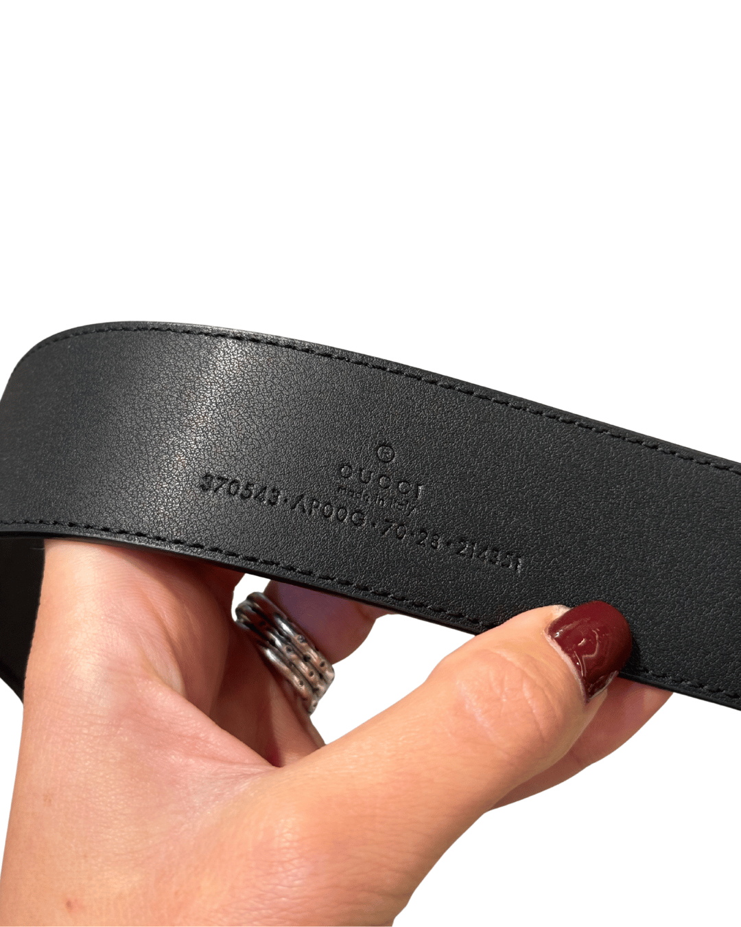 Un accessorio intramontabile e simbolo di eleganza: la cintura in pelle nera di Gucci, caratterizzata dall’iconica fibbia GG in metallo argentato lucido. Realizzata in pelle liscia di alta qualità, con bordi rifiniti e cuciture tono su tono, è il complemento perfetto per valorizzare qualsiasi look, dal più casual al più sofisticato.