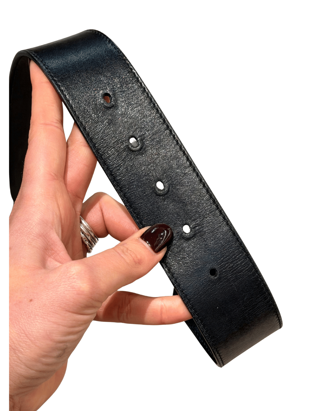 Iconica e intramontabile, la cintura Gucci Marmont è uno degli accessori più riconoscibili della Maison, perfetto per aggiungere un tocco deciso e sofisticato a qualsiasi look. Realizzata in pelle nera liscia, è impreziosita dalla celebre fibbia GG oversize in metallo color oro, simbolo distintivo della linea Marmont. Un accessorio versatile, ideale da indossare sia su jeans che su abiti o blazer, per valorizzare il punto vita con eleganza.