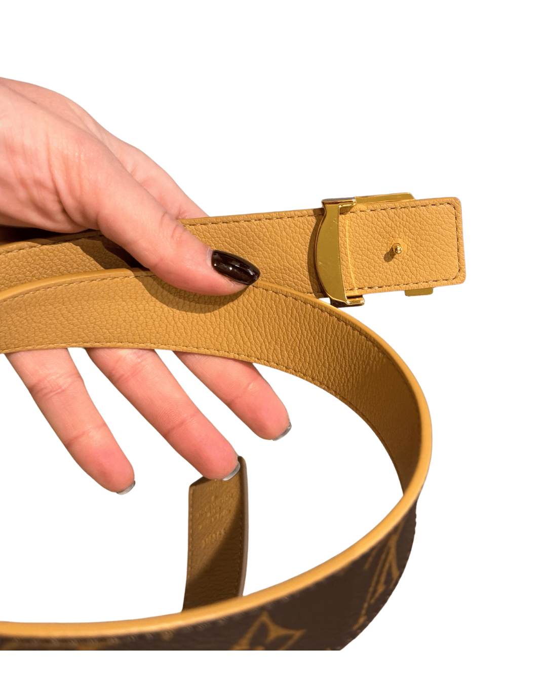 è infatti un modello reversibile, pensato per offrire due stili in uno. Da un lato la classica tela Monogram, dall’altro un raffinato interno in pelle color beige, perfetto per abbinamenti più minimal e delicati. La fibbia LV in metallo dorato aggiunge un tocco luminoso e immediatamente riconoscibile. Perfetta su jeans, pantaloni sartoriali o anche per definire il punto vita sopra blazer e abiti.
