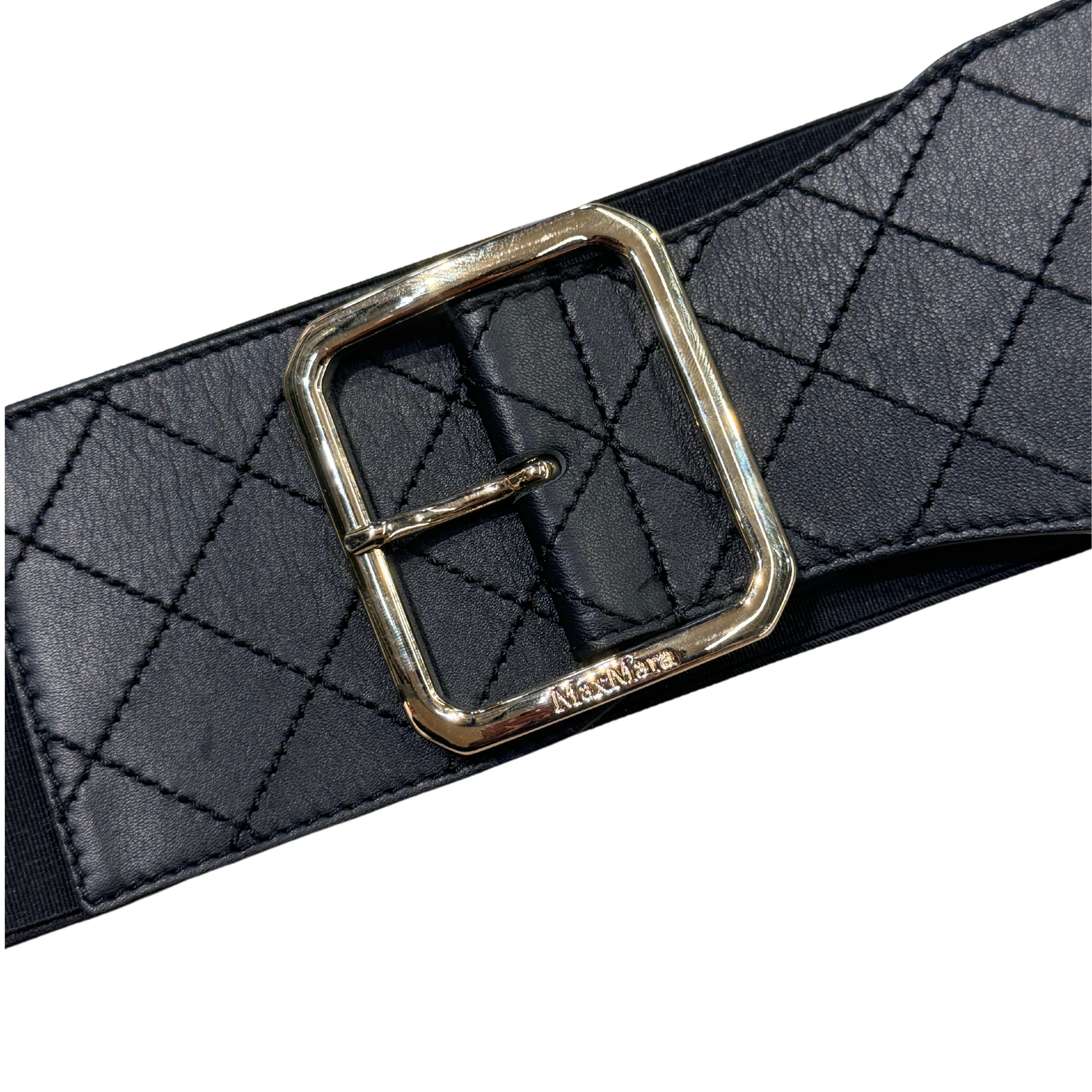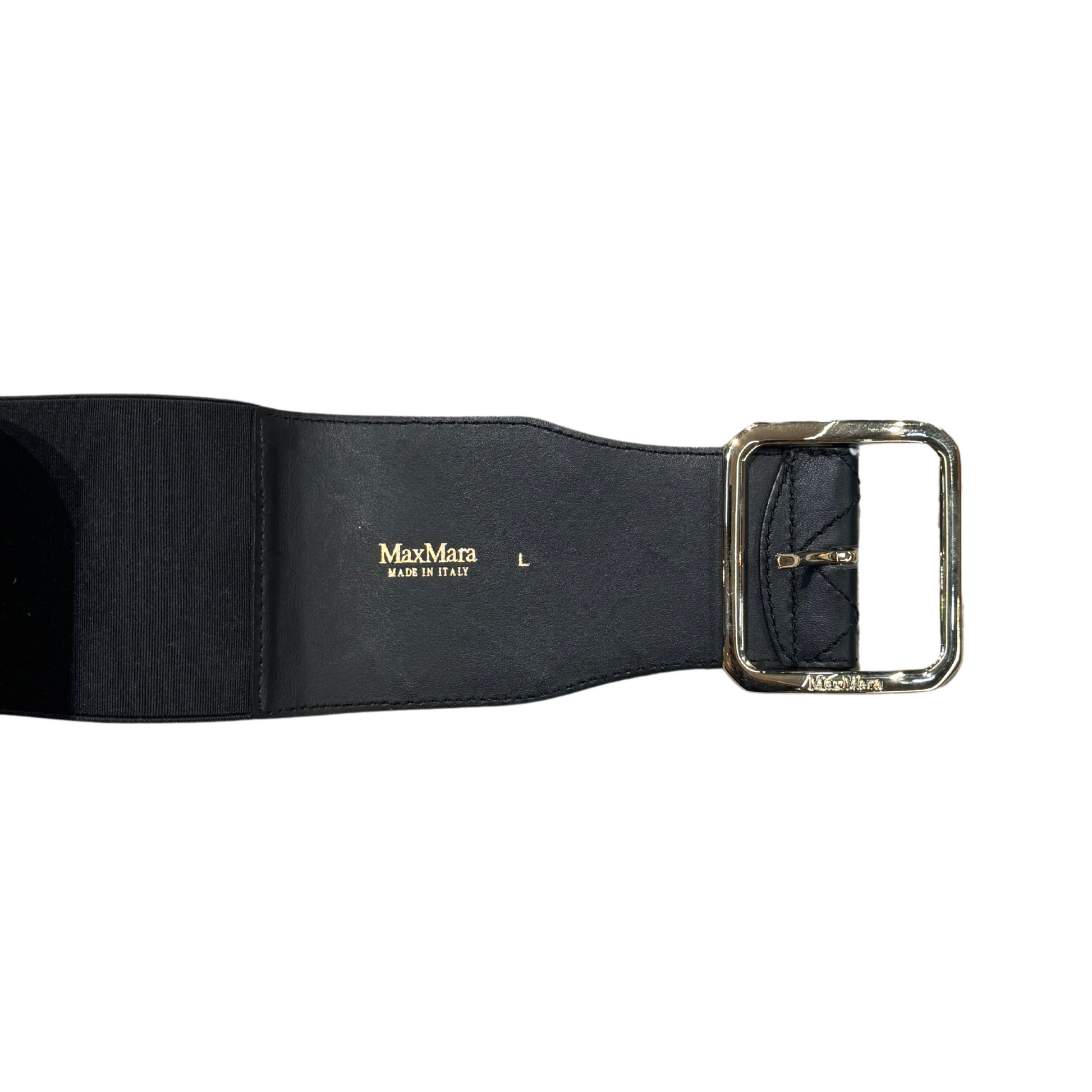 Cintura Max Mara , parte posteriore elasticizzata nera. Rifiniture in pelle liscia nera, trama a rombi. Fibbia in metallo dorato. logo impresso. Perfetta da utilizzate sopra a un cappotto o un tubino.