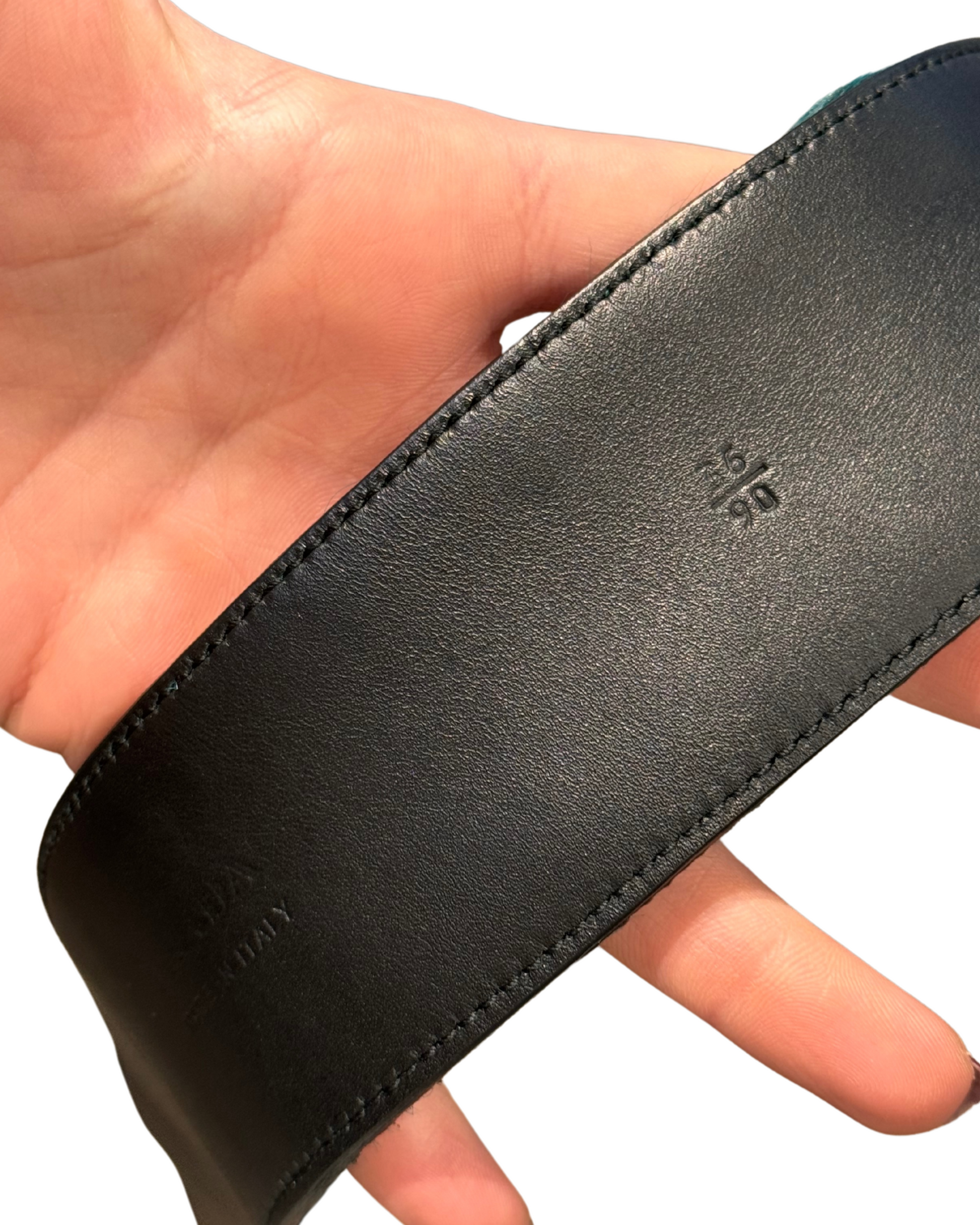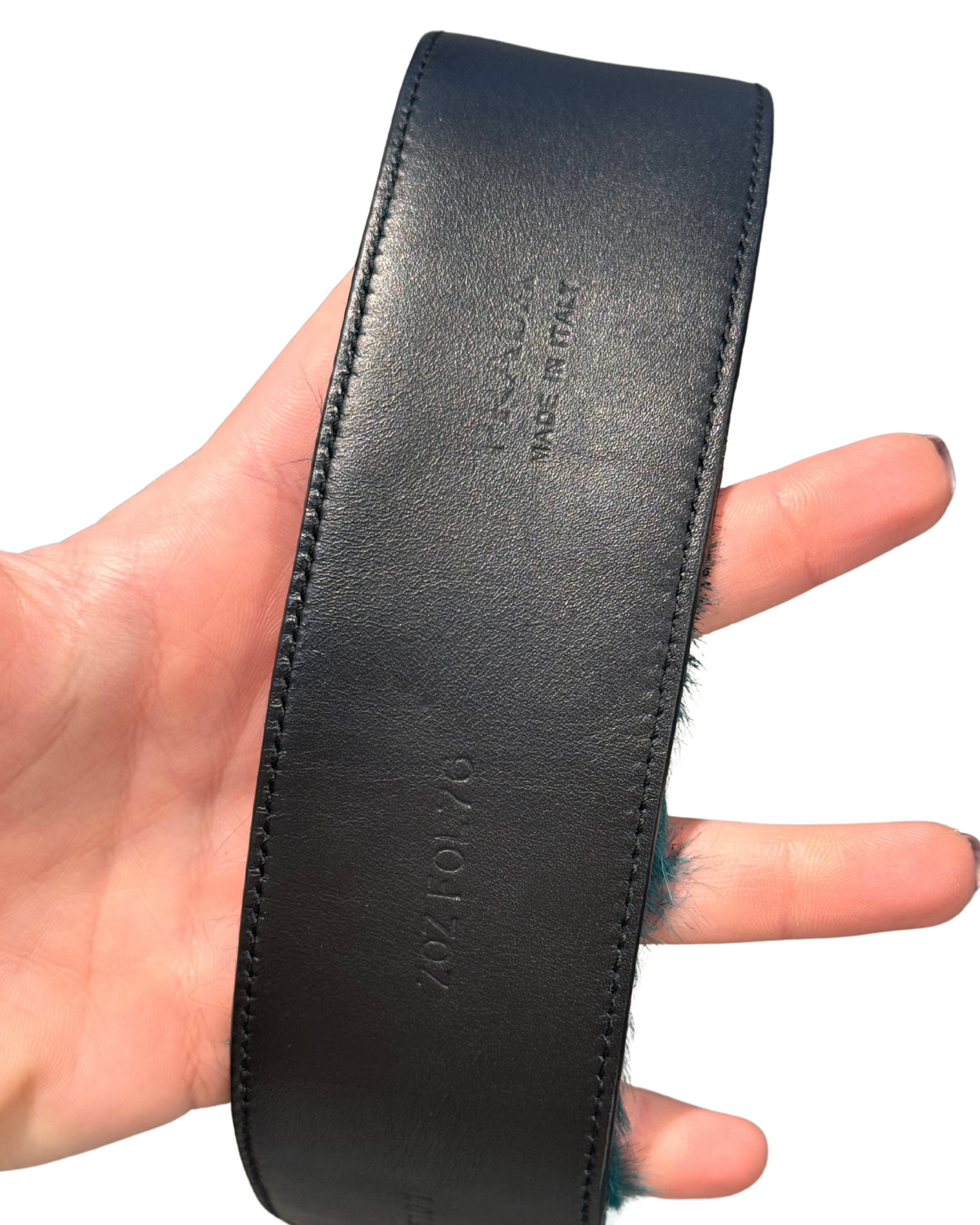Originalissima cintura di Prada realizzata in pelle nera e pelo color verde petrolio. Fibbia frontale in metallo argentato.