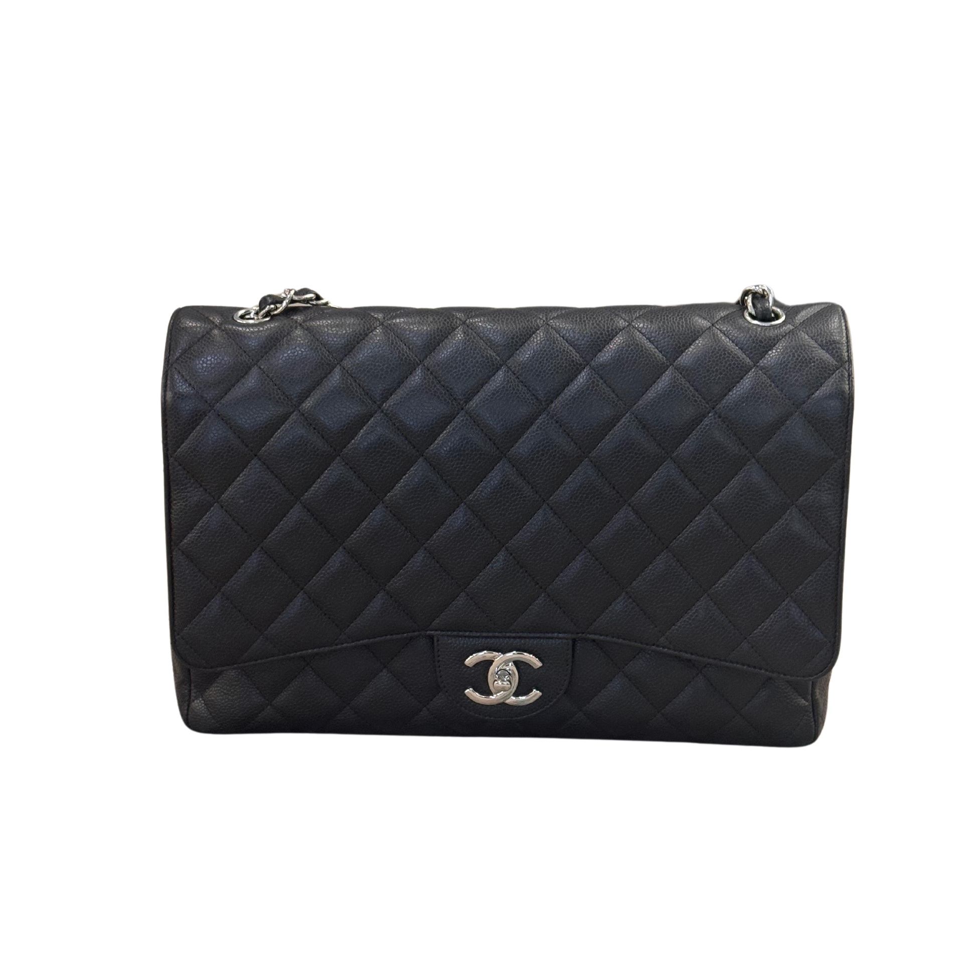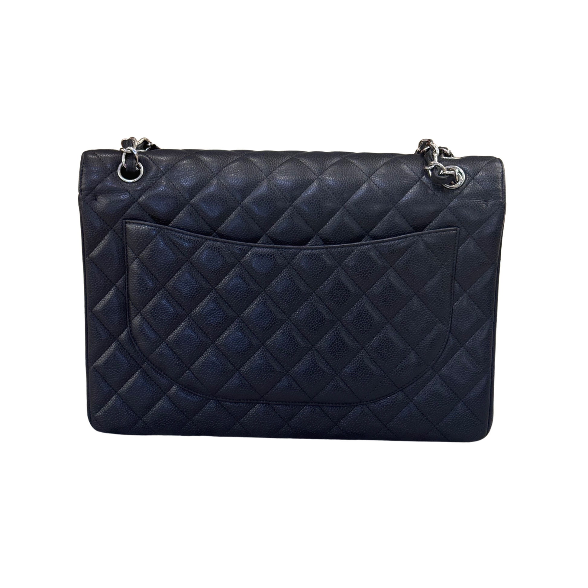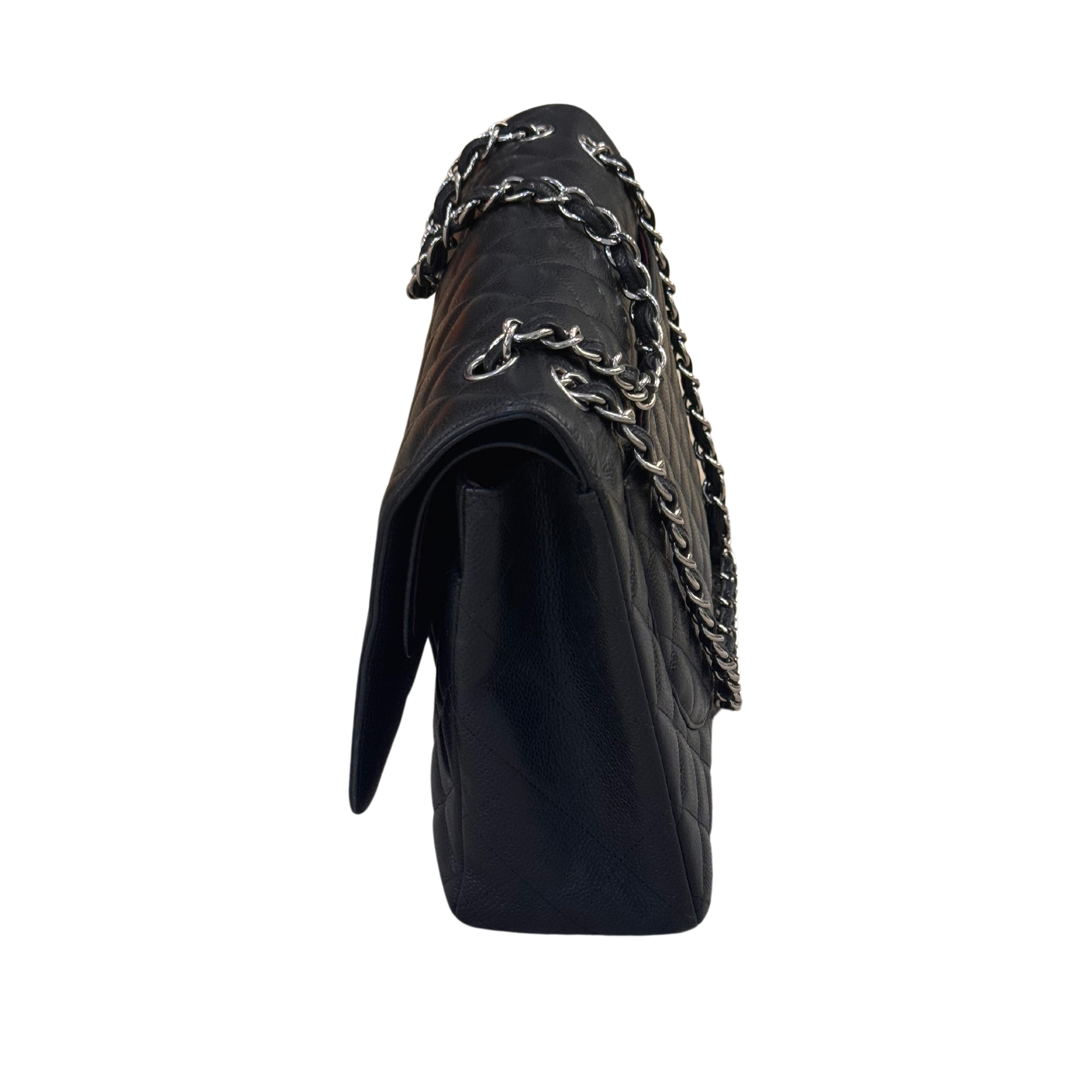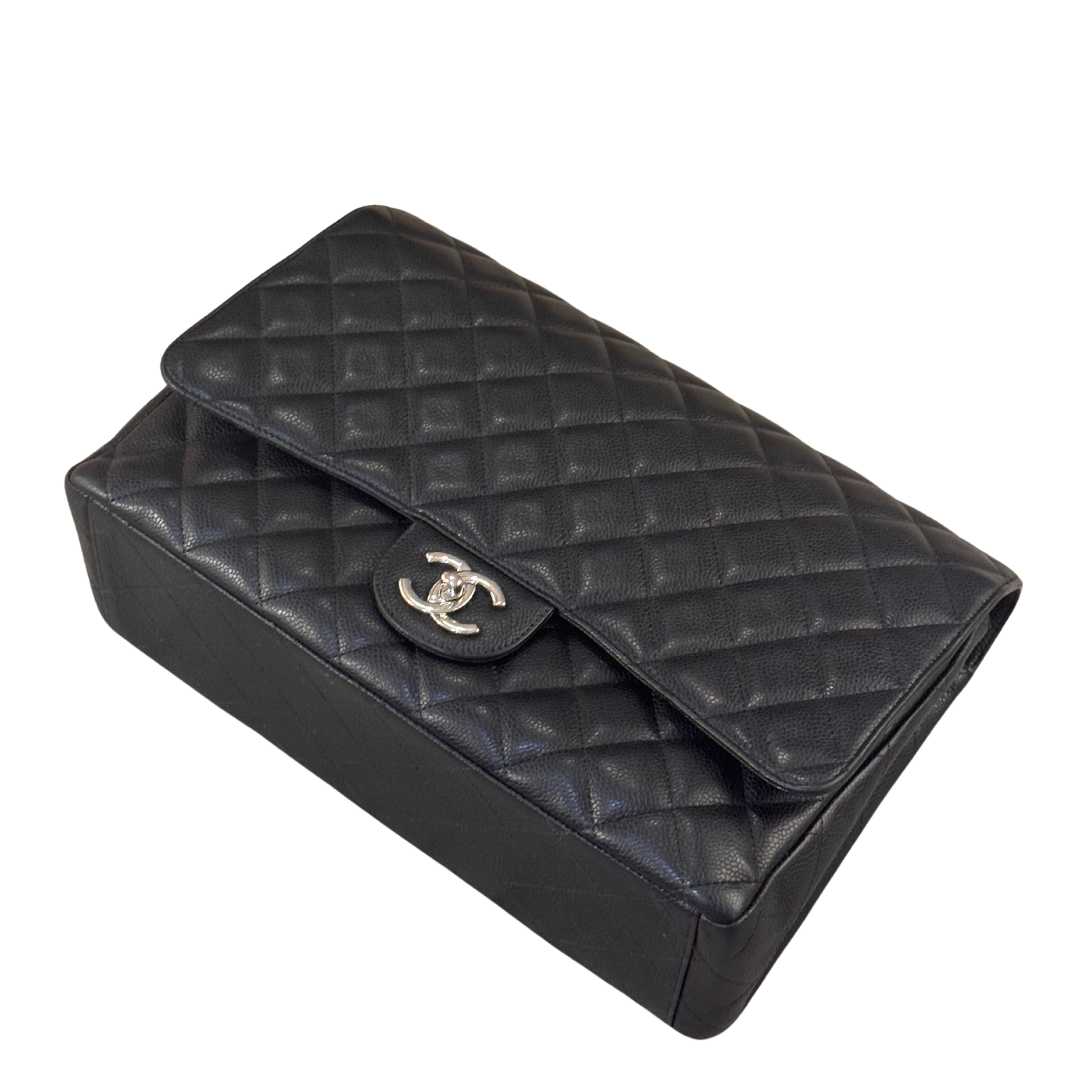 Classic Flap Jumbo di Chanel in pelle caviar nera. Iconica trama a rombi. Patta frontale, apertura a girello "CC". Doppi manici a catena e pelle. Metalleria argentata. Interno in pelle liscia. Tasca con cerniera. Tasca esterna posteriore piatta. ( CODICE: 18771762) anno 2013-2014