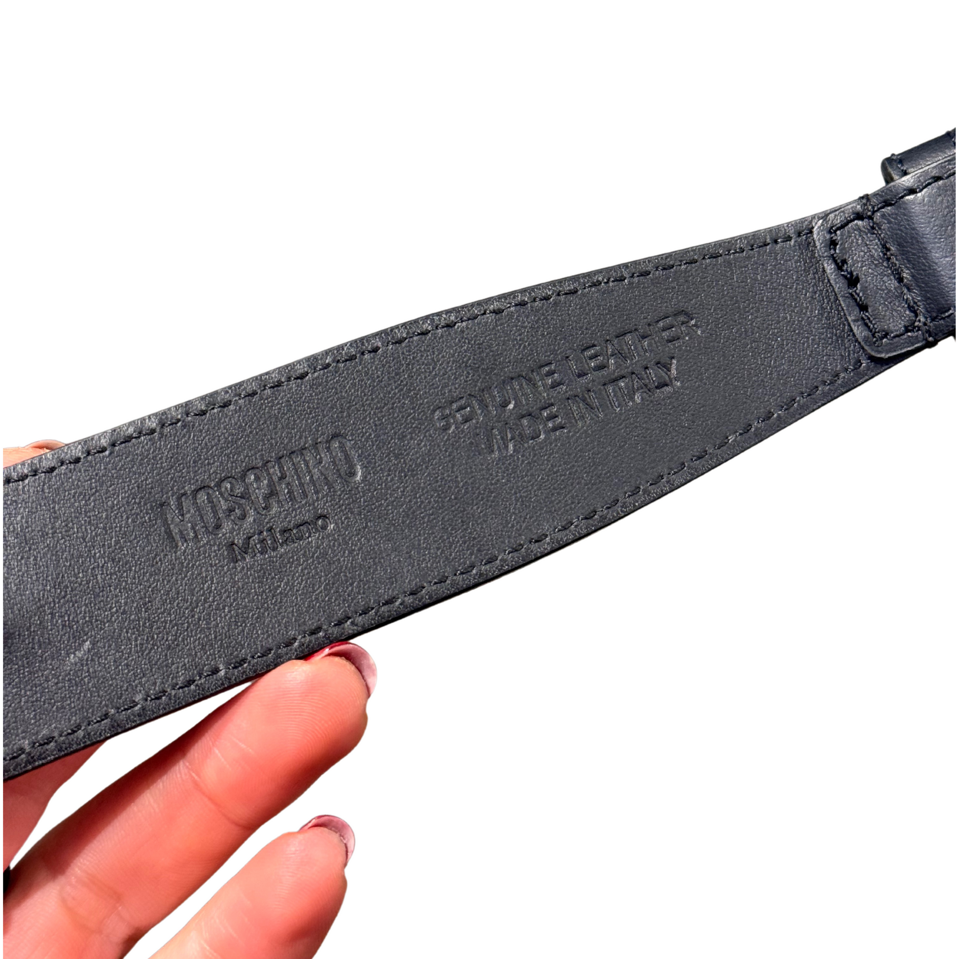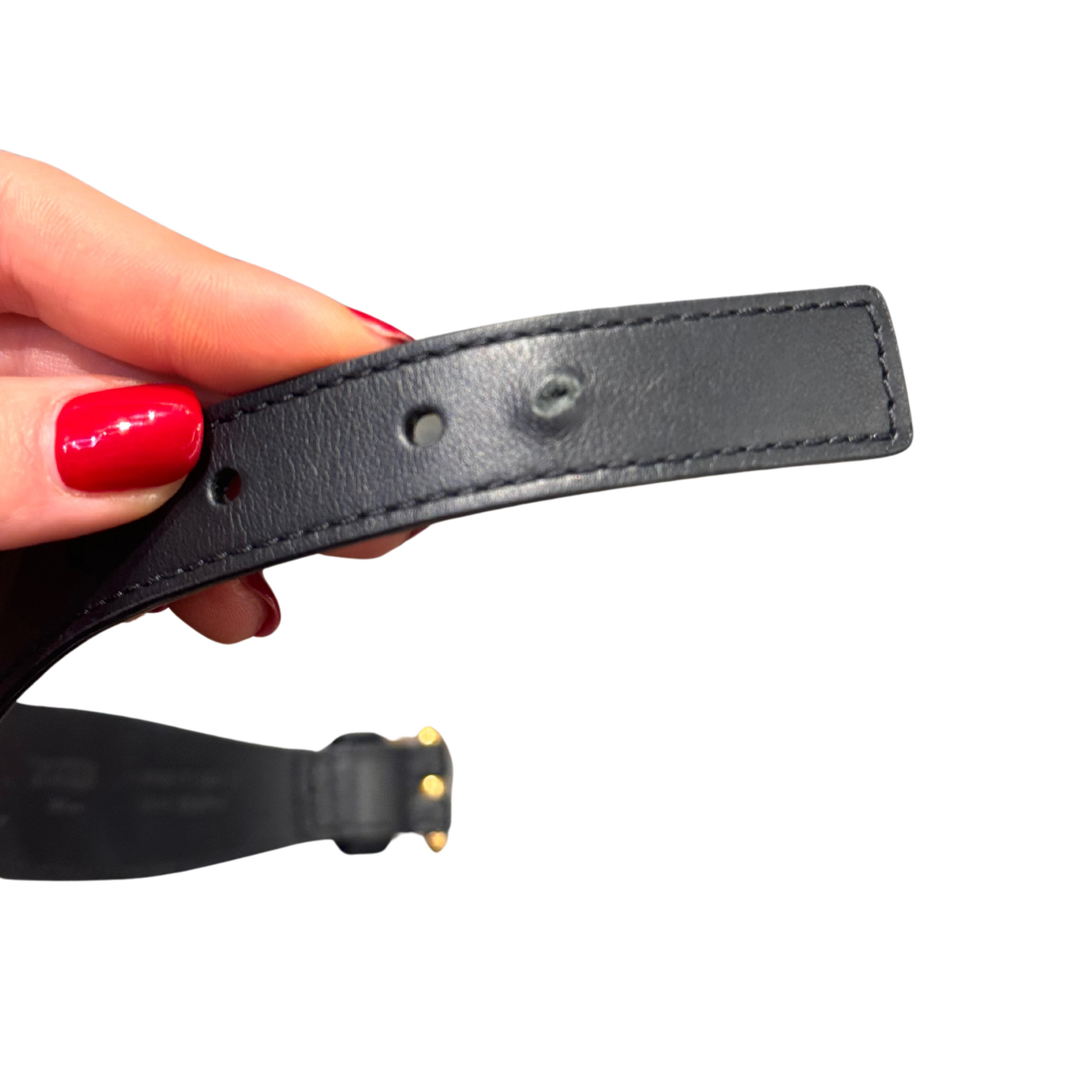 Collana / collare di Moschino realizzata in pelle di vitello liscia nera, stemma dorato frontale con logo. Fibbia in metallo dorato.