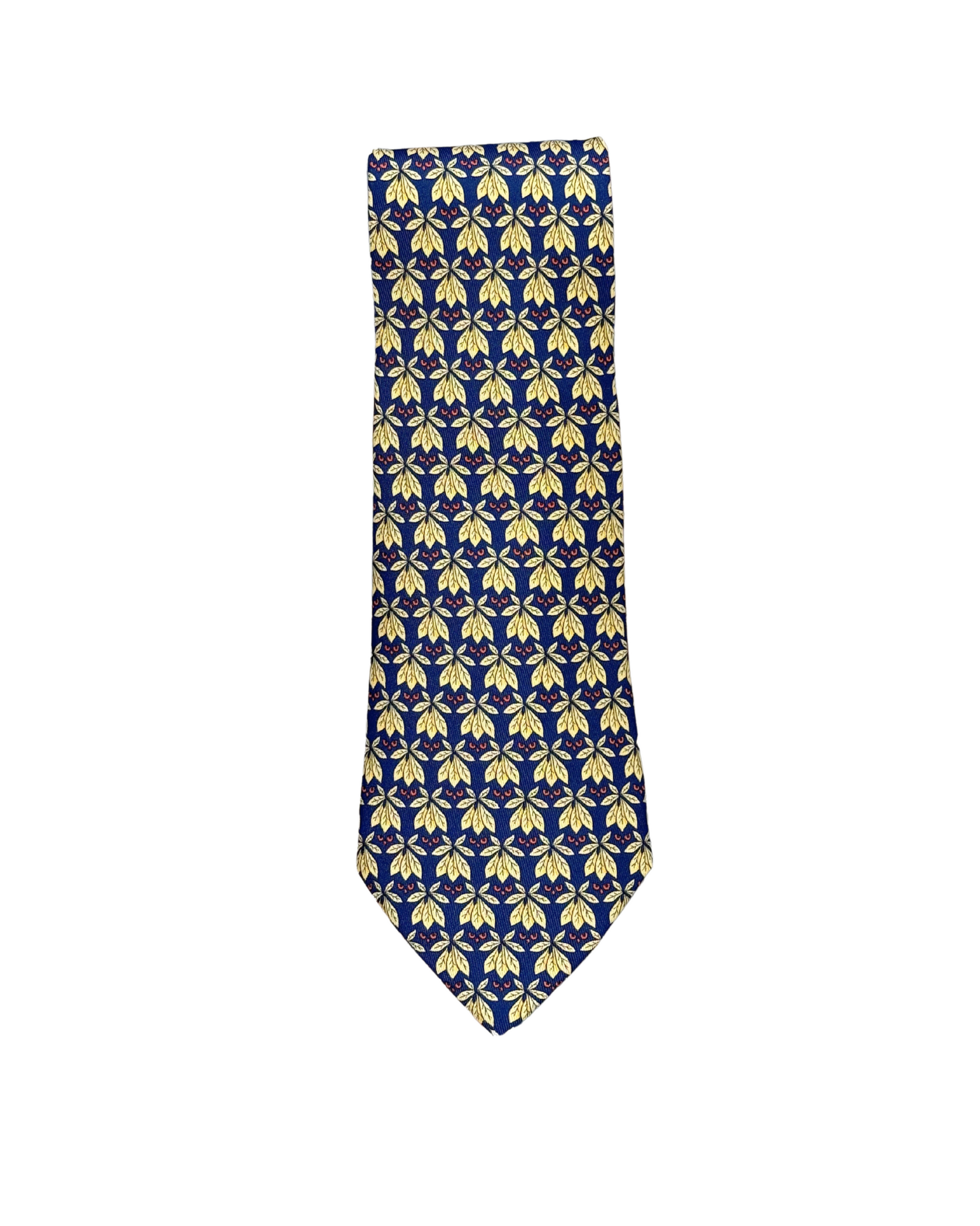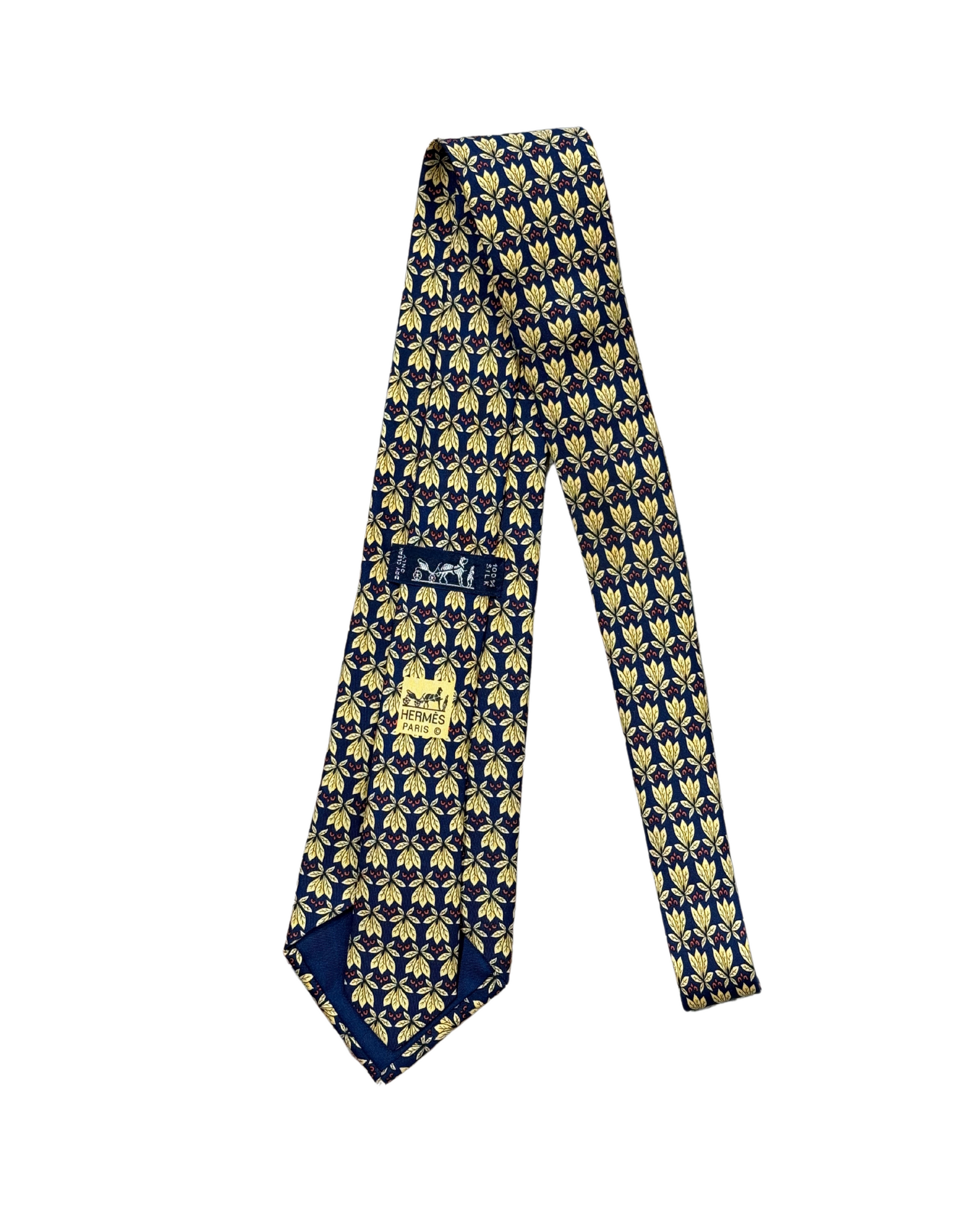 Cravatta Hermes Blu navy , motivo a foglie giallo oro che crea un contrasto raffinato. Occhietti gufo rossi che aggiungono un tocco di viviacità. 100% seta