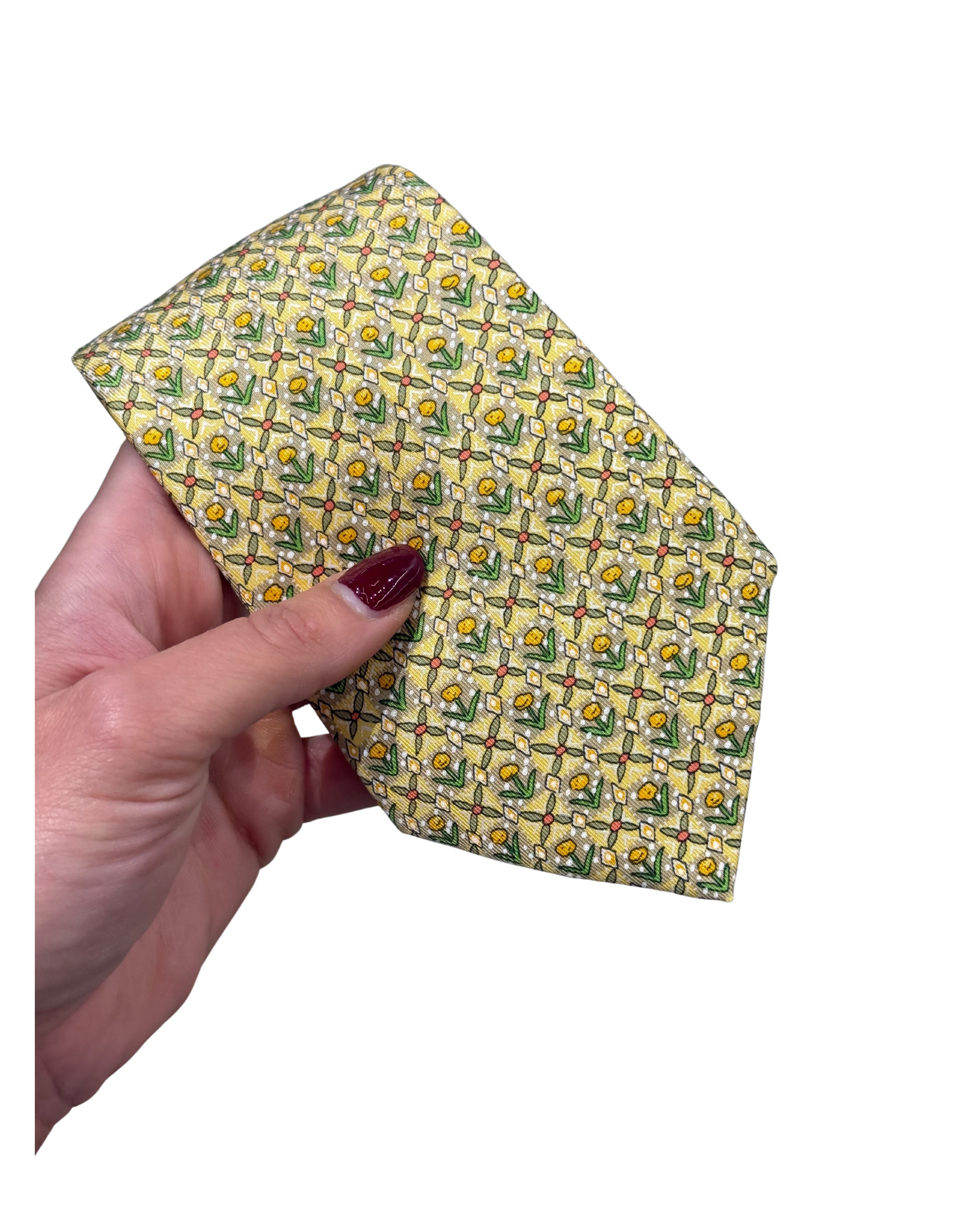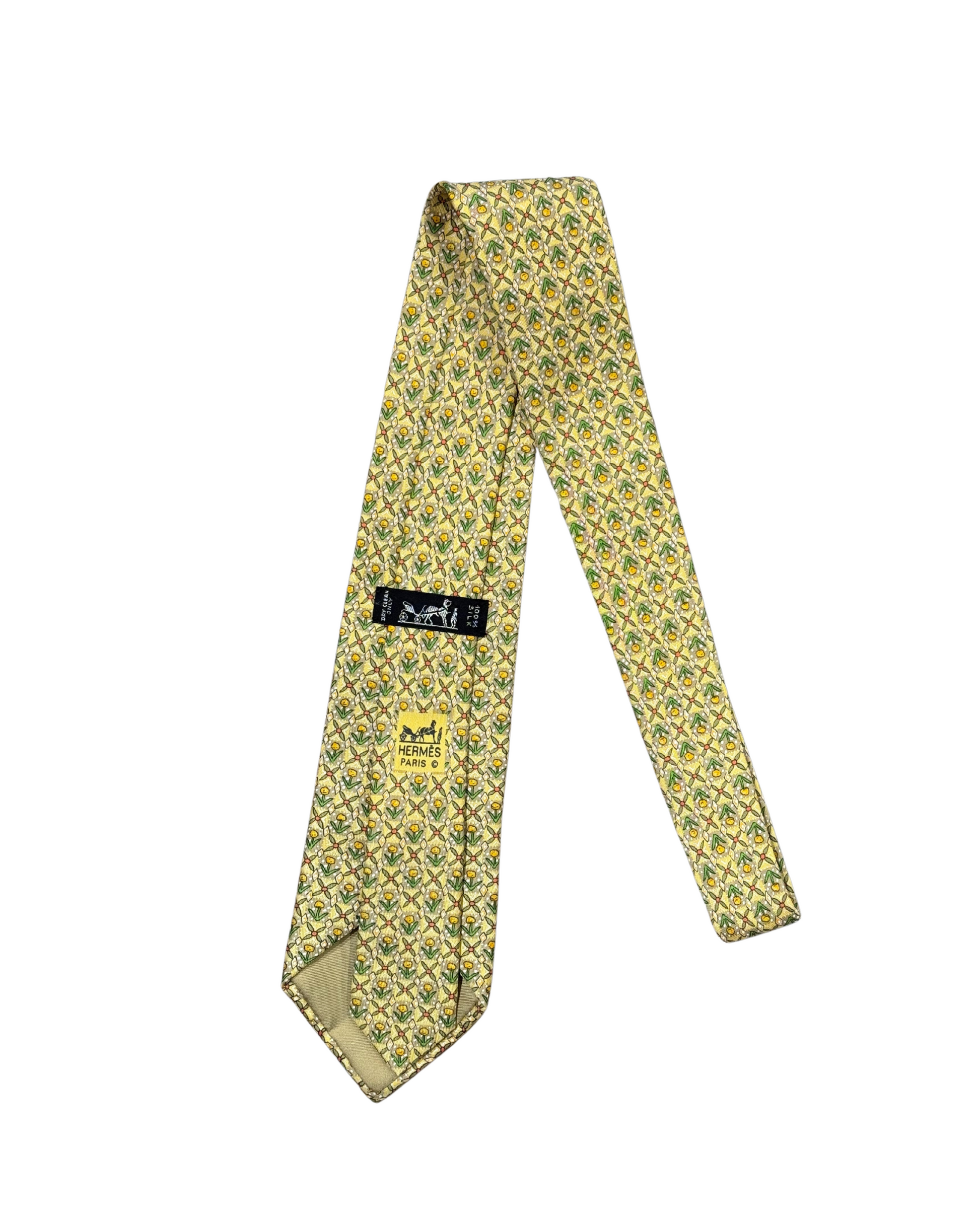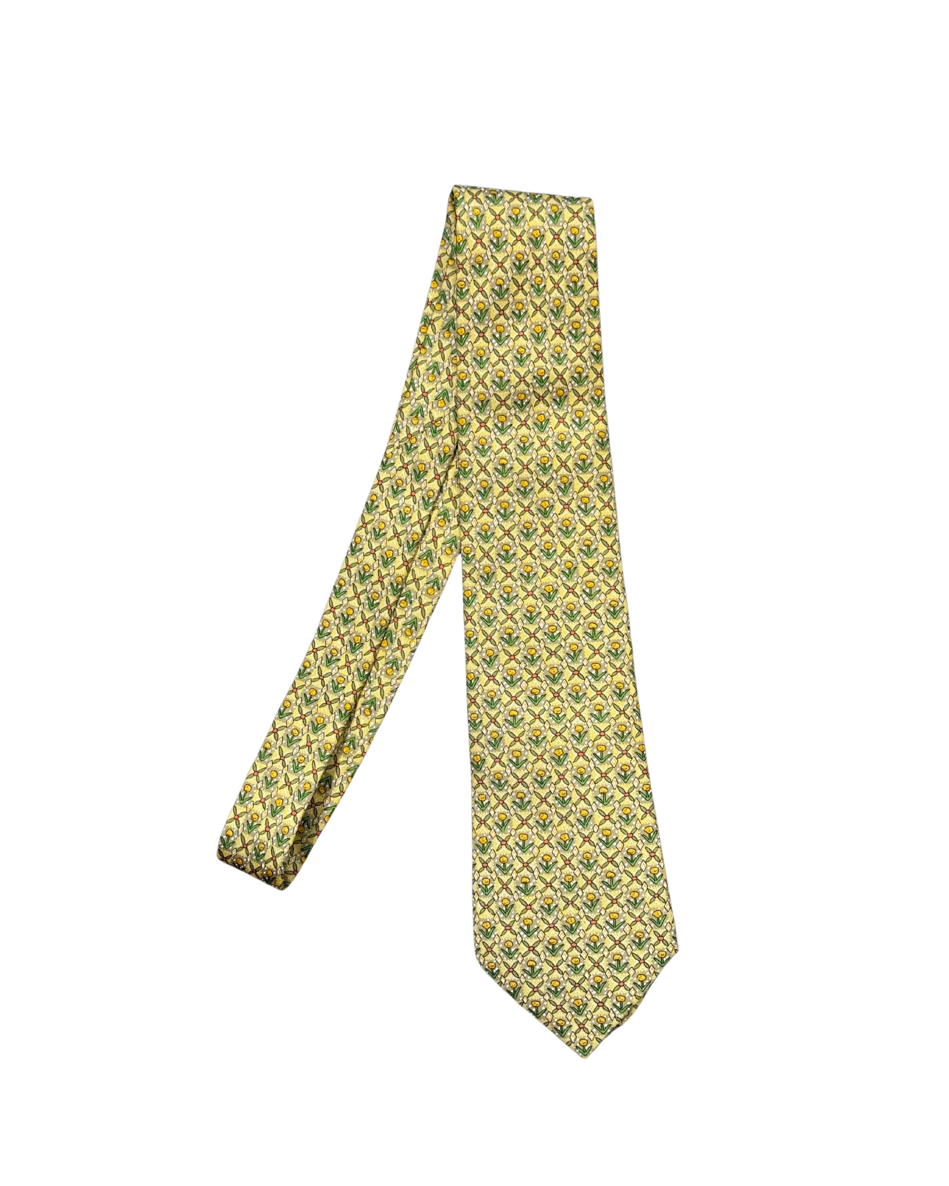 Questa Cravatta Hermes presenta una delicata tonalità gialla come base, impreziosita da un motivo geometrico floreale nei toni del verde, bianco e rosa antico che dona profondità e carattere al design. 100% seta.