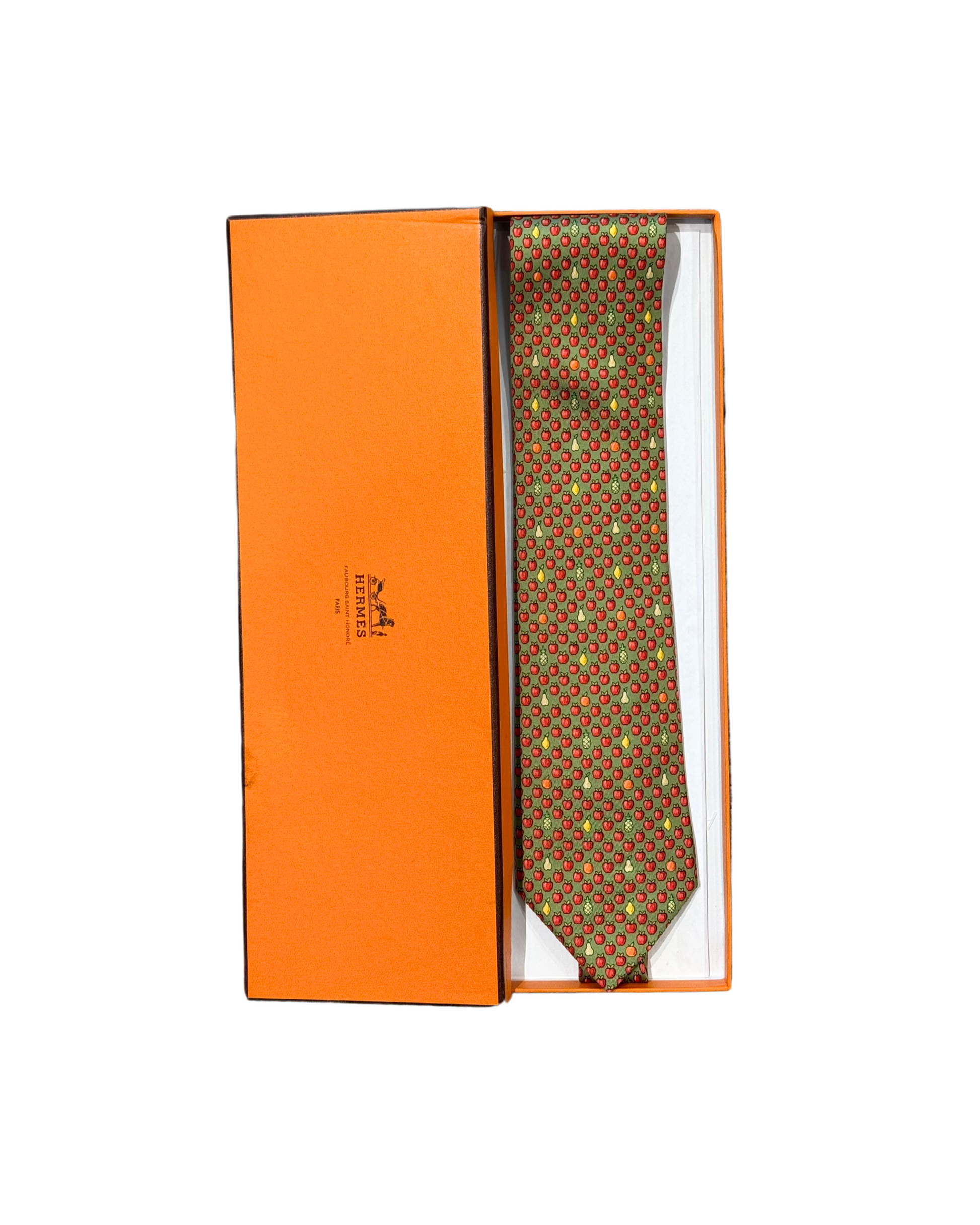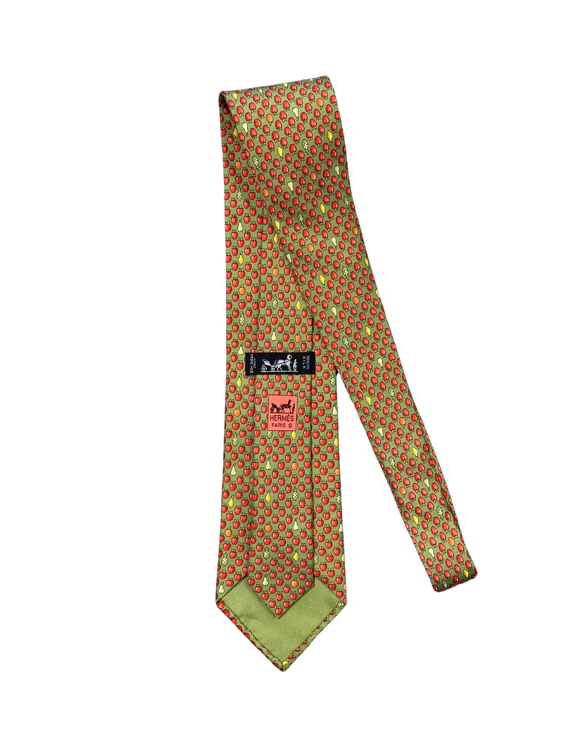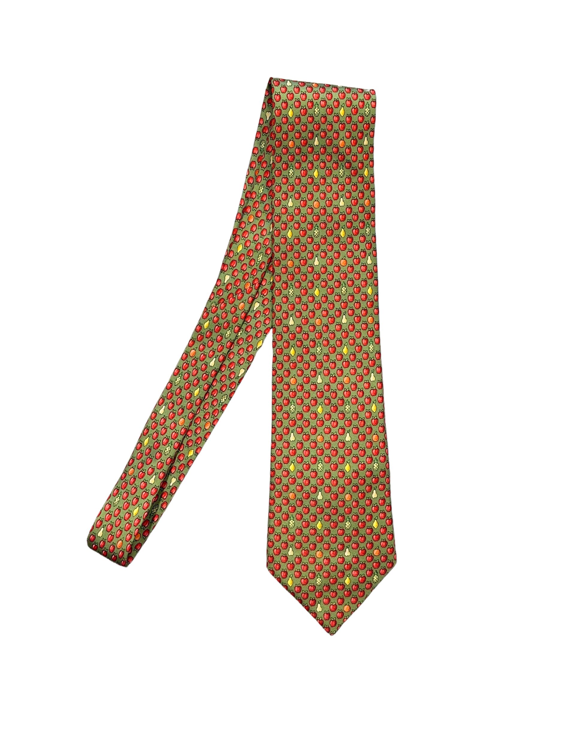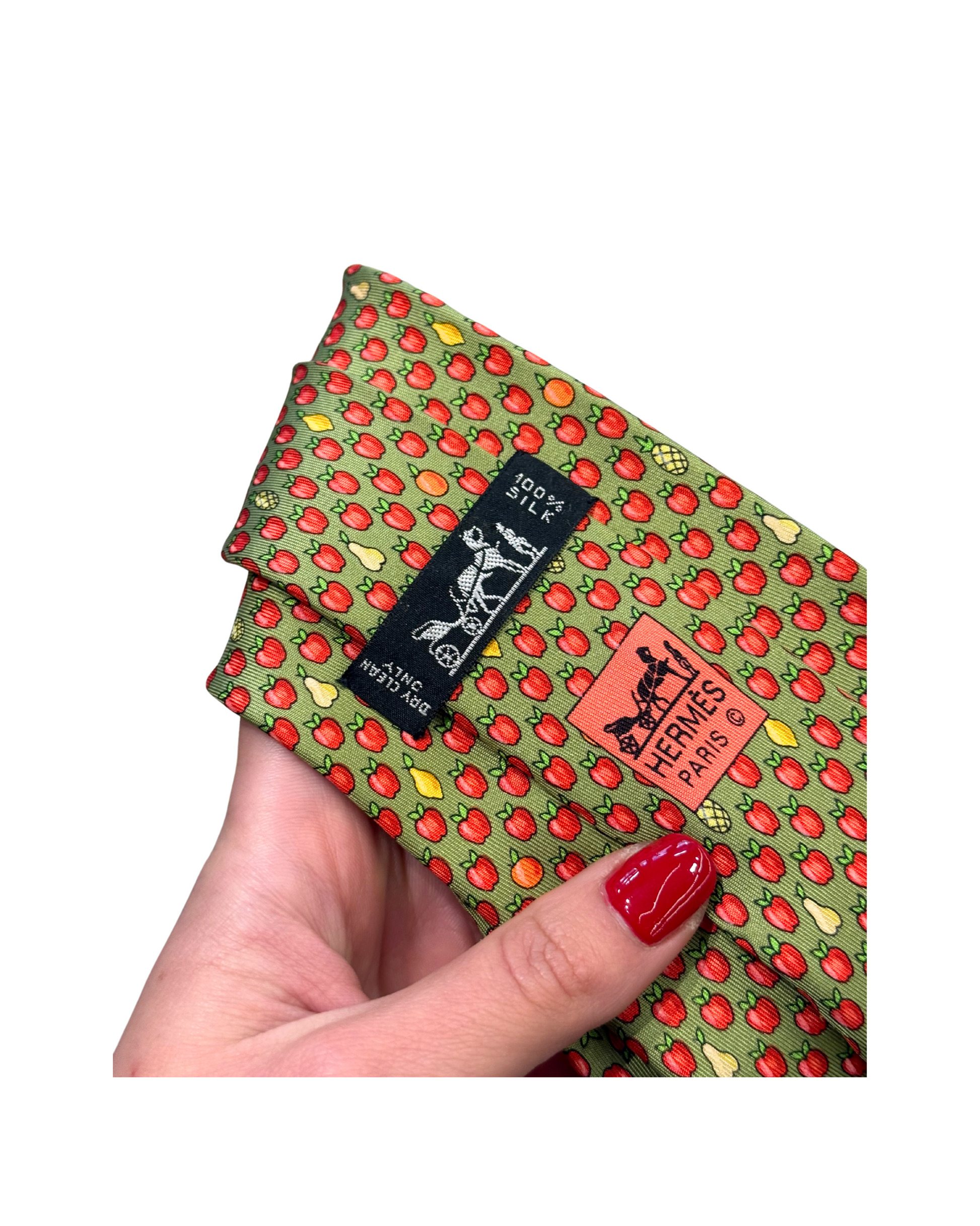Cravatta di Hermes con trama giocosa e riconoscibile della maison: un motivo a fruttini colorati, su sfondo verde chiaro. Il pattern mostra una sequenza ordinata di mele rosse, pere gialla e qualche ananas sparso , tutti stilizzati. 100% seta