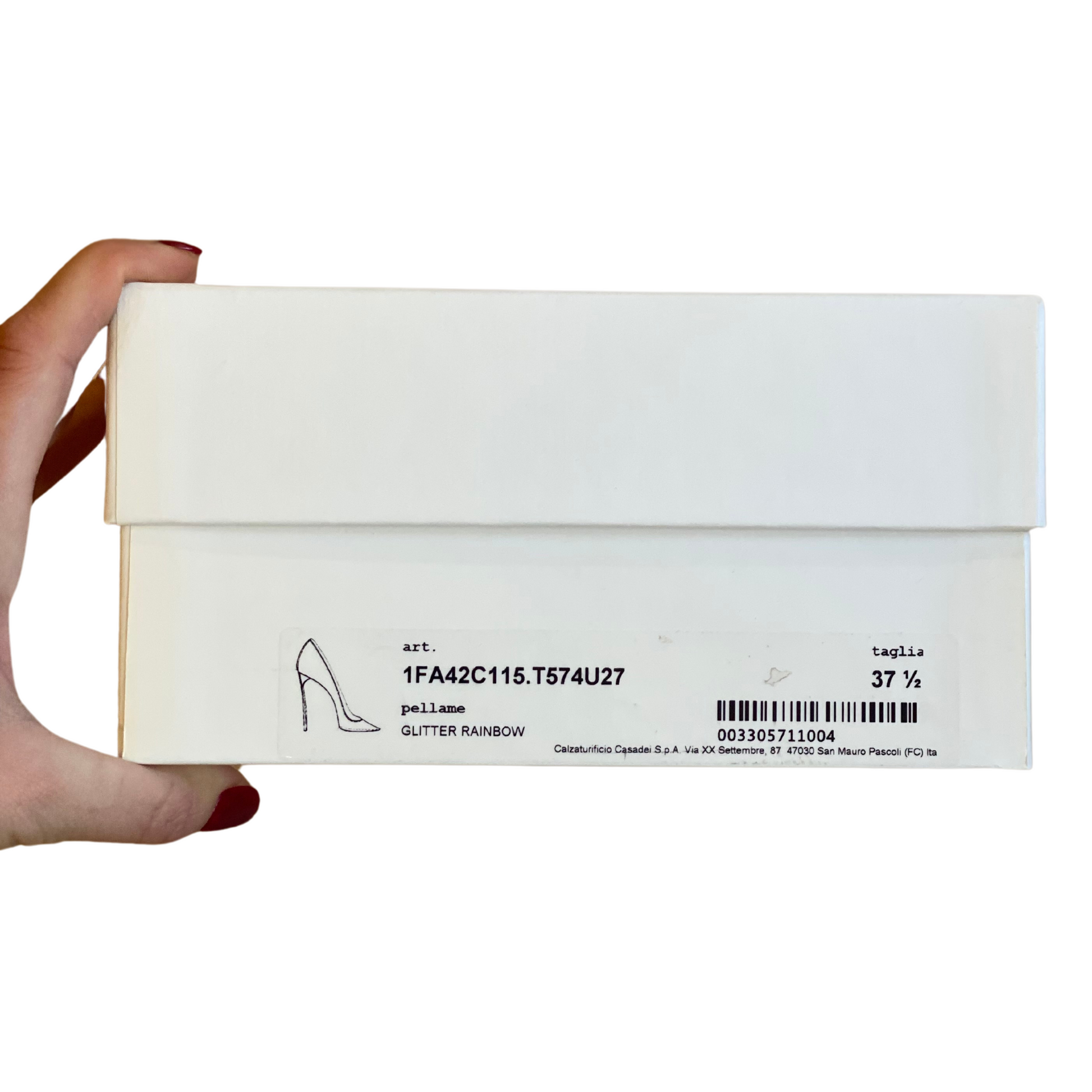 Decollete a punta glitterate firmate Casadei. Tacco lucido sottile 12cm . Interno in pelle e suola in cuoio.