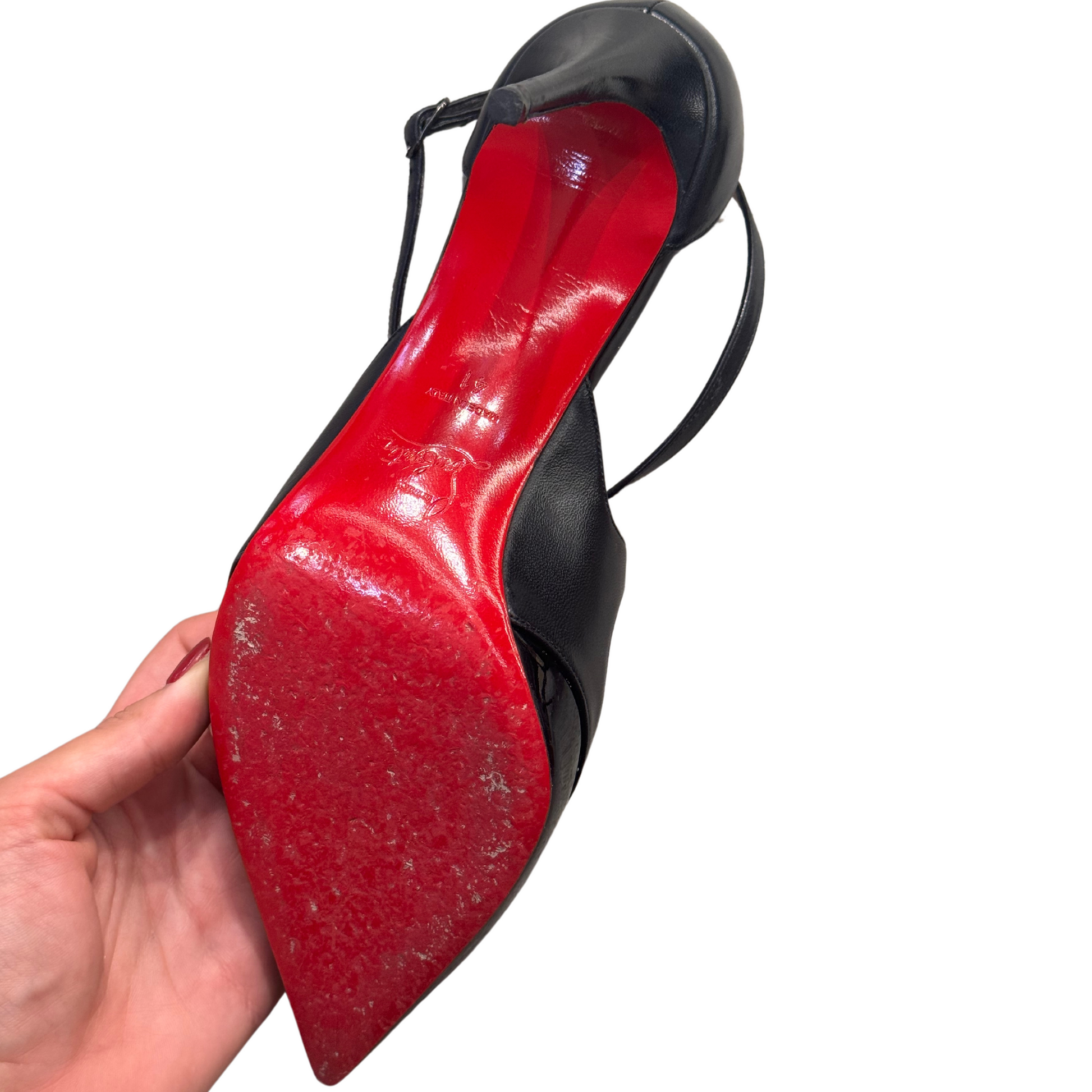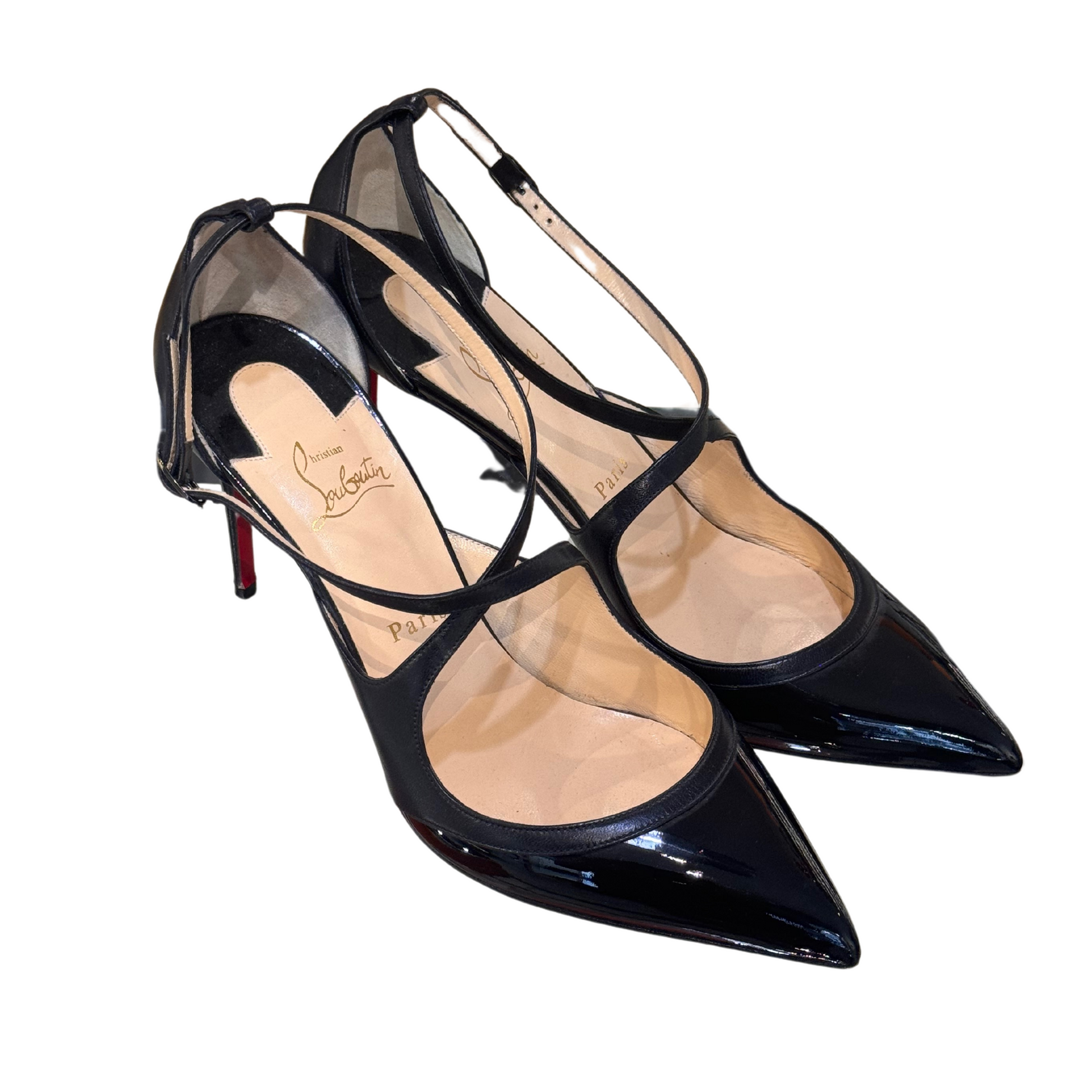 Bellissime décolleté di Louboutin , punta in pelle nera verniciata e rifiniture in pelle liscia . Intreccio frontale e allacciatura sulla caviglia con fibbia. Interno in pelle e suola iconica laccata rossa. Tacco sottile 9cm.