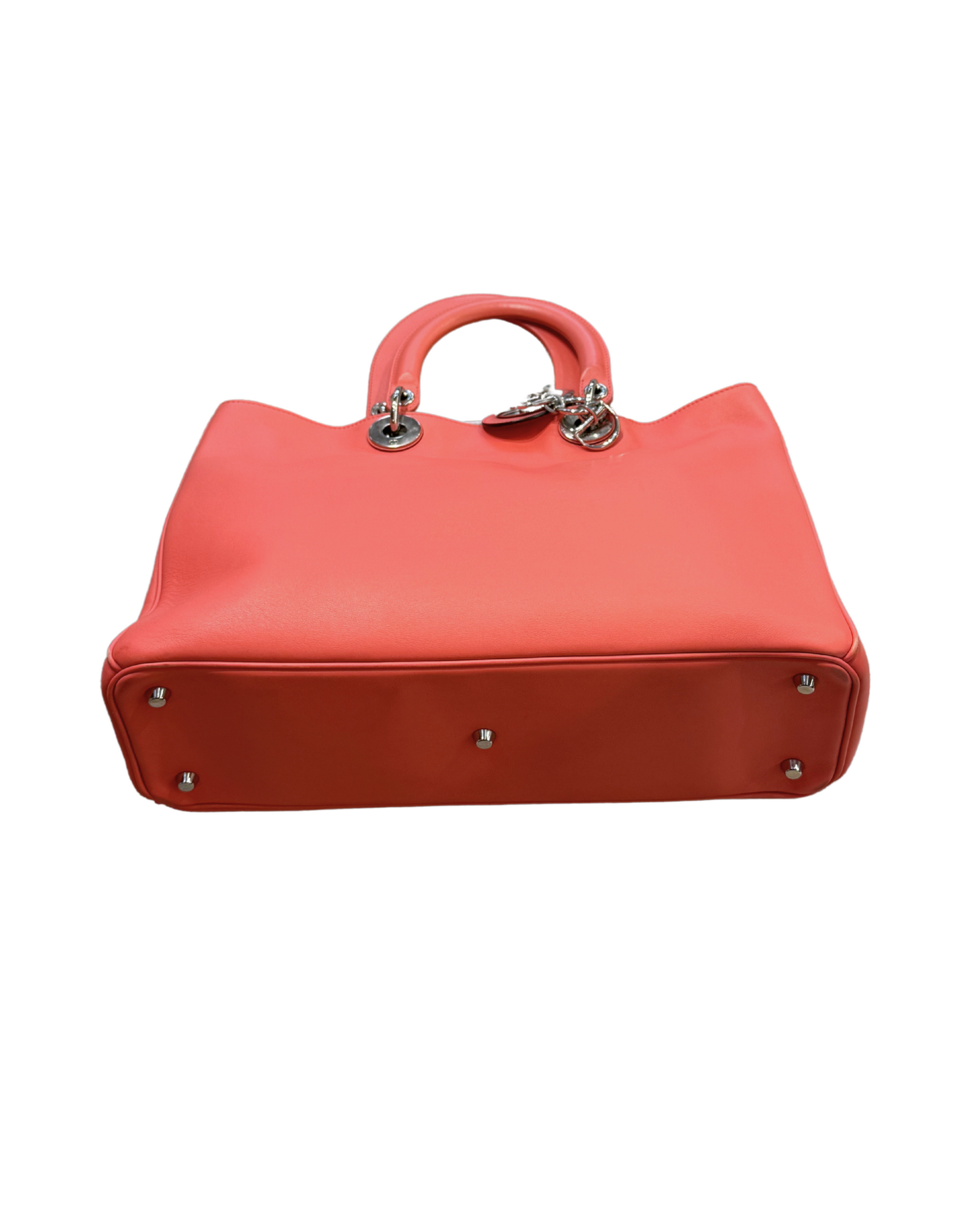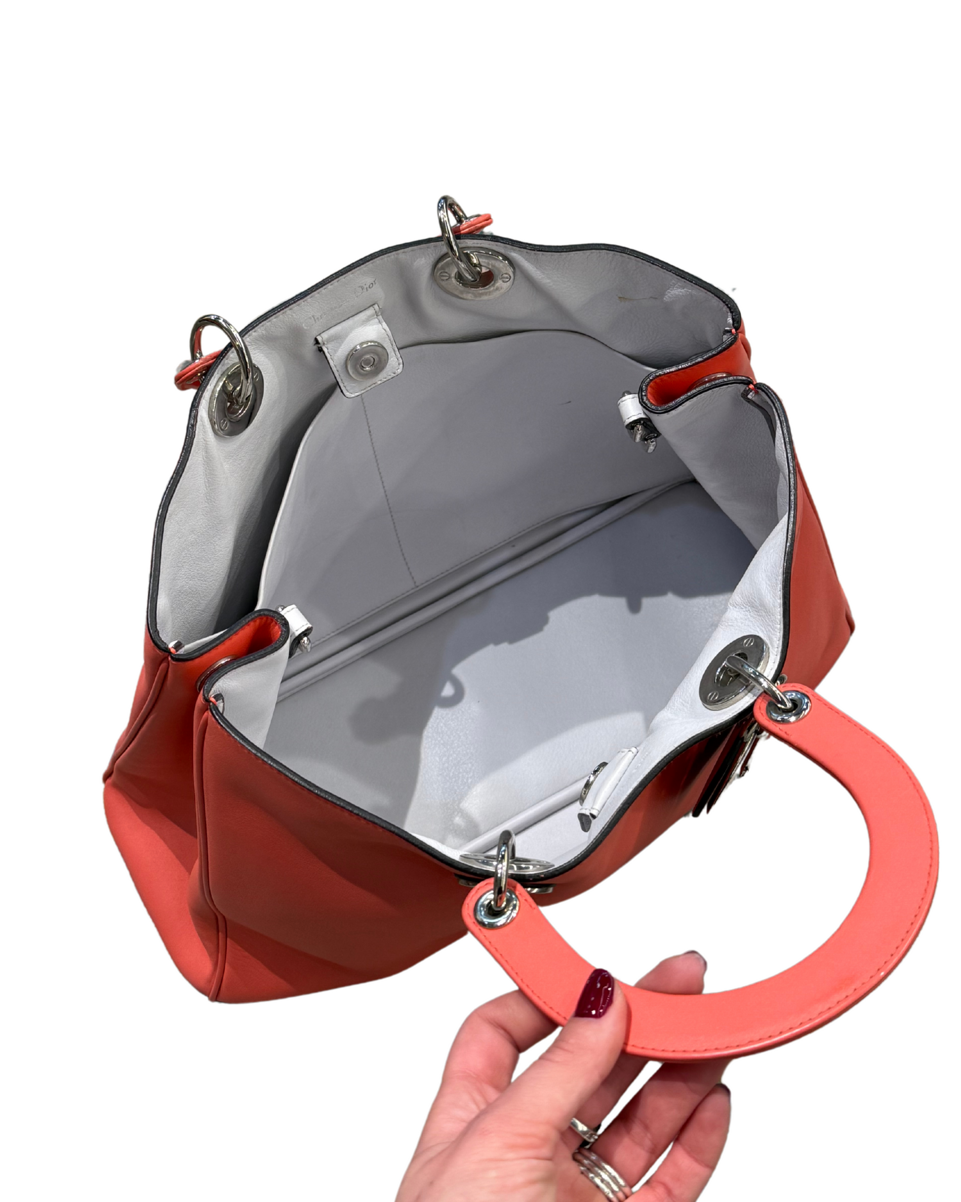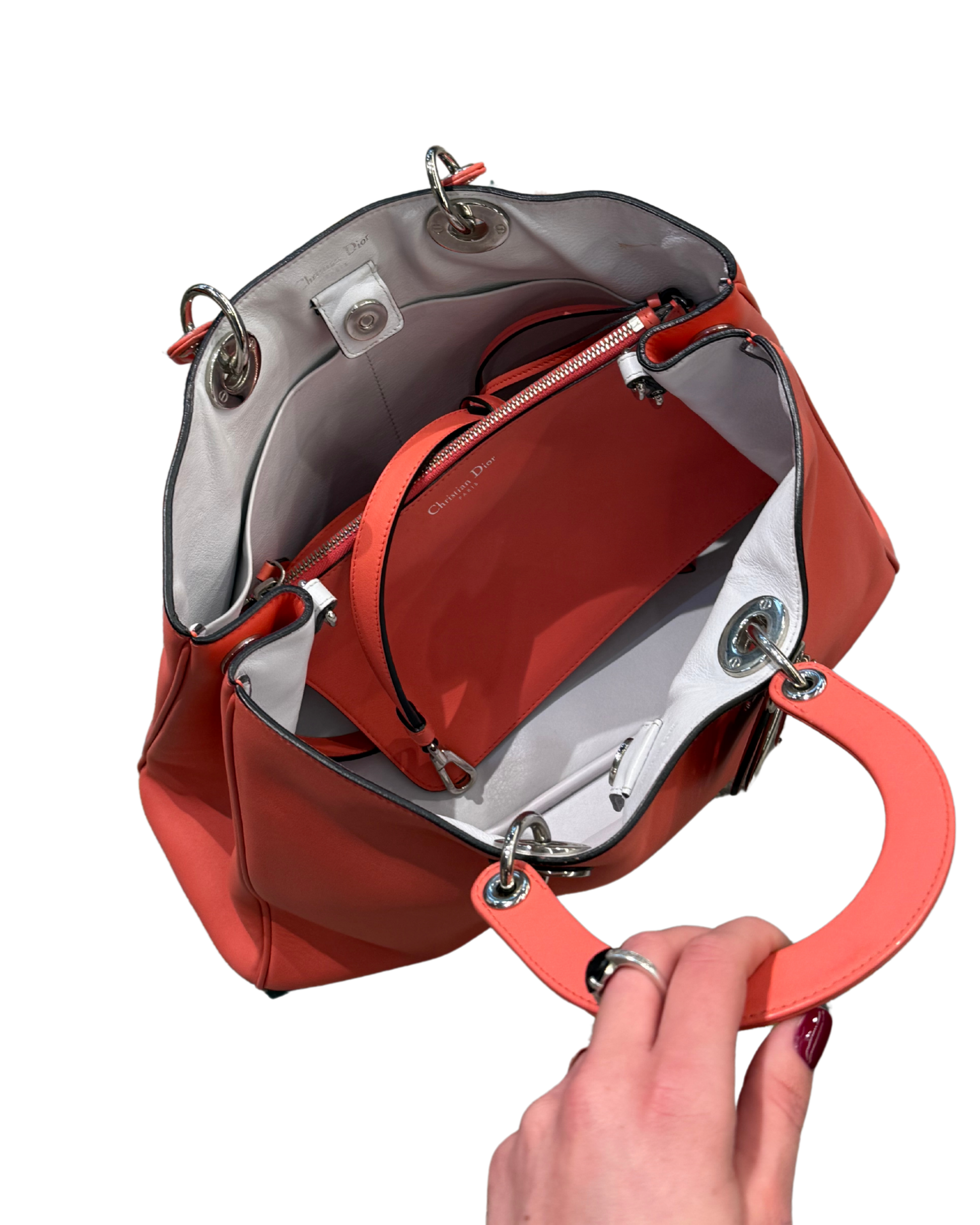 Borsa di Dior realizzata in pelle di vitello liscia color salmone . Iconico Ciondolo in metallo argentato D.I.O.R. Doppi manici rigidi superiori e tracolla in pelle amovibile. Interno in pelle bianca, ed è presente anche la bustina interna color salmone.