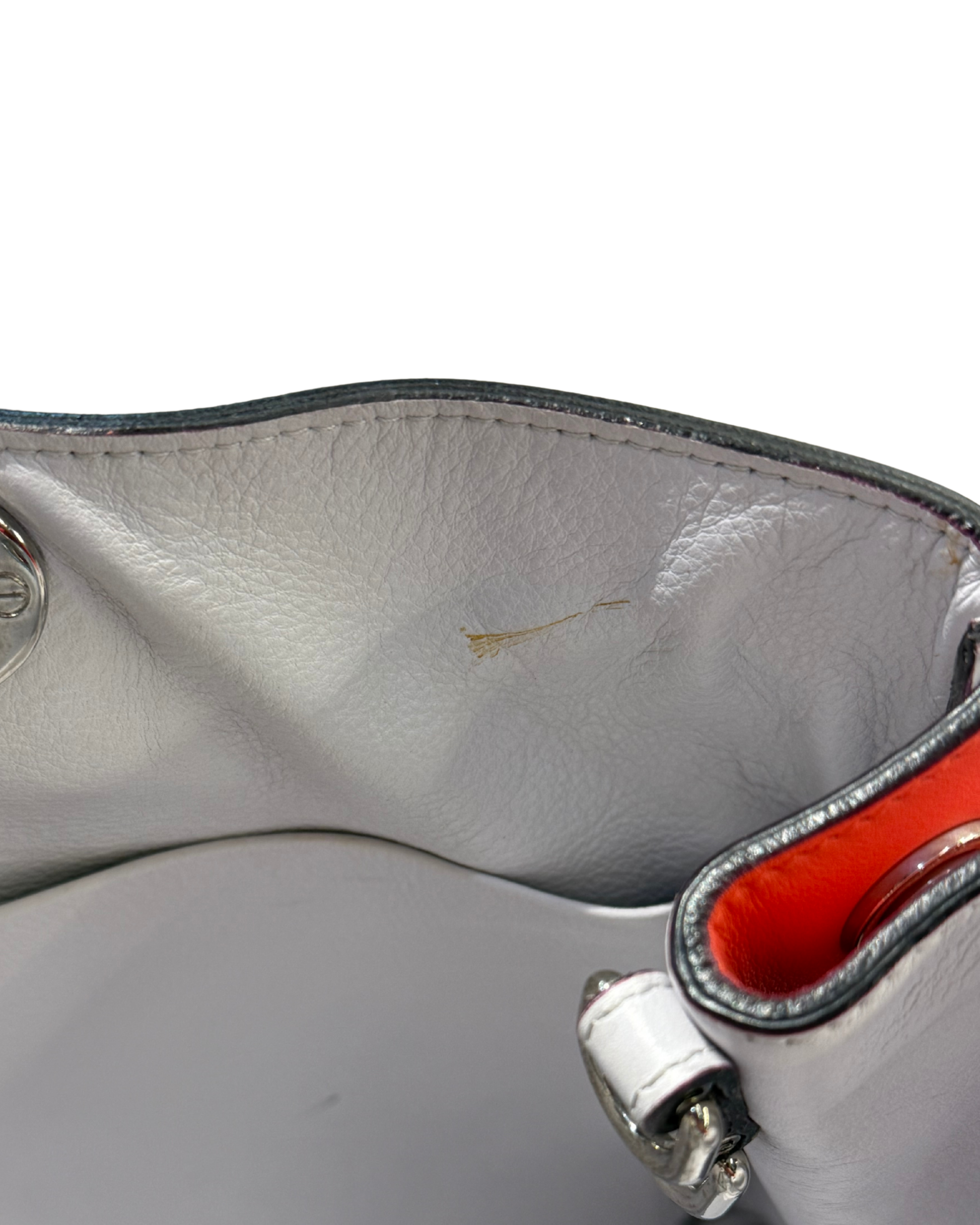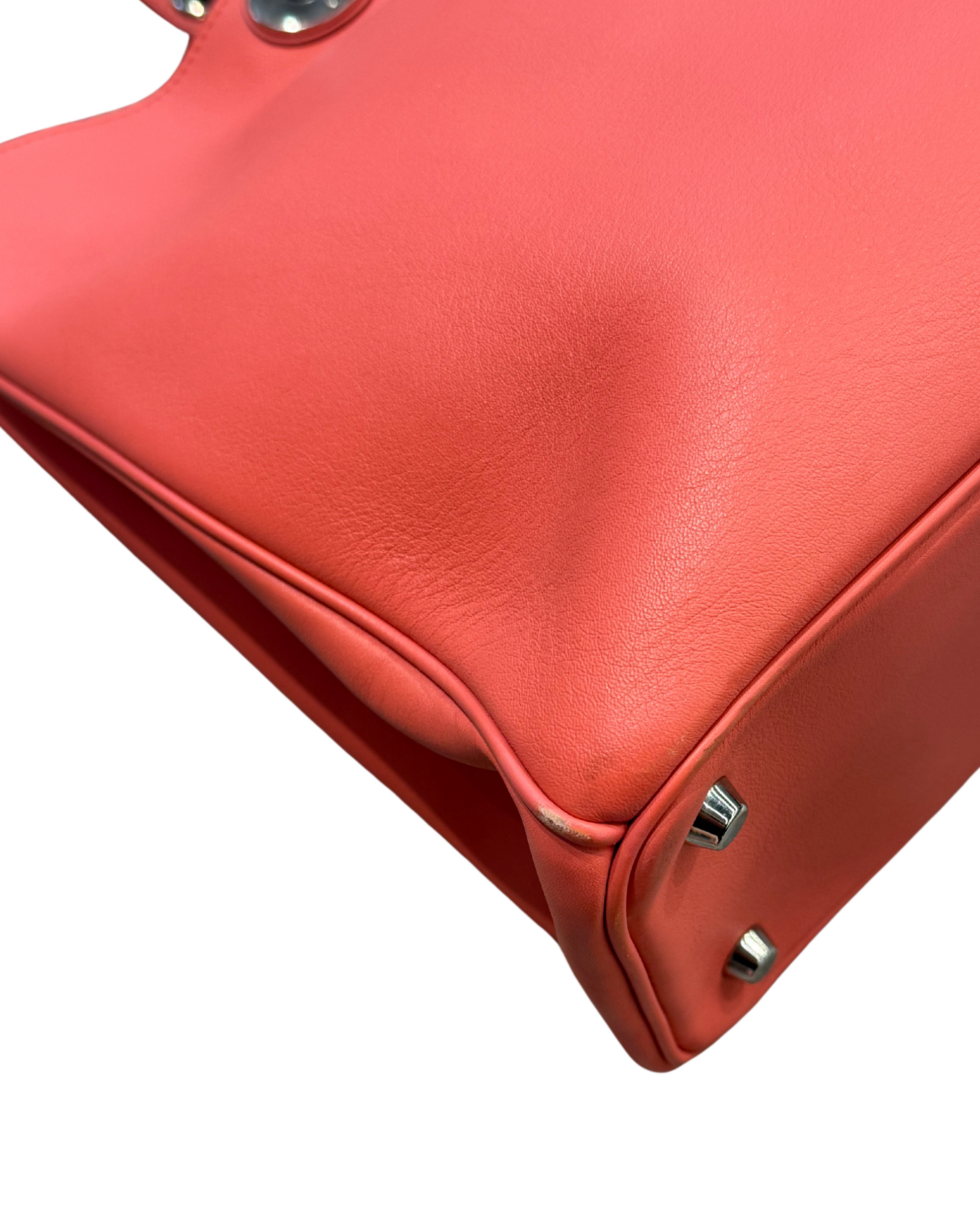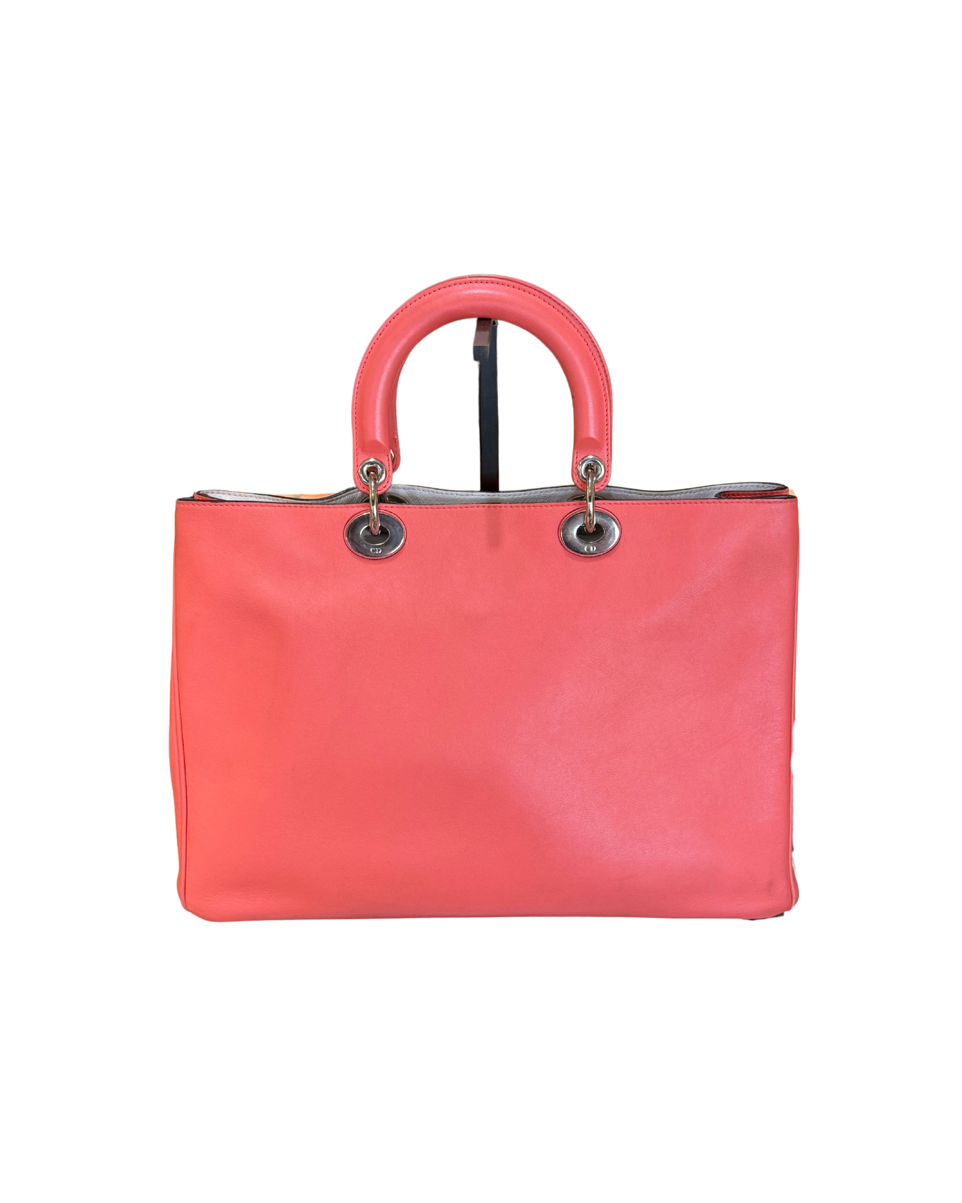 Borsa di Dior realizzata in pelle di vitello liscia color salmone . Iconico Ciondolo in metallo argentato D.I.O.R. Doppi manici rigidi superiori e tracolla in pelle amovibile. Interno in pelle bianca, ed è presente anche la bustina interna color salmone.