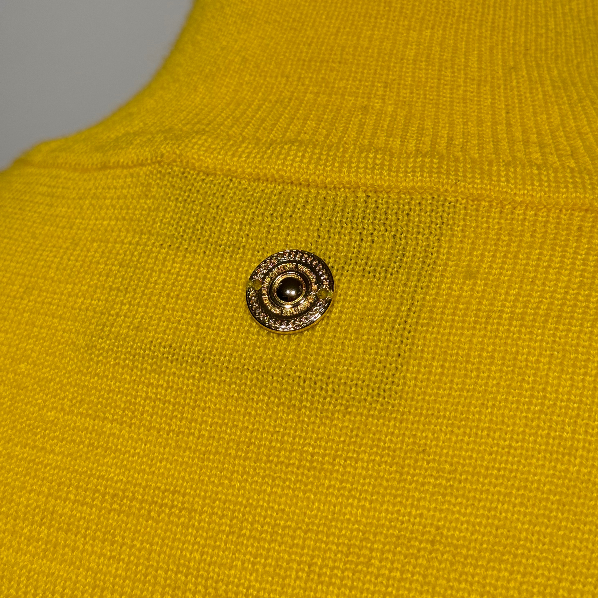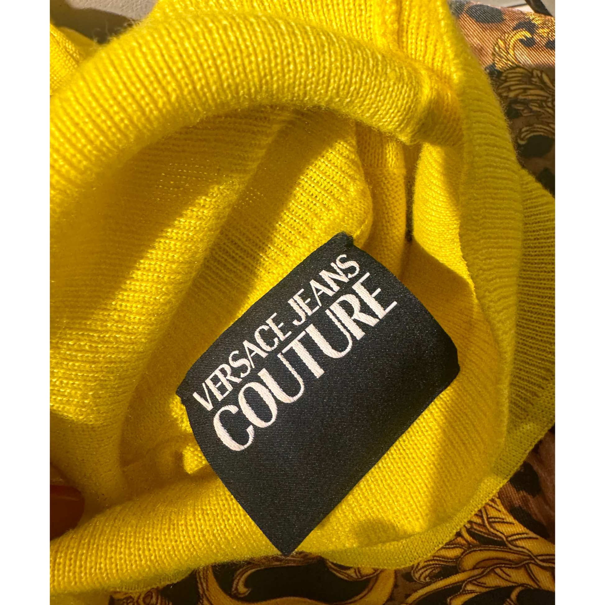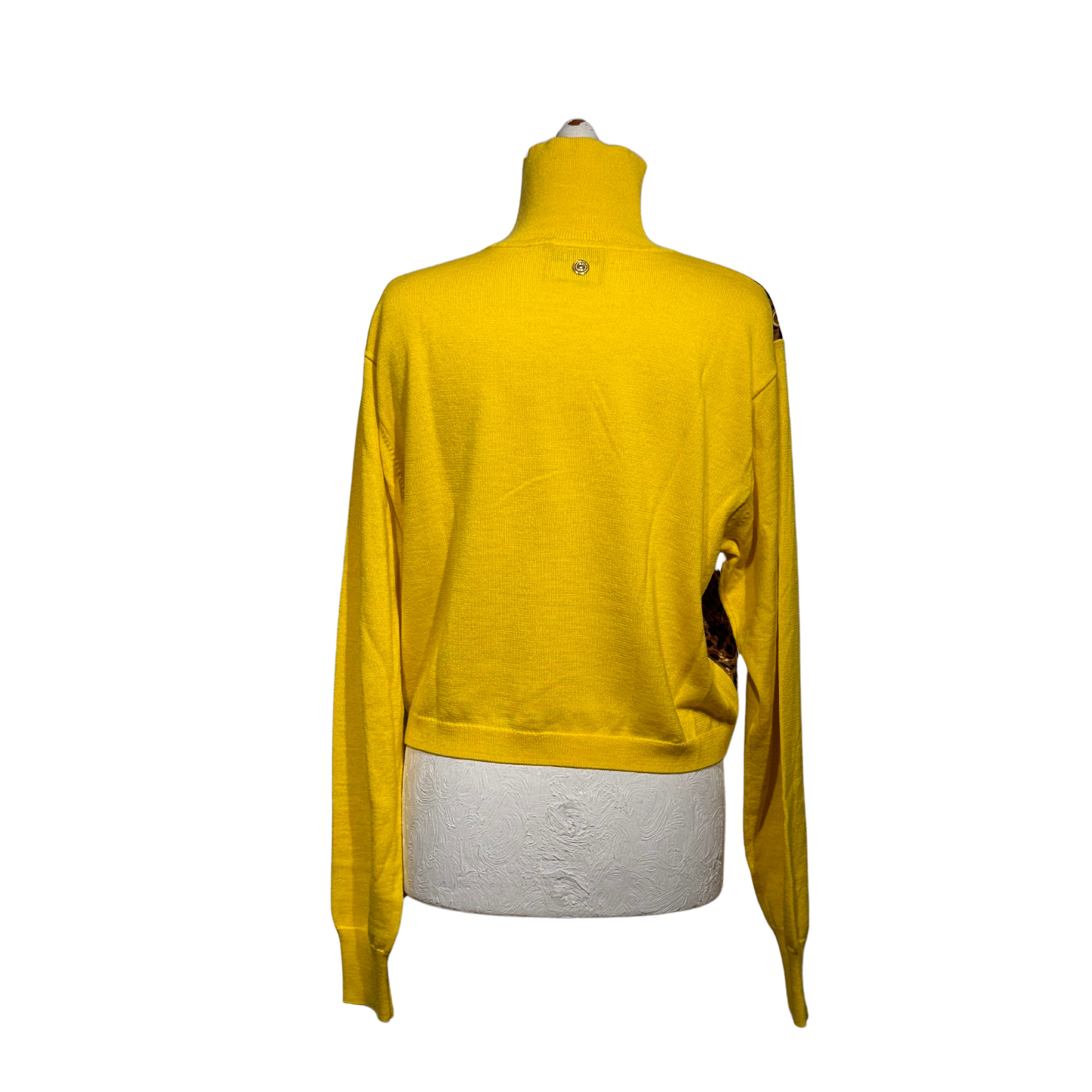 Dolcevita Versace, maniche e collo giallo e parte frontale iconica trama Versace, animalier, nera e oro.