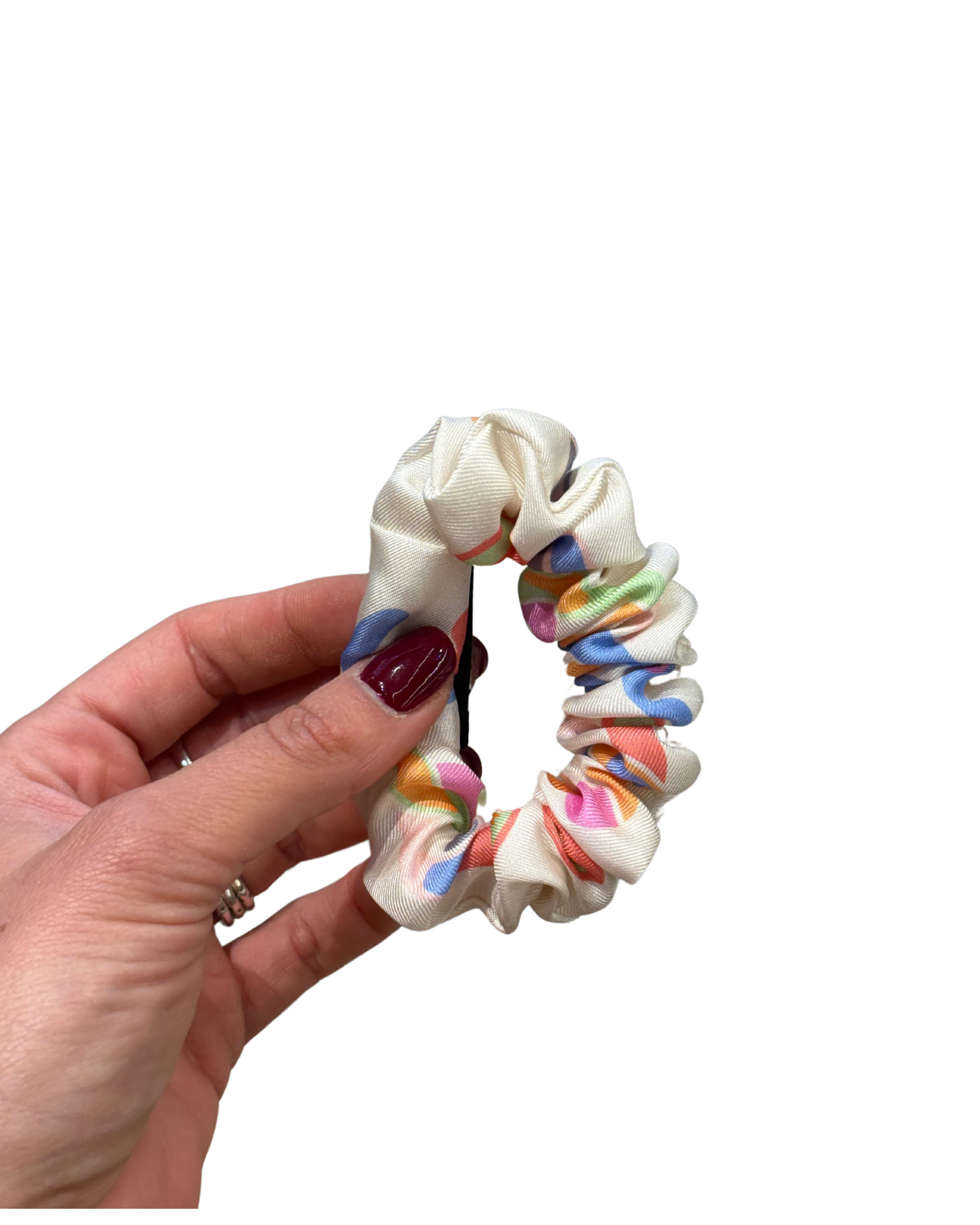 Questo elastico per capelli Chanel è un accessorio raffinato e di tendenza, perfetto per aggiungere un tocco chic anche alle acconciature più semplici. La base in seta color avorio è decorata con una fantasia multicolore astratta e vivace, con tonalità pastello e dettagli aranciati, verdi , lilla, rosa e blu. 100% seta