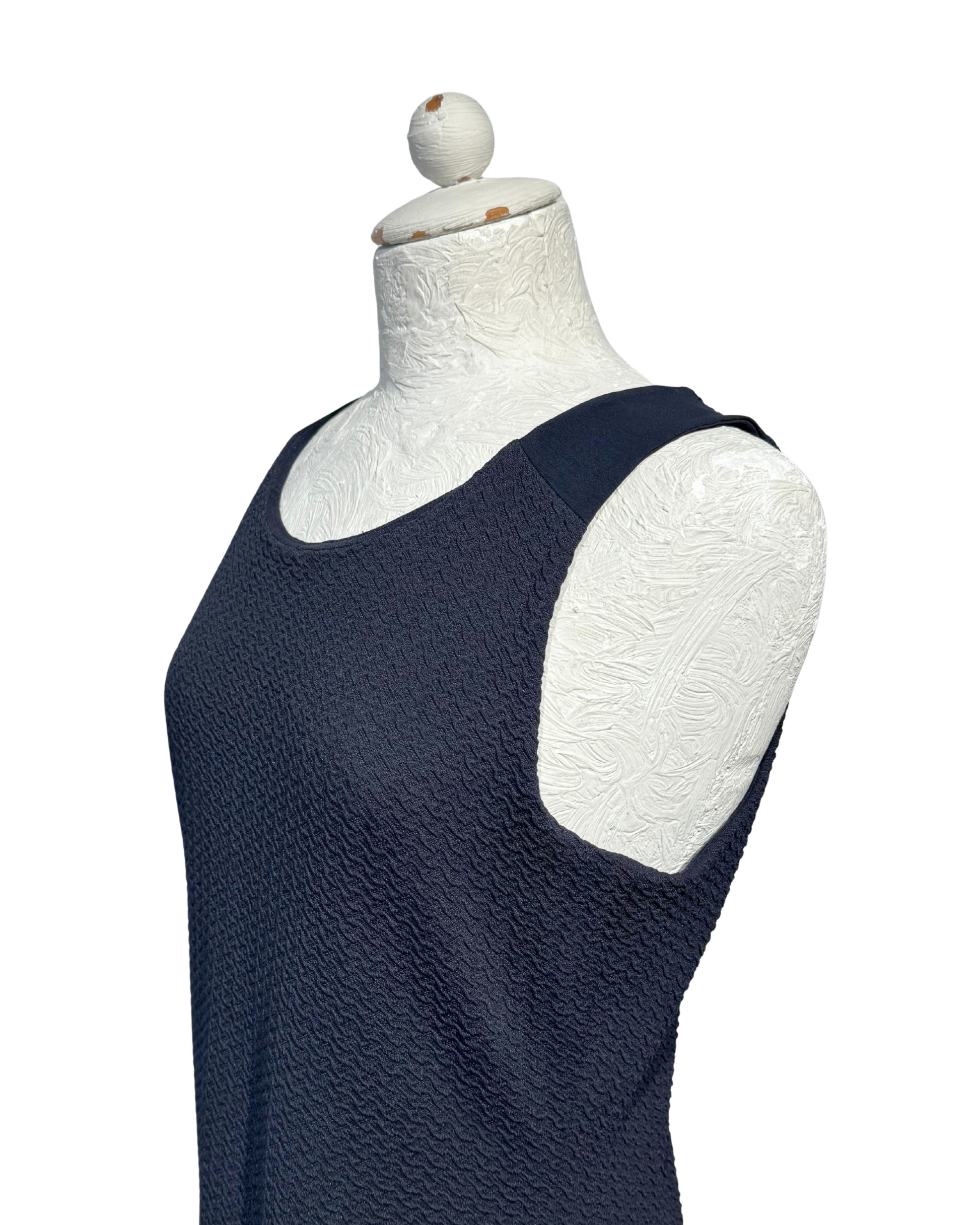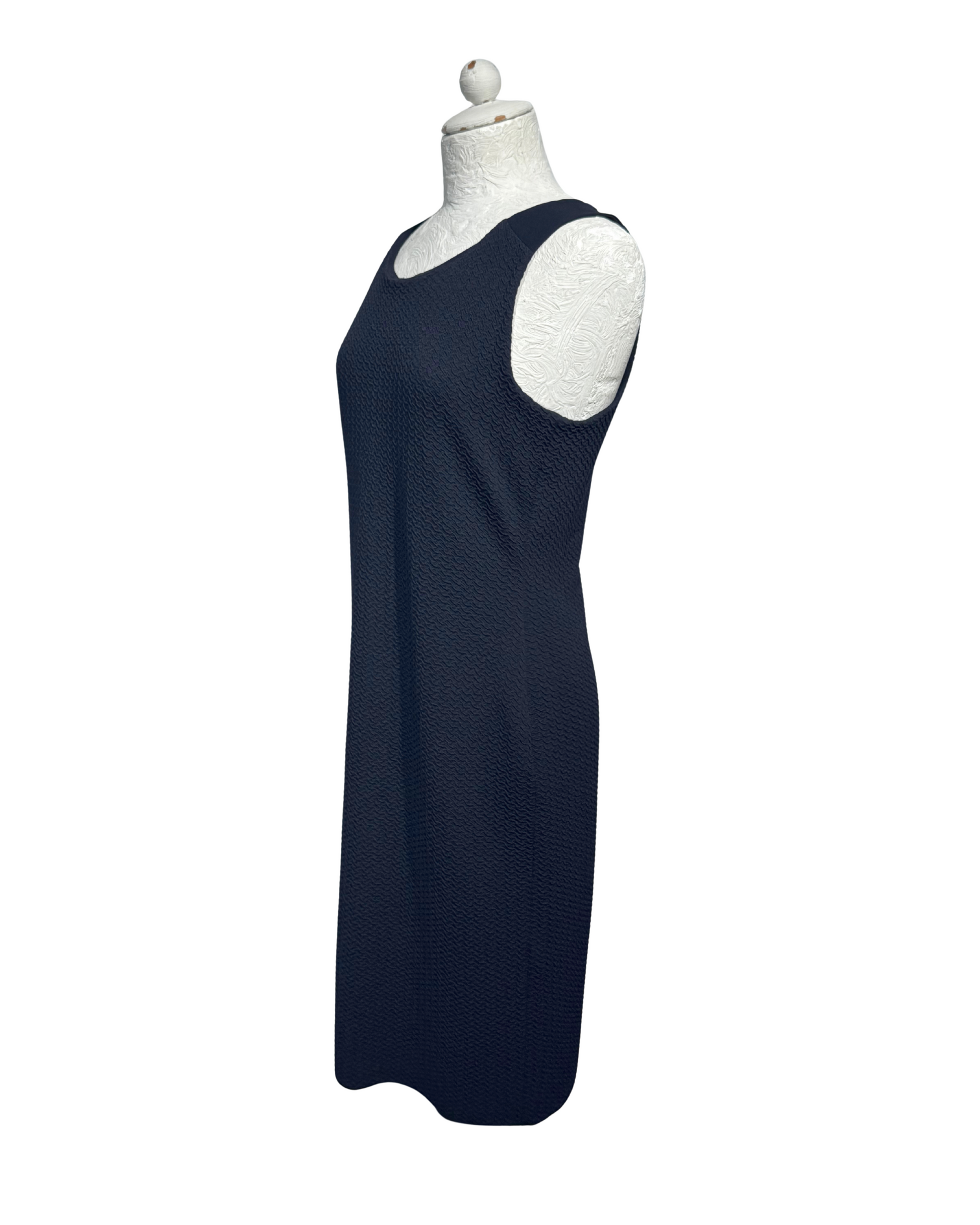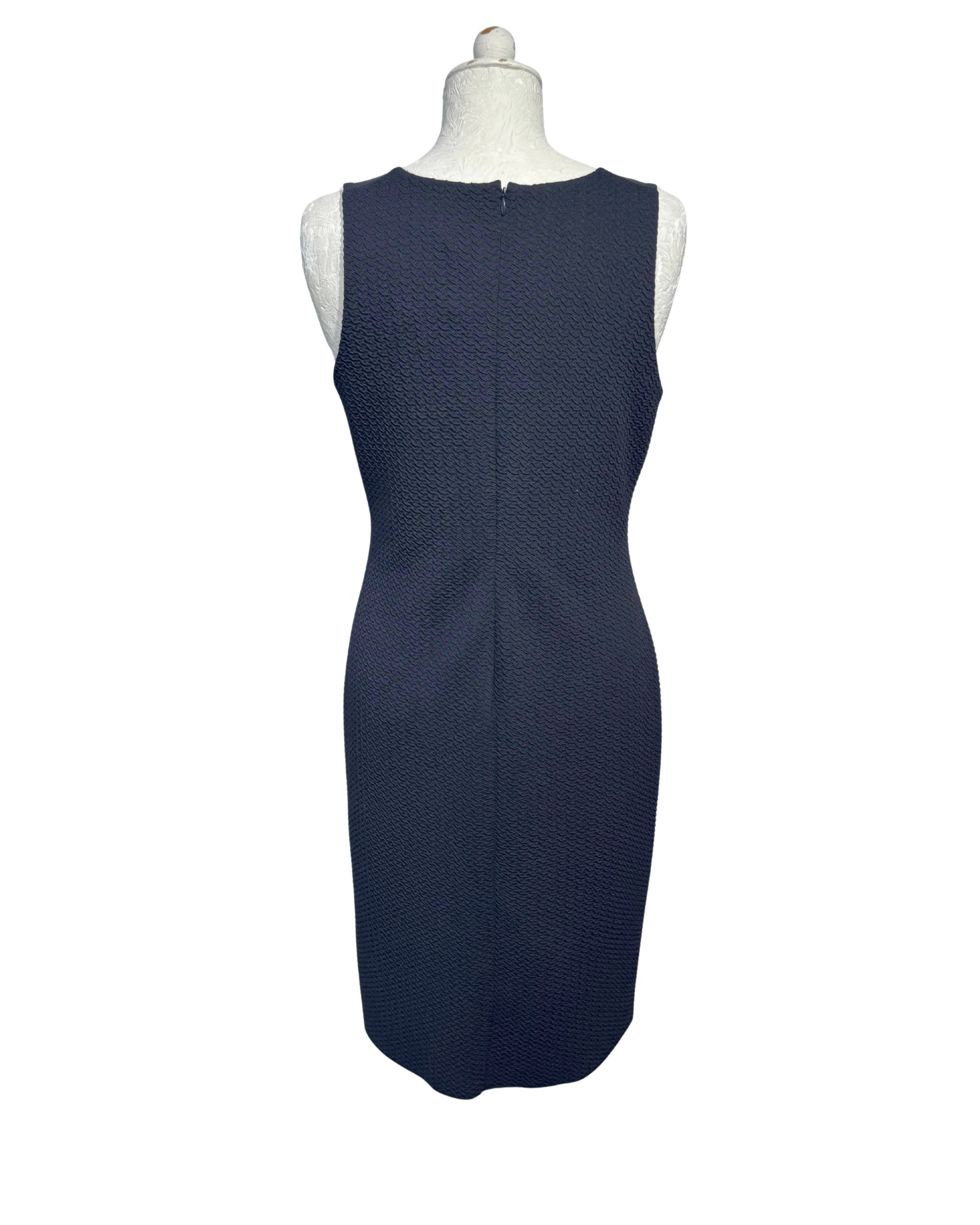 Abito Emporio Armani in tessuto blu scuro con lavorazione jacquard a rilievo, che crea una trama ondulata elegante e raffinata. La linea dritta e lo scollo rotondo valorizzano la figura con sobrietà, mentre la zip posteriore invisibile assicura una chiusura discreta. Realizzato in un mix di poliestere, viscosa ed elastan, offre comfort e ottima vestibilità. Perfetto da indossare con blazer e tacchi per un look formale, oppure con accessori luminosi per la sera.