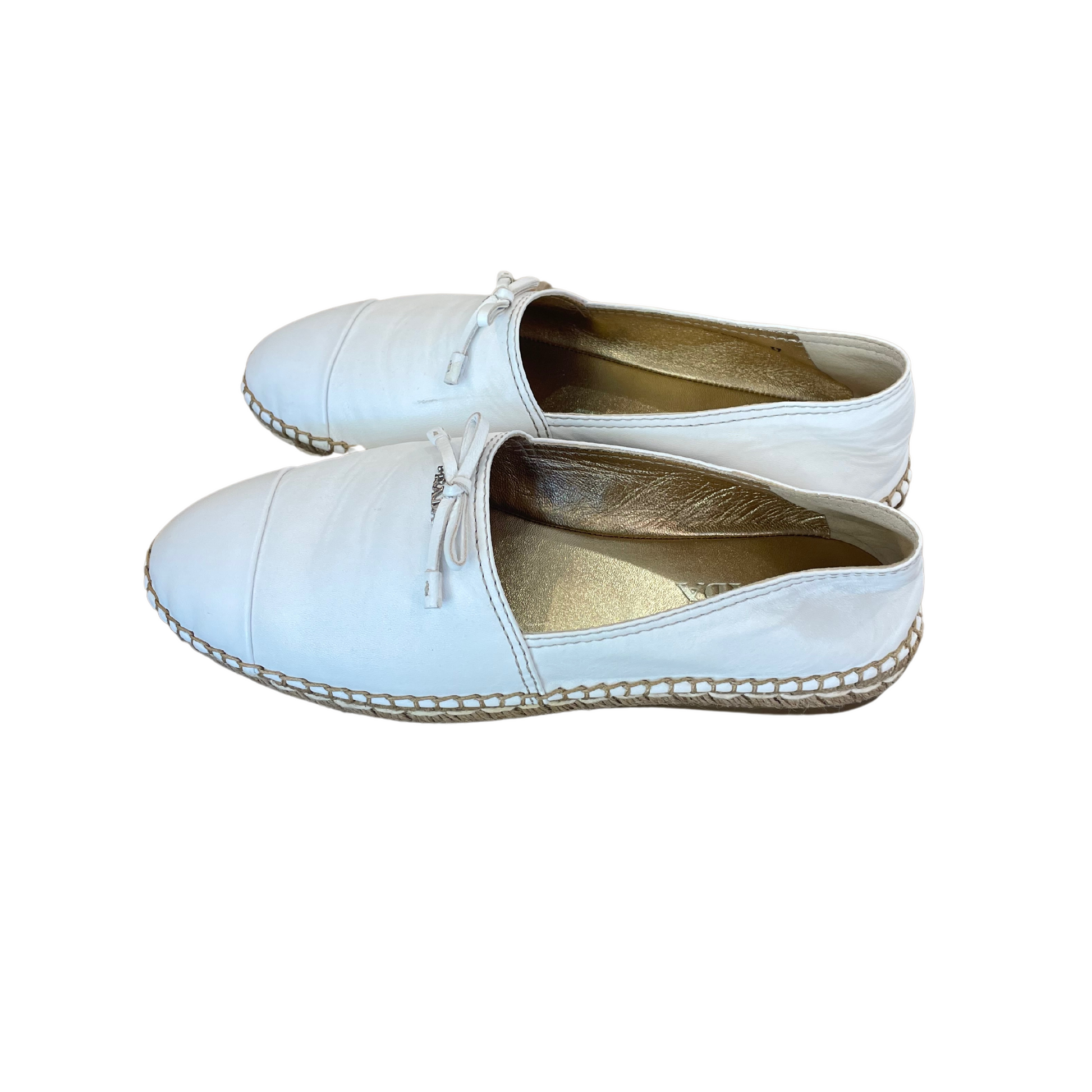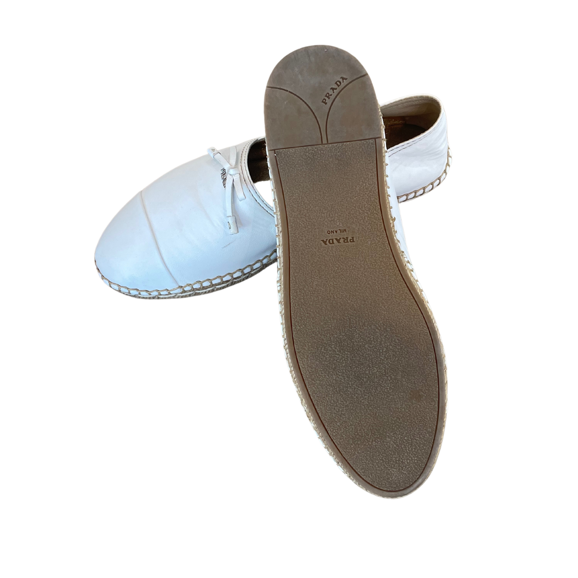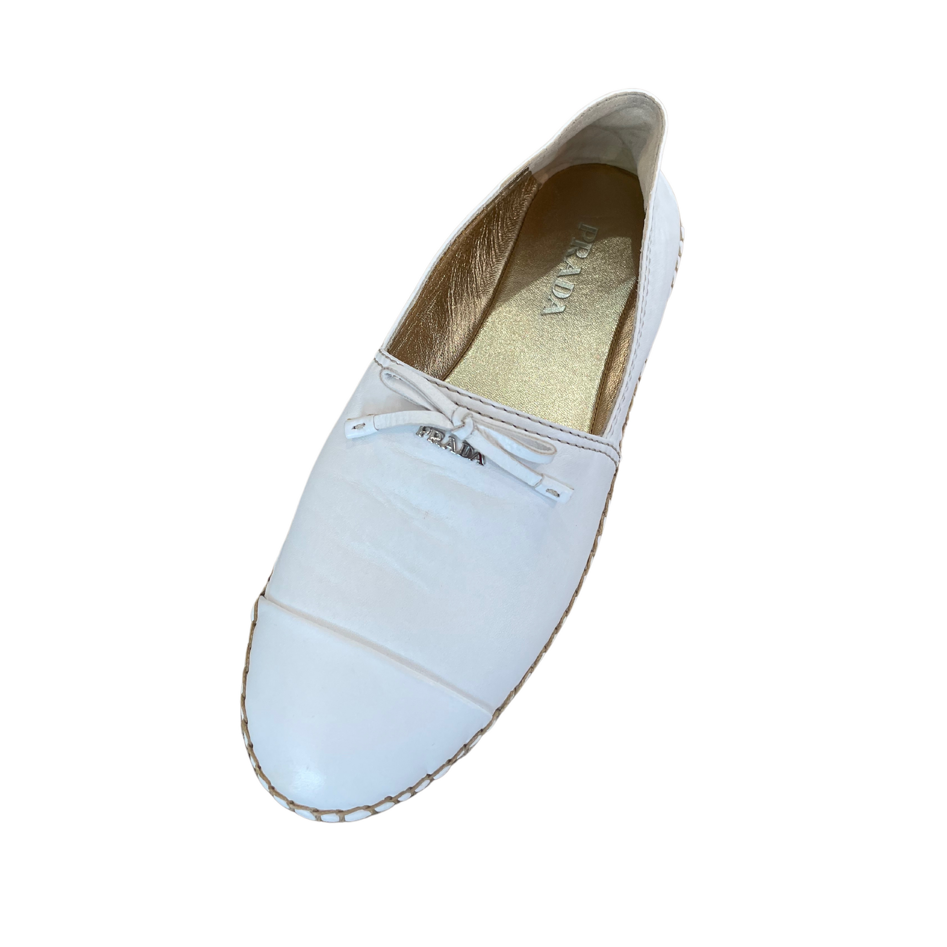 Espadrillas di Prada in pelle di vitello liscia bianca. Fiocco frontale, logo lettering in metallo argentato. Suola in paglia e gomma antiscivolo. Interno in pelle dorata.