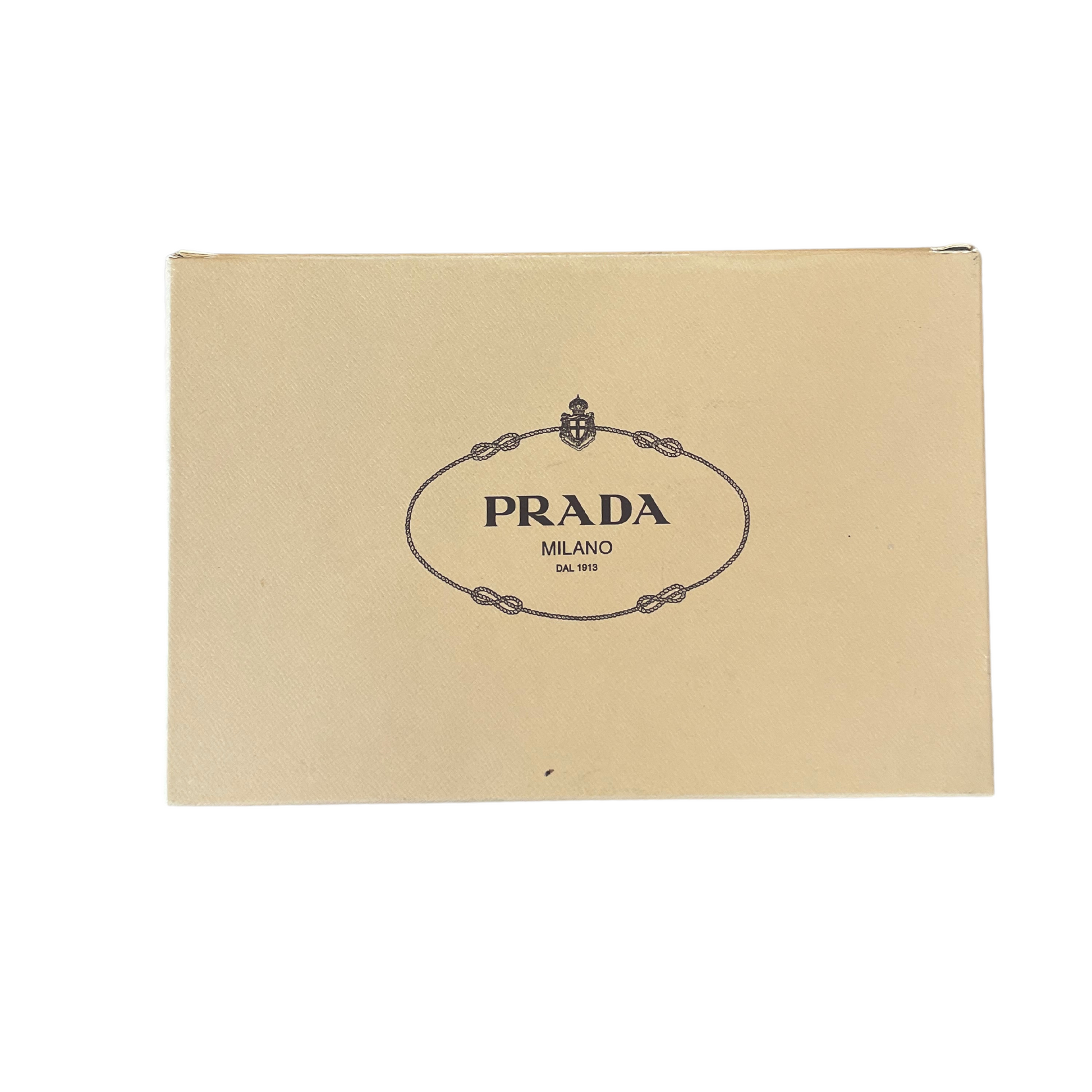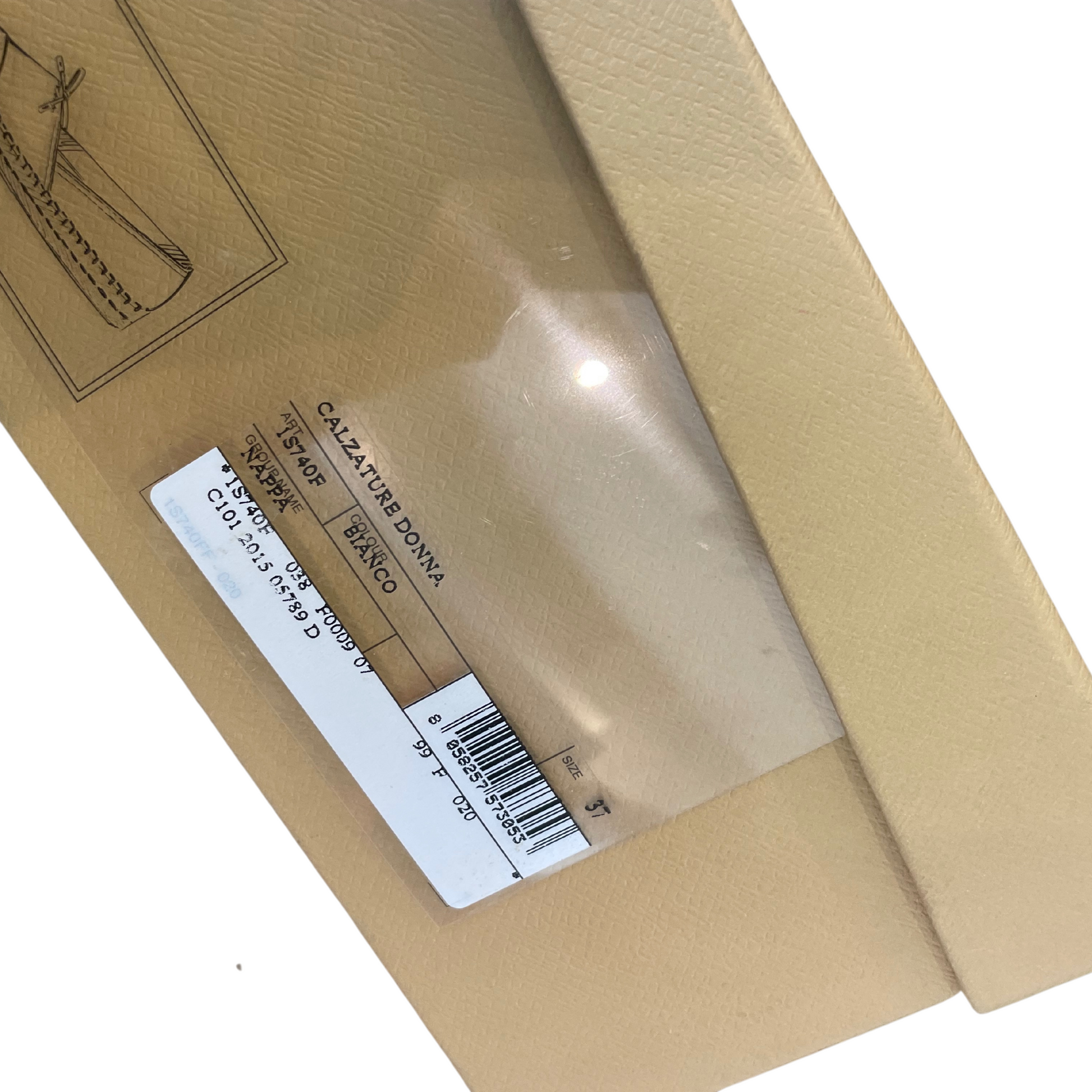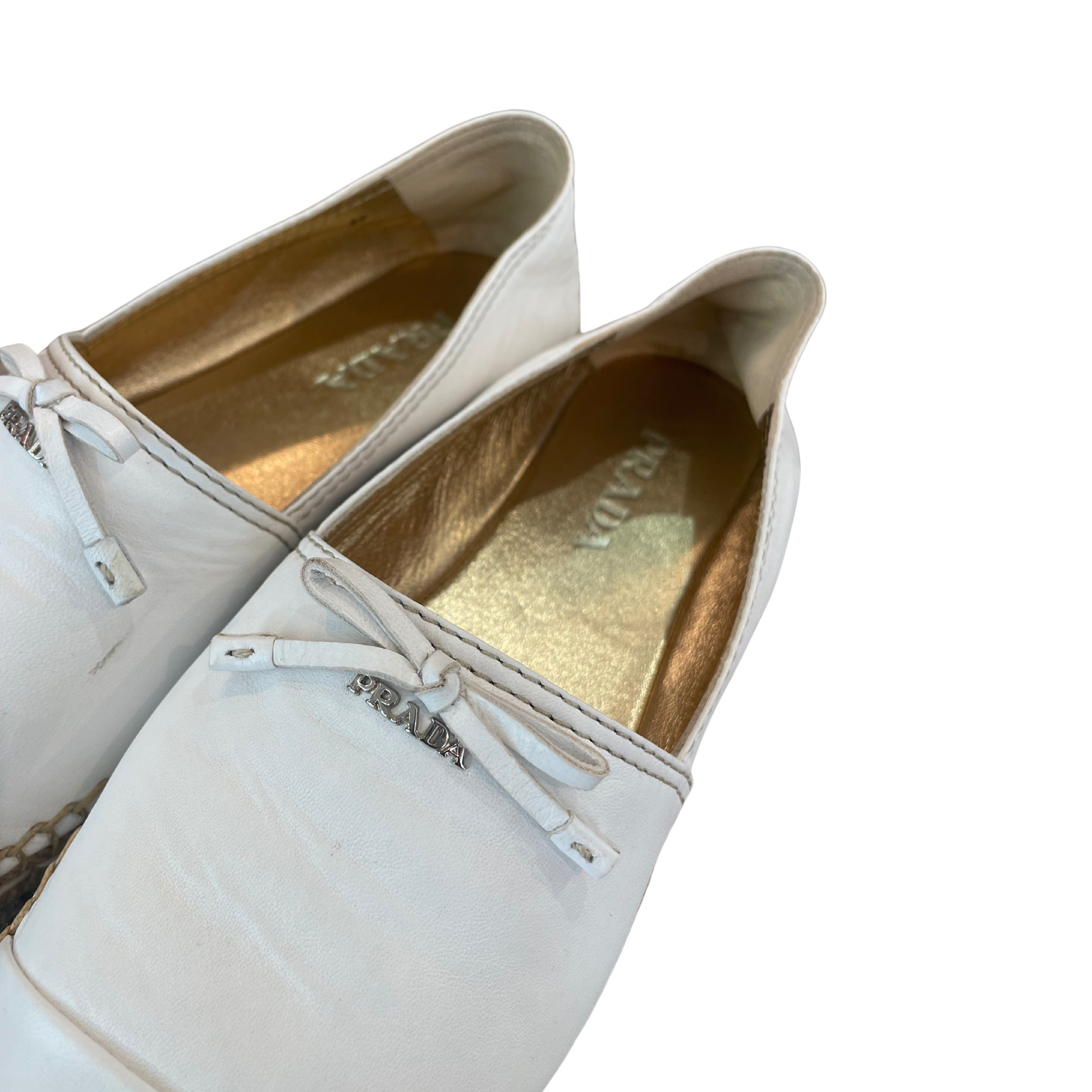 Espadrillas di Prada in pelle di vitello liscia bianca. Fiocco frontale, logo lettering in metallo argentato. Suola in paglia e gomma antiscivolo. Interno in pelle dorata.