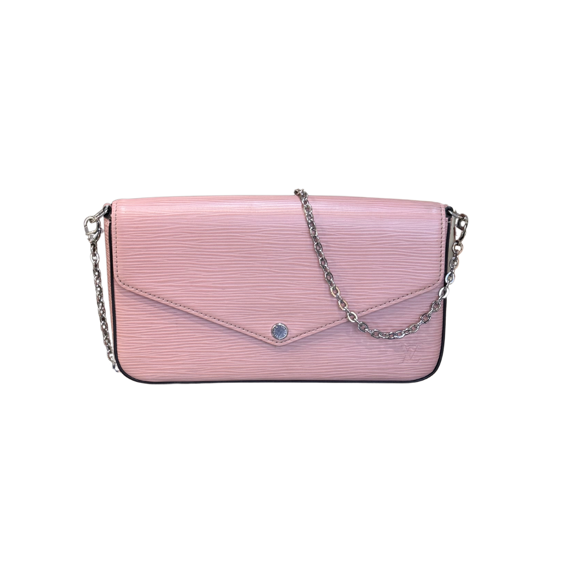 Pochette Felicie di Louis Vuitton , realizzata in pelle Épi rosa baby. Catenella argentata amovibile che consente di indossarla a tracolla. Apertura con patta frontale e bottoncino. Interno in alcantara rosa baby. All'interno due parti amovibili, una con cerniera e l'altra con scomparti per card. ( codice: TJ0138)
