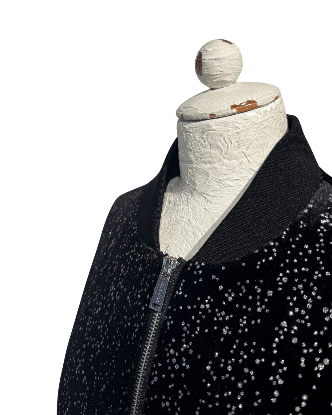 Questo giubbotto Dsquared2 unisce lo stile sportivo della classica bomber jacket all’eleganza del velluto nero, illuminato da una pioggia di micro applicazioni brillanti che creano un effetto luminoso sofisticato e di grande impatto. La zip frontale logata e i profili a coste su collo, polsini e fondo rendono la silhouette moderna e pulita. L’interno è completamente foderato e realizzato in 100% poliestere, per assicurare comfort e struttura.