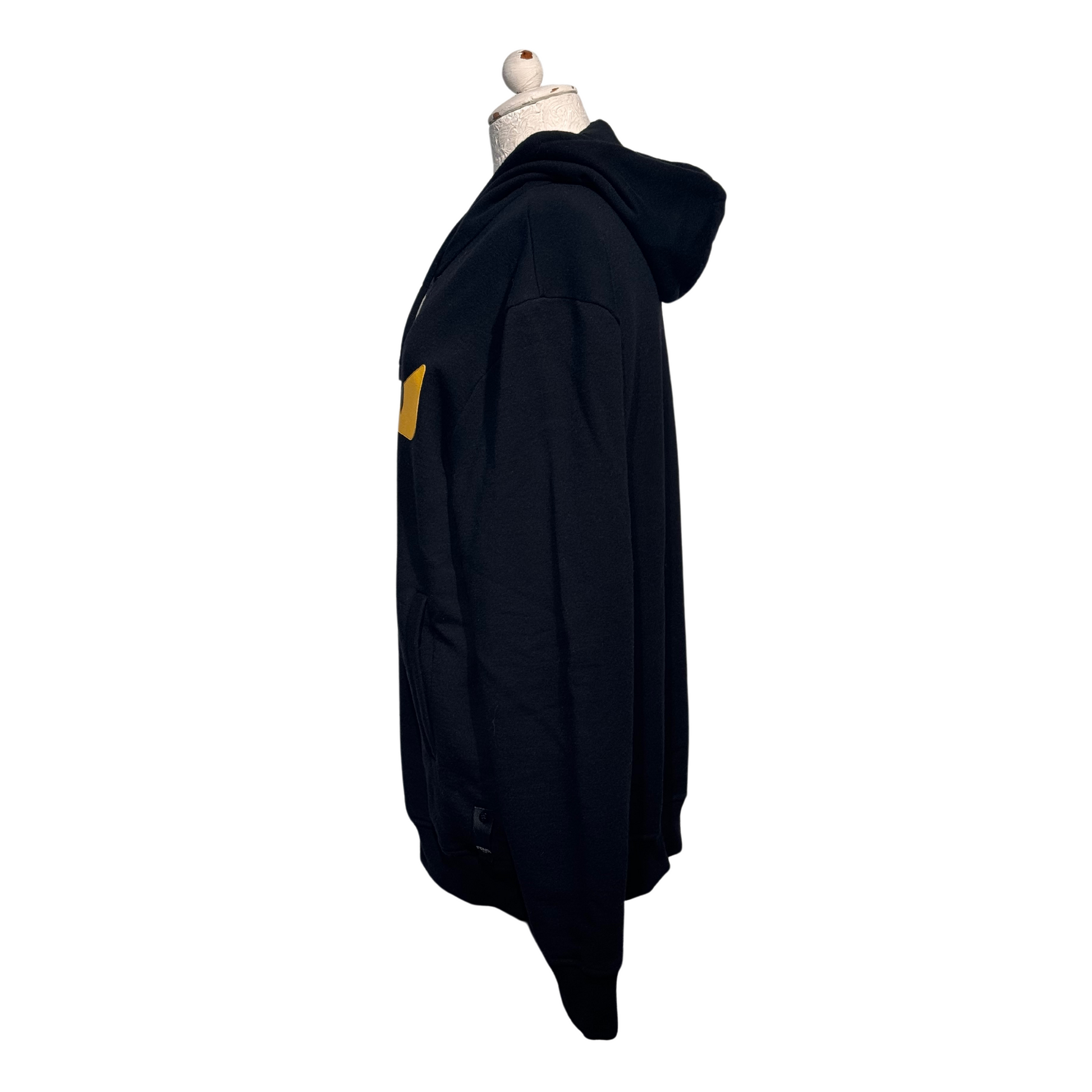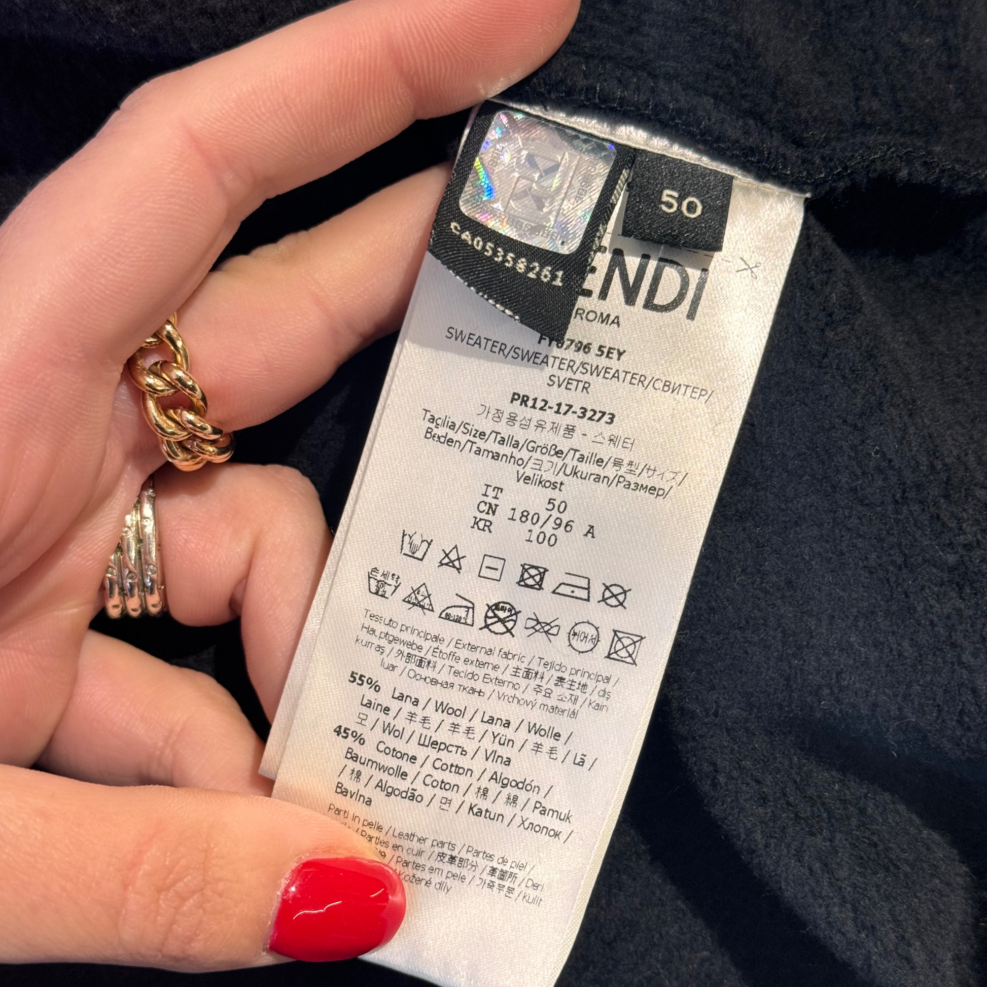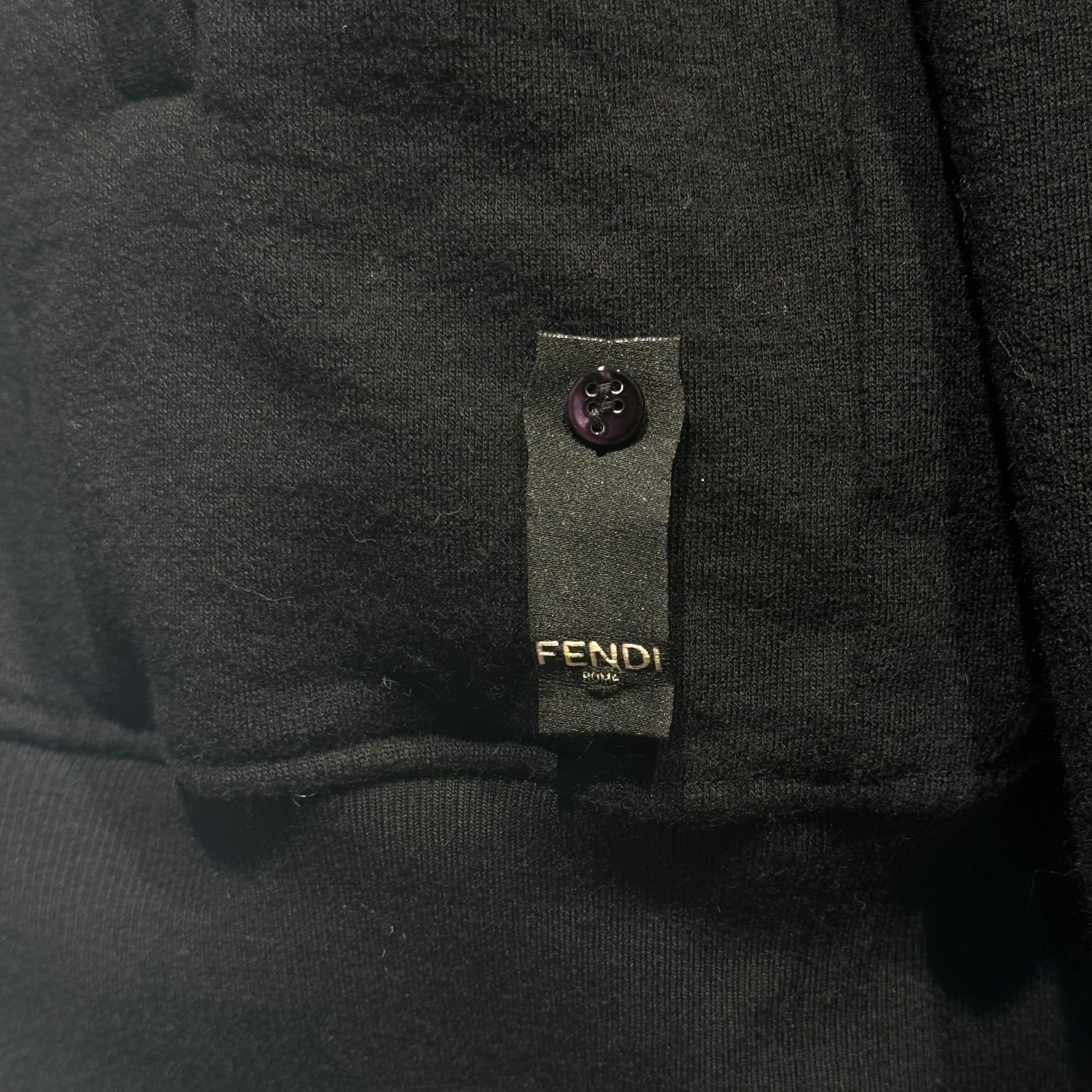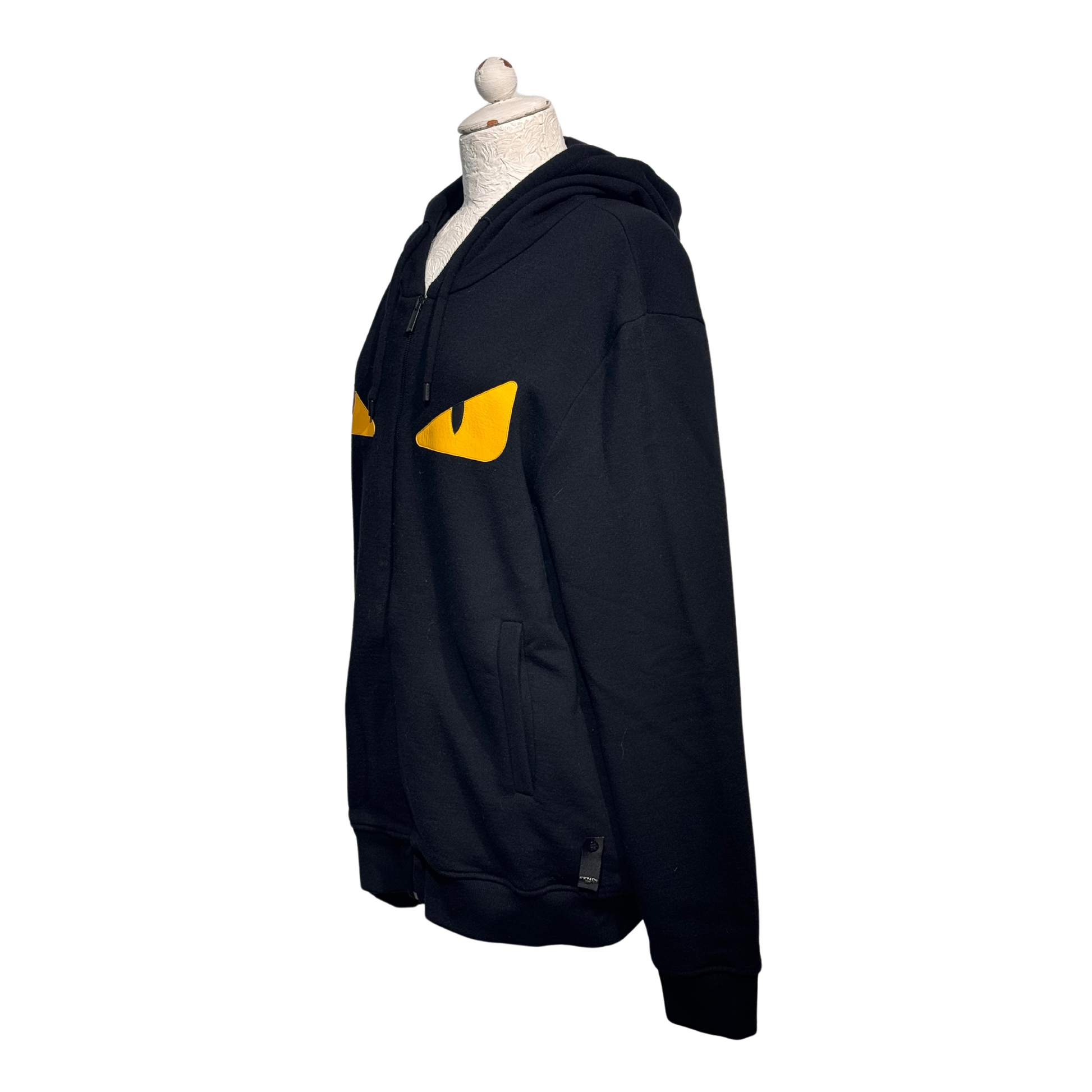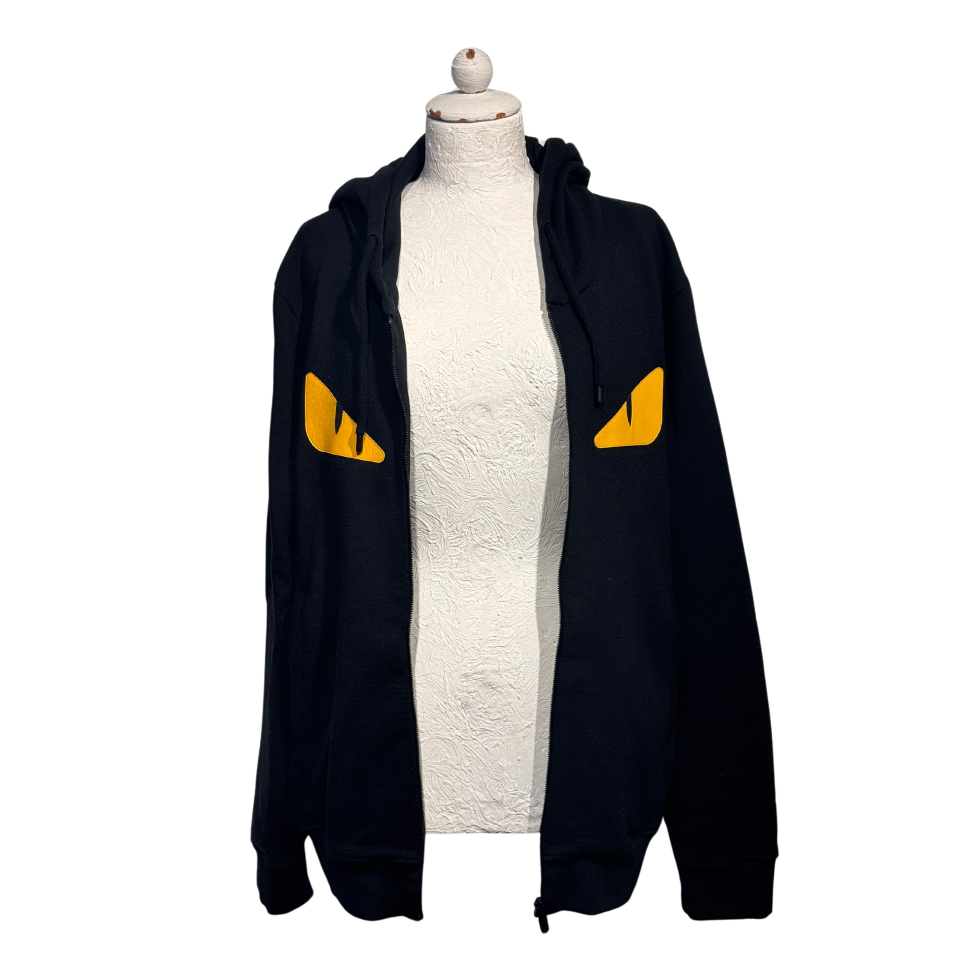 Felpa Fendi monster nera con occhi gialli iconici nella parte frontale. Apertura frontale con cerniera, tasche e cappuccio. Realizzata in lana 55% e cotone 45%. Interno in pile.