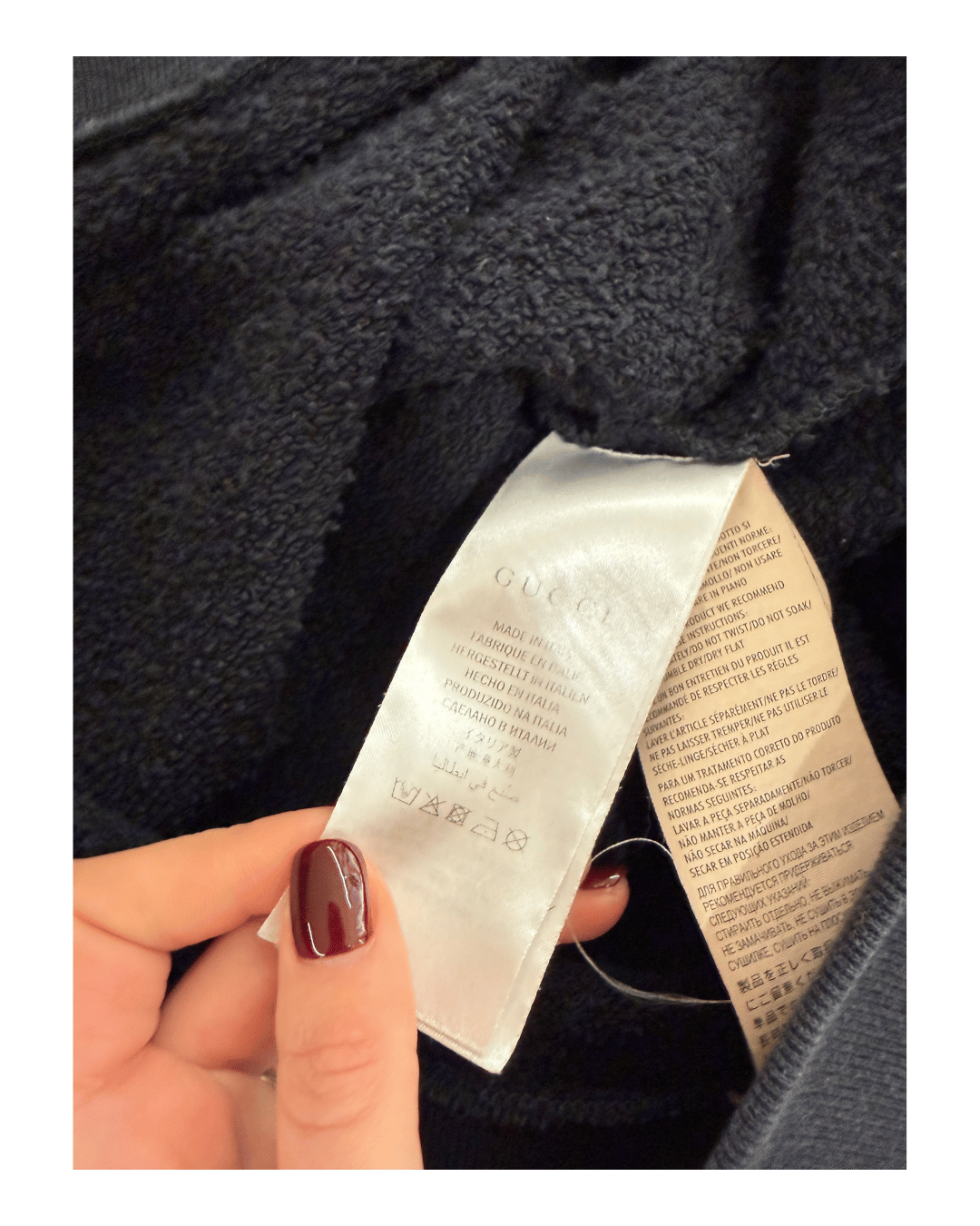 Una felpa iconica firmata Gucci, caratterizzata dal classico maxi logo frontale in stile vintage, con effetto leggermente consumato tipico del modello. Realizzata in 100% cotone e prodotta in Italia, ha una vestibilità comoda e un look casual-lusso che si adatta a qualsiasi outfit quotidiano. Il tessuto è morbido, caldo e piacevole sulla pelle, con interno garzato e finiture elasticizzate su collo, polsini e fondo. I bordi leggermente “vissuti” sono parte integrante del design originale della felpa, che presenta un tipico effetto consumato voluto dalla Maison.