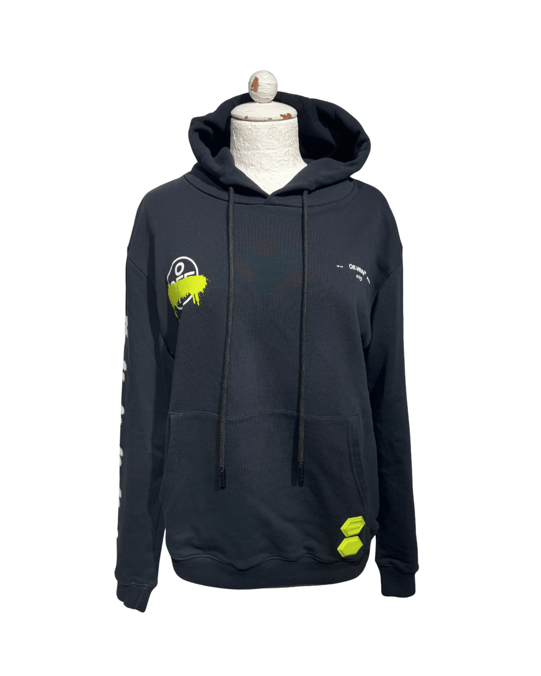 Questa felpa Off-White è uno di quei capi che non hanno bisogno di presentazioni. Un hoodie dal design pulito sul davanti e super d’impatto sul retro, con l’inconfondibile stampa Arrow bianca in stile spray, simbolo assoluto del brand creato da Virgil Abloh. Realizzata in morbido cotone 100%, è il classico capo luxury streetwear che si abbina a tutto: leggings, denim, pantaloni sartoriali… sempre perfetta per dare carattere anche al look più semplice. Sul petto troviamo il logo Off-White discreto, mentre sulla manica spicca la scritta grafica a contrasto. Dettaglio extra: gli inserti neon applicati sul fondo, che rendono questa felpa ancora più particolare e ricercata.