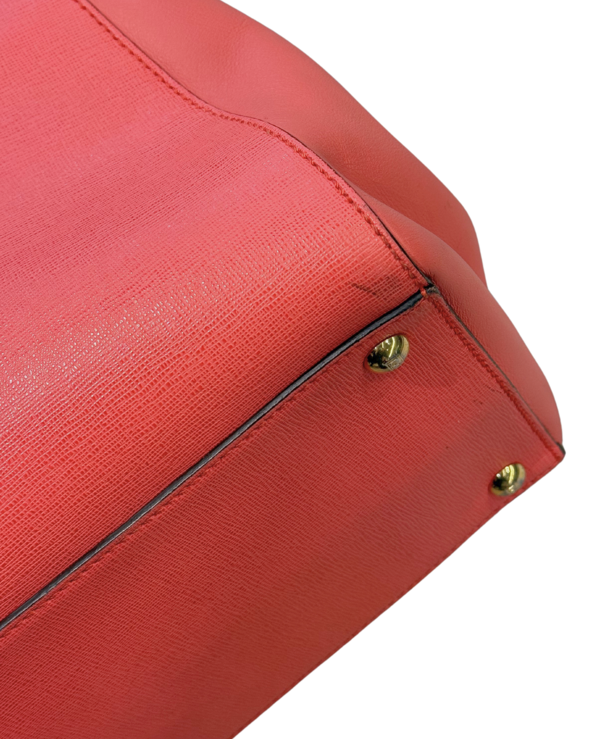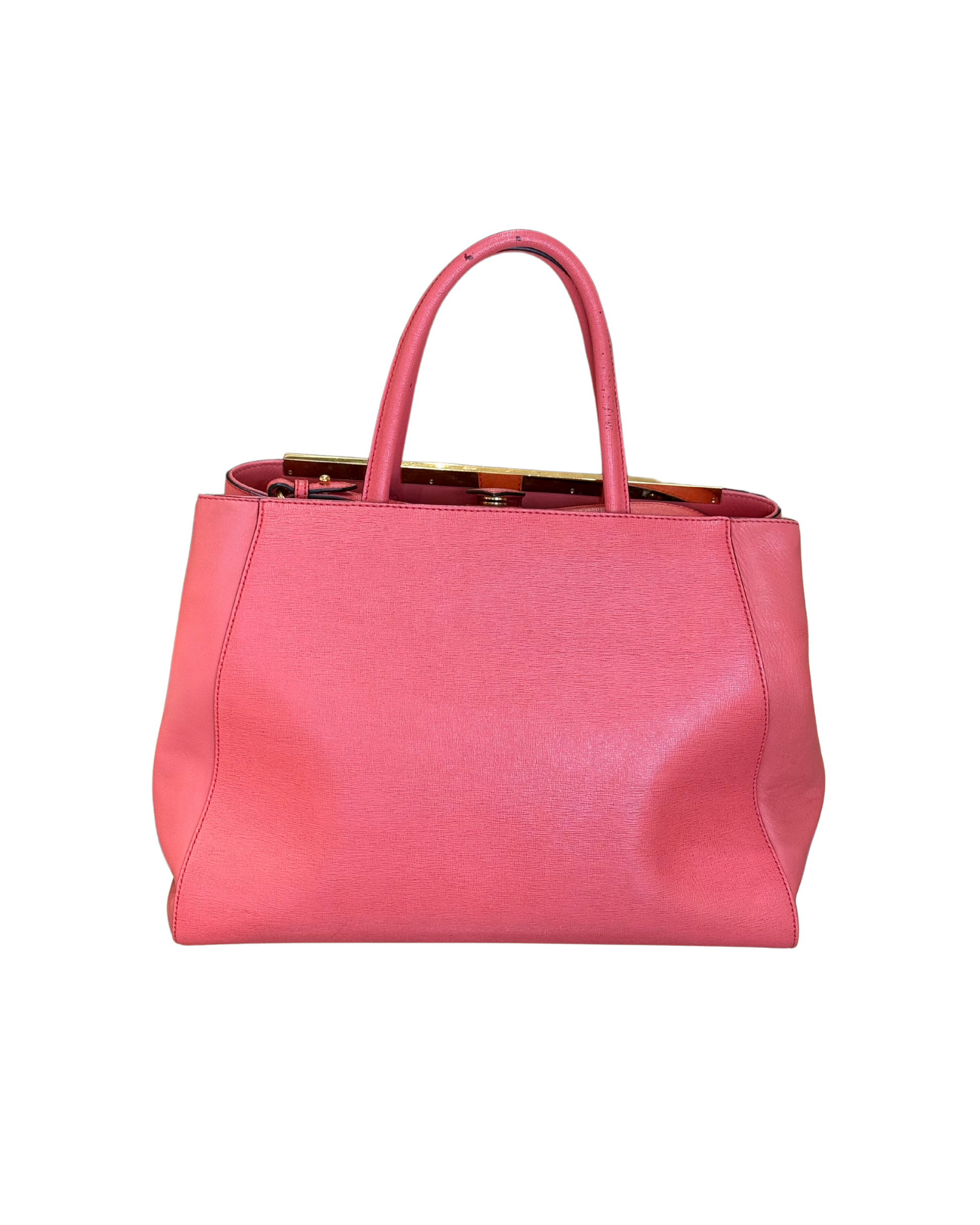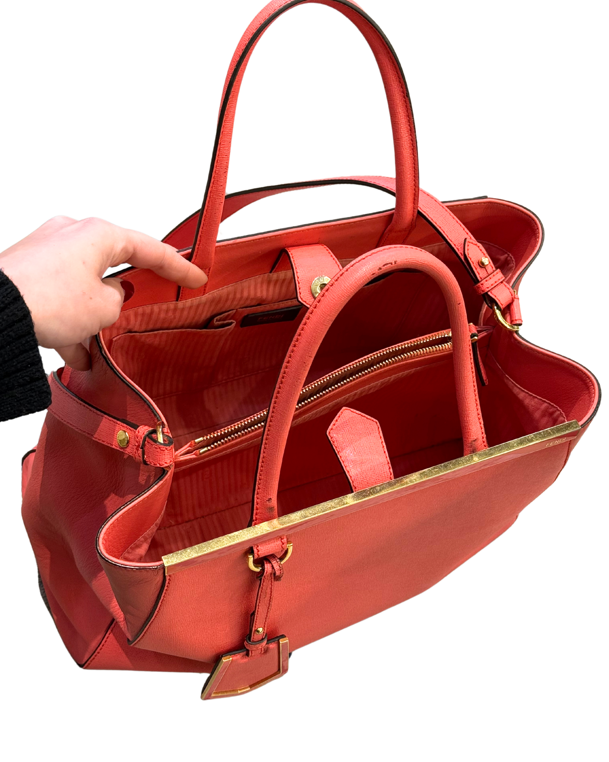 Borsa Fendi 2Jours in pelle saffiano color salmone e pelle liscia lateralmente. Rifinitura superiore in metallo con logo. Doppi manici superiori, tracolla amovibile. Apertura con bottone. Metalleria dorata. Interno a righe, tre scomparti di cui quello centrale con cerniera. Cinque piedini d'appoggio.