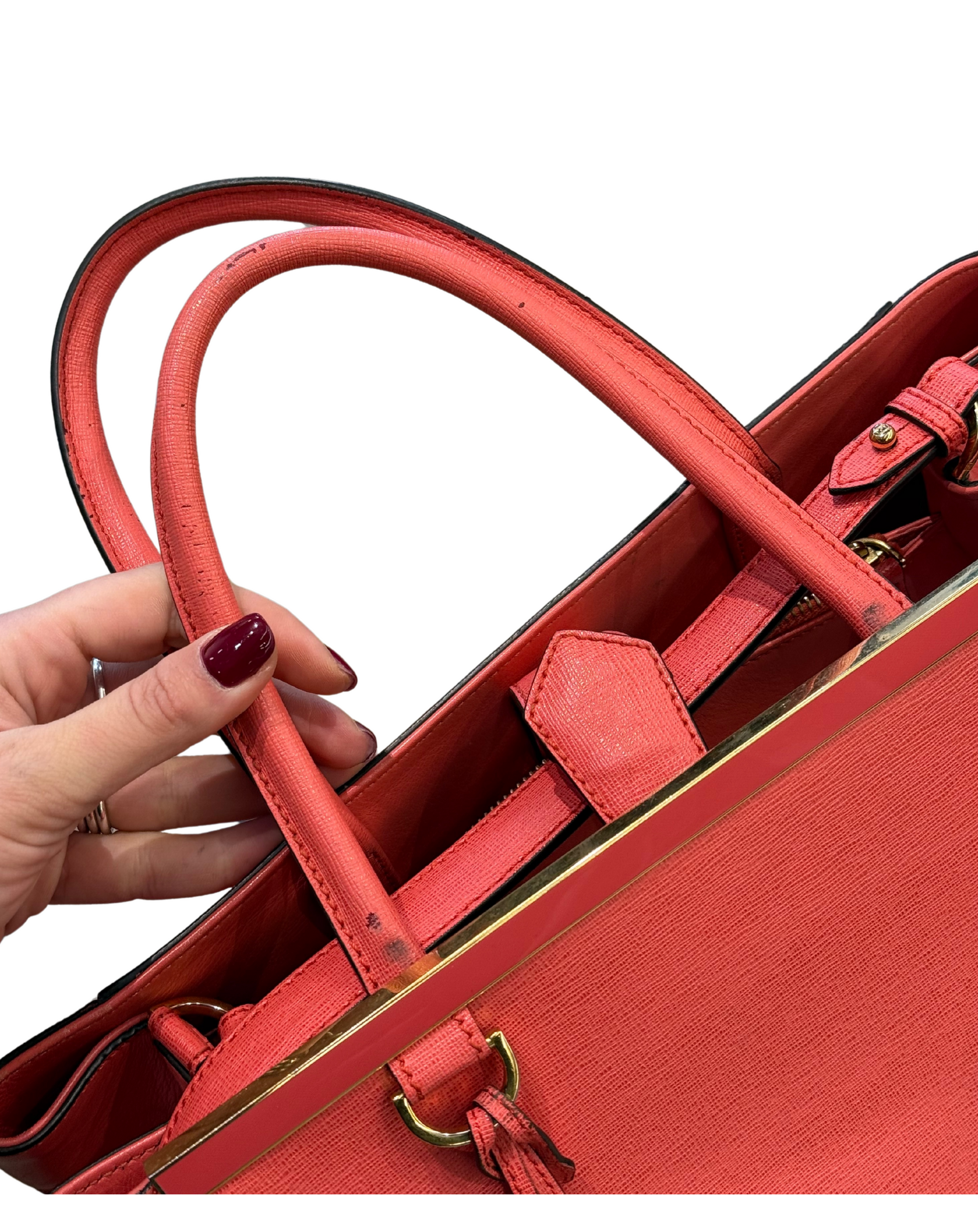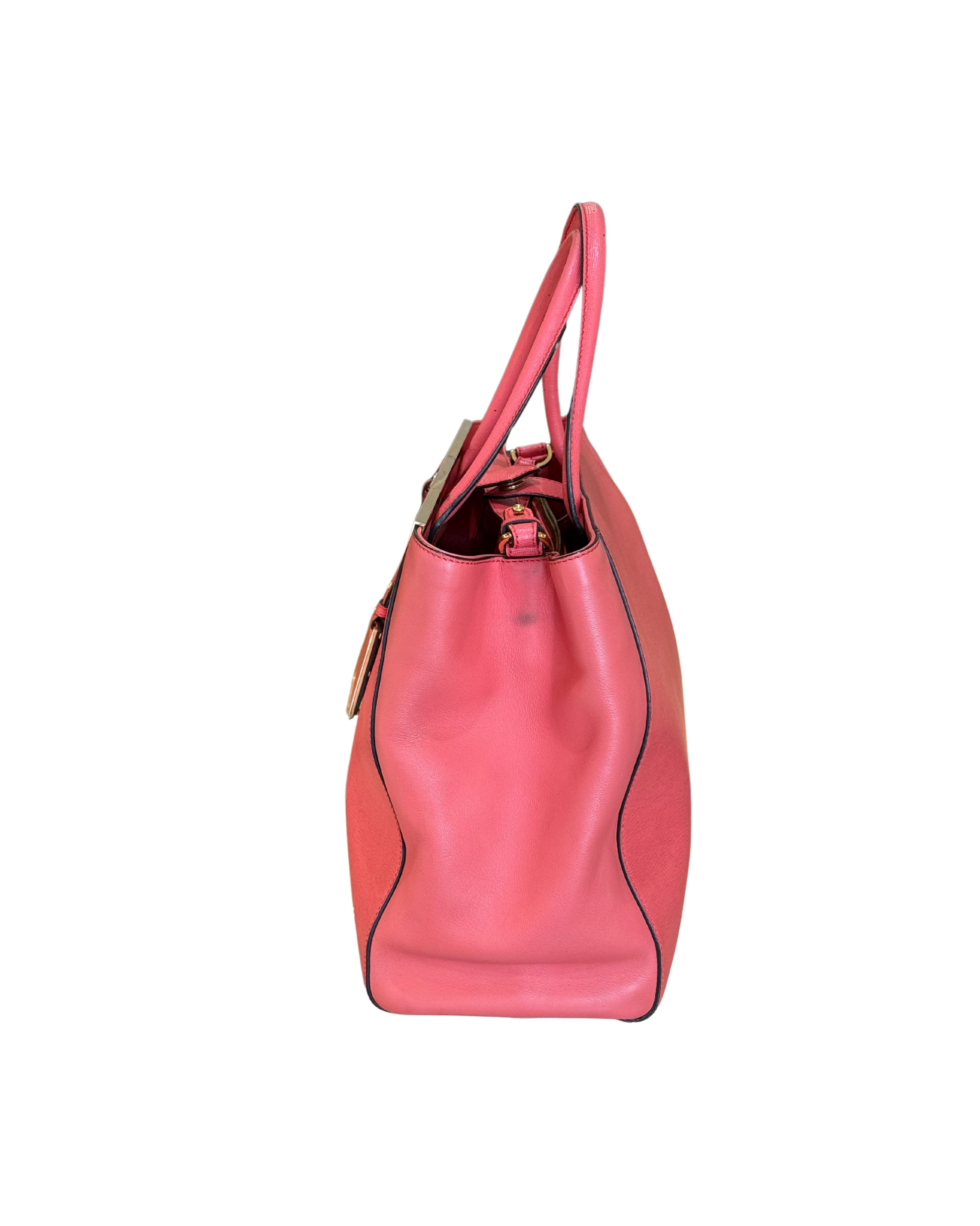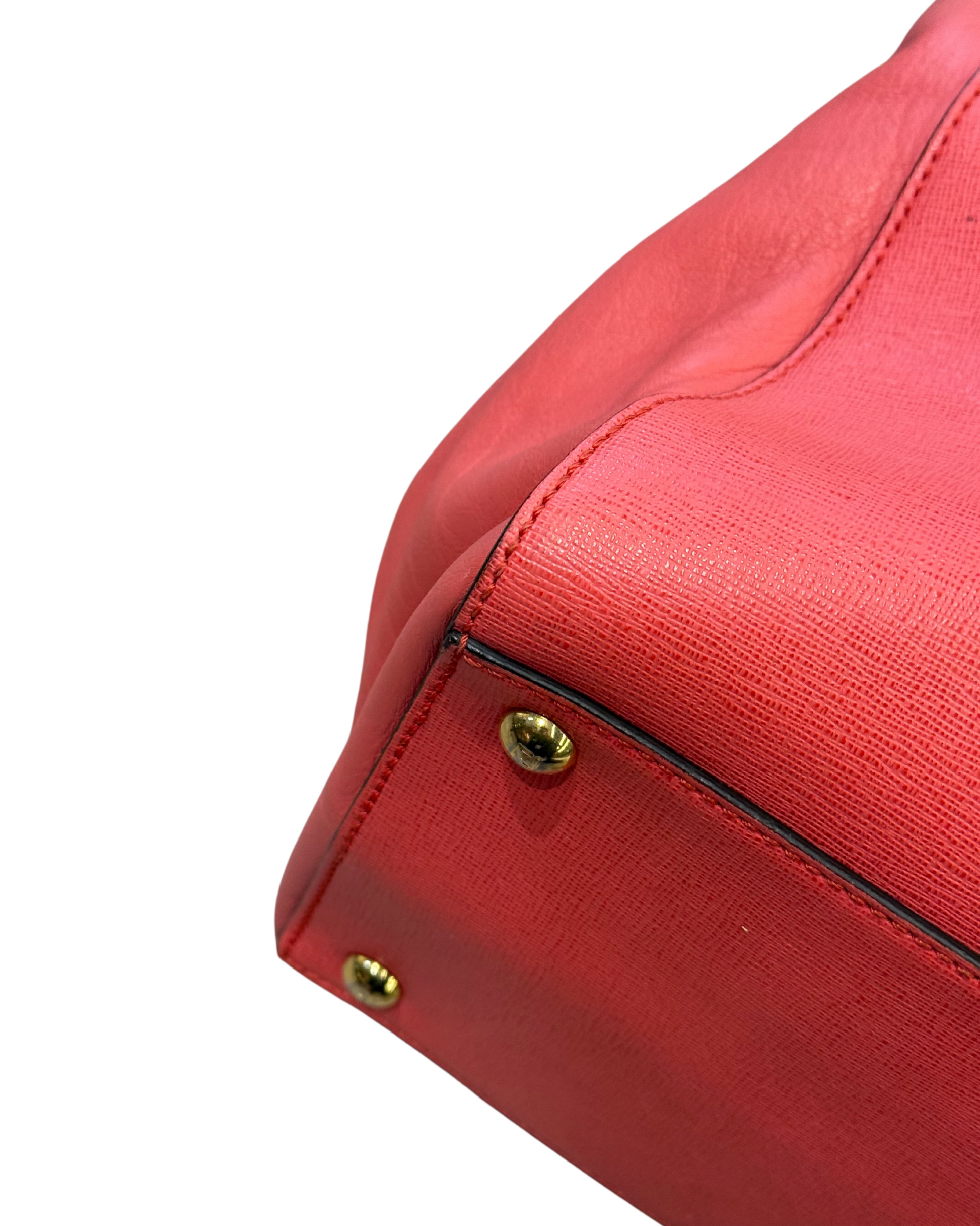 Borsa Fendi 2Jours in pelle saffiano color salmone e pelle liscia lateralmente. Rifinitura superiore in metallo con logo. Doppi manici superiori, tracolla amovibile. Apertura con bottone. Metalleria dorata. Interno a righe, tre scomparti di cui quello centrale con cerniera. Cinque piedini d'appoggio.