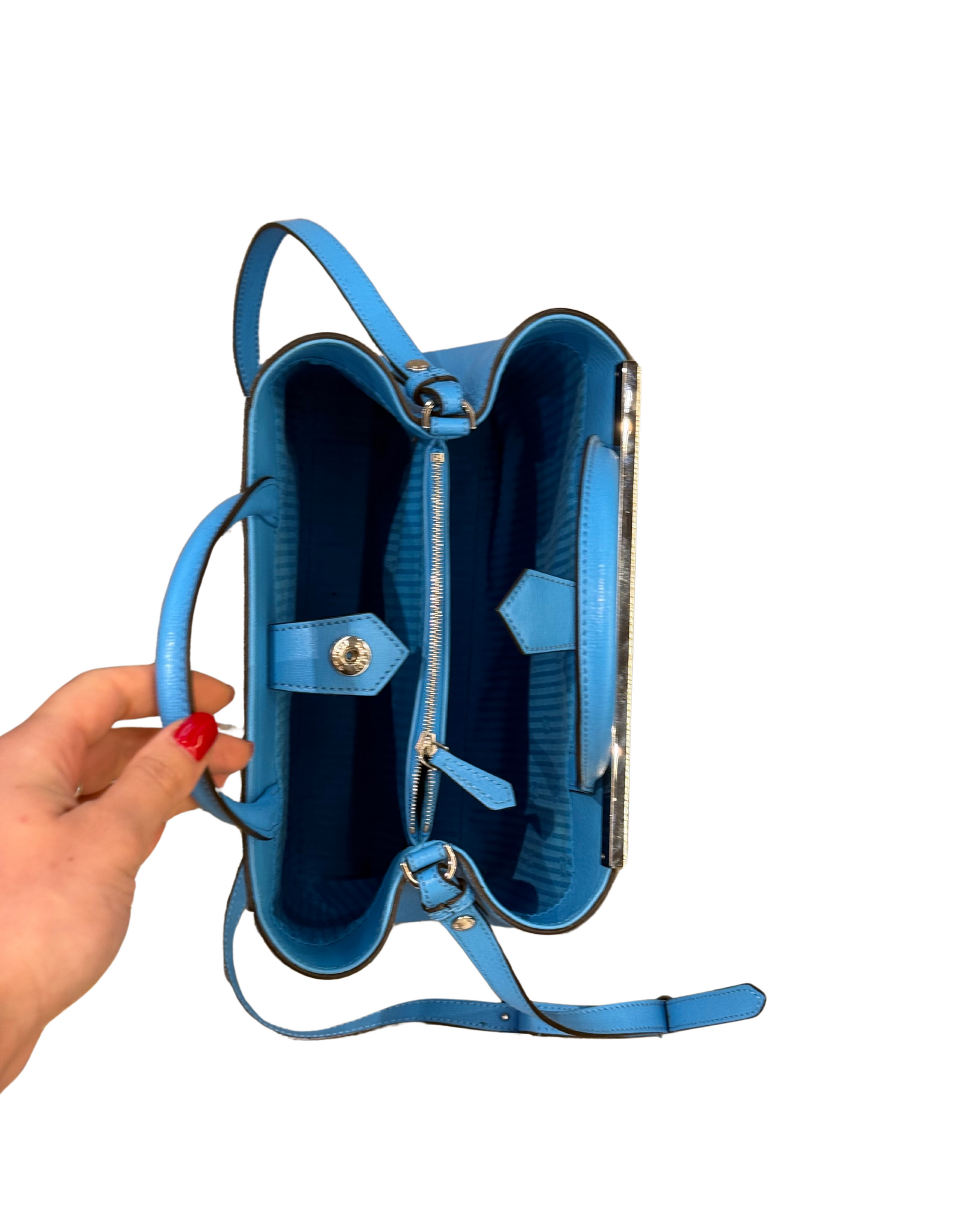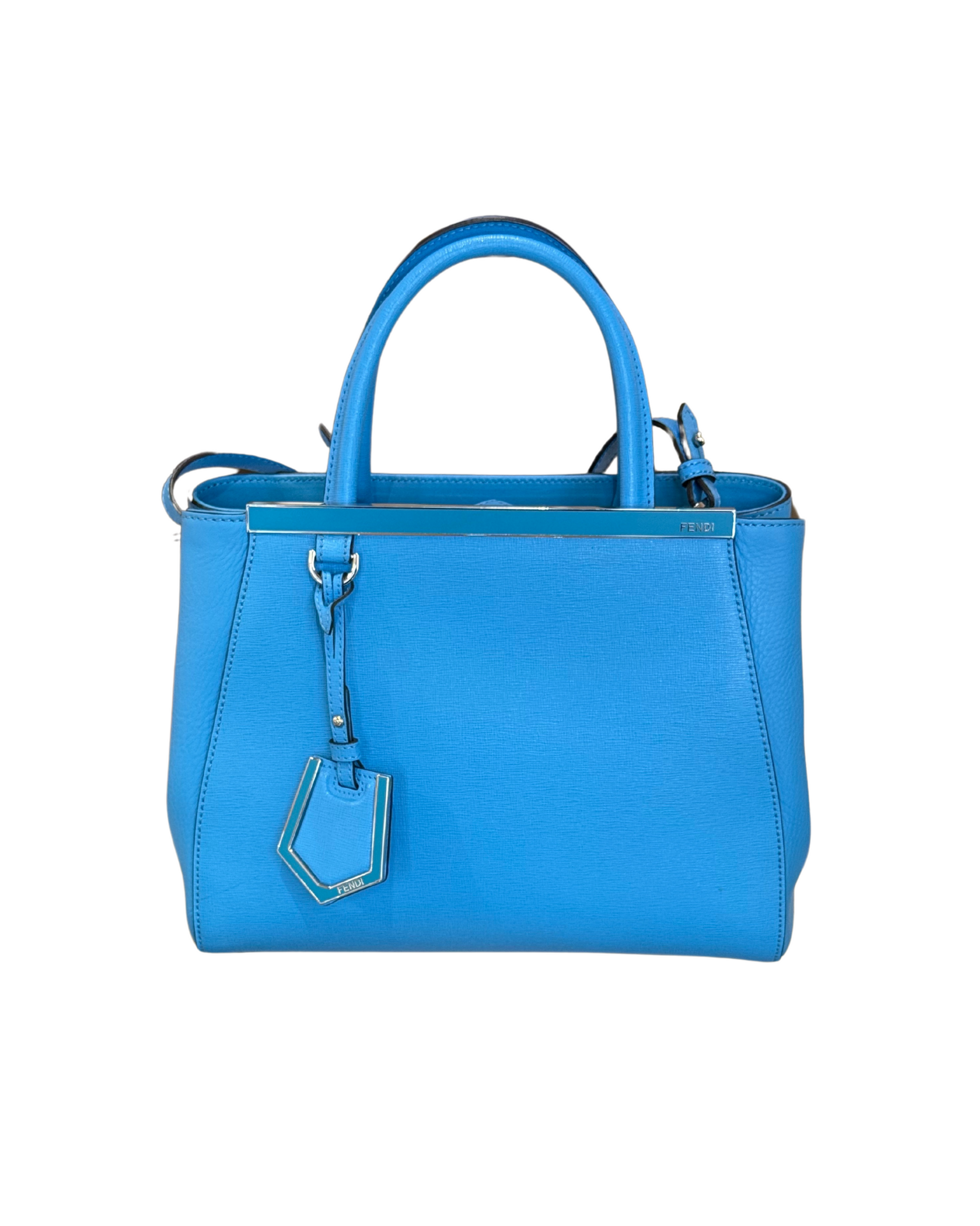 Borsa Fendi 2Jours in pelle saffiano turchese e pelle liscia lateralmente. Rifinitura superiore in metallo con logo. Doppi manici superiori, tracolla che consente di indossare la borsa anche crossbody. Apertura con bottone. Metalleria argentata. Interno a righe, due scomparti divisi da una tasca con cerniera. Quattro piedini d'appoggio.