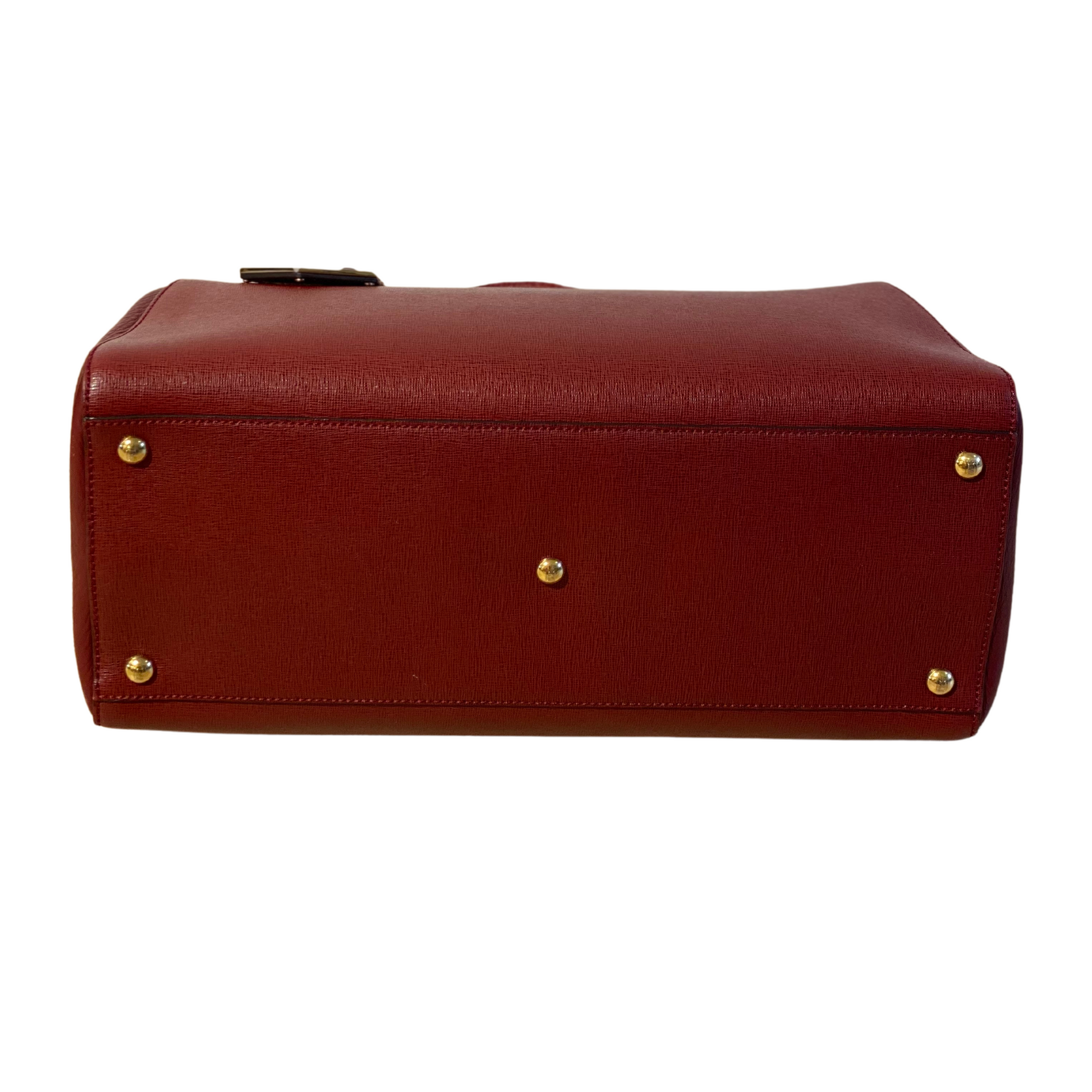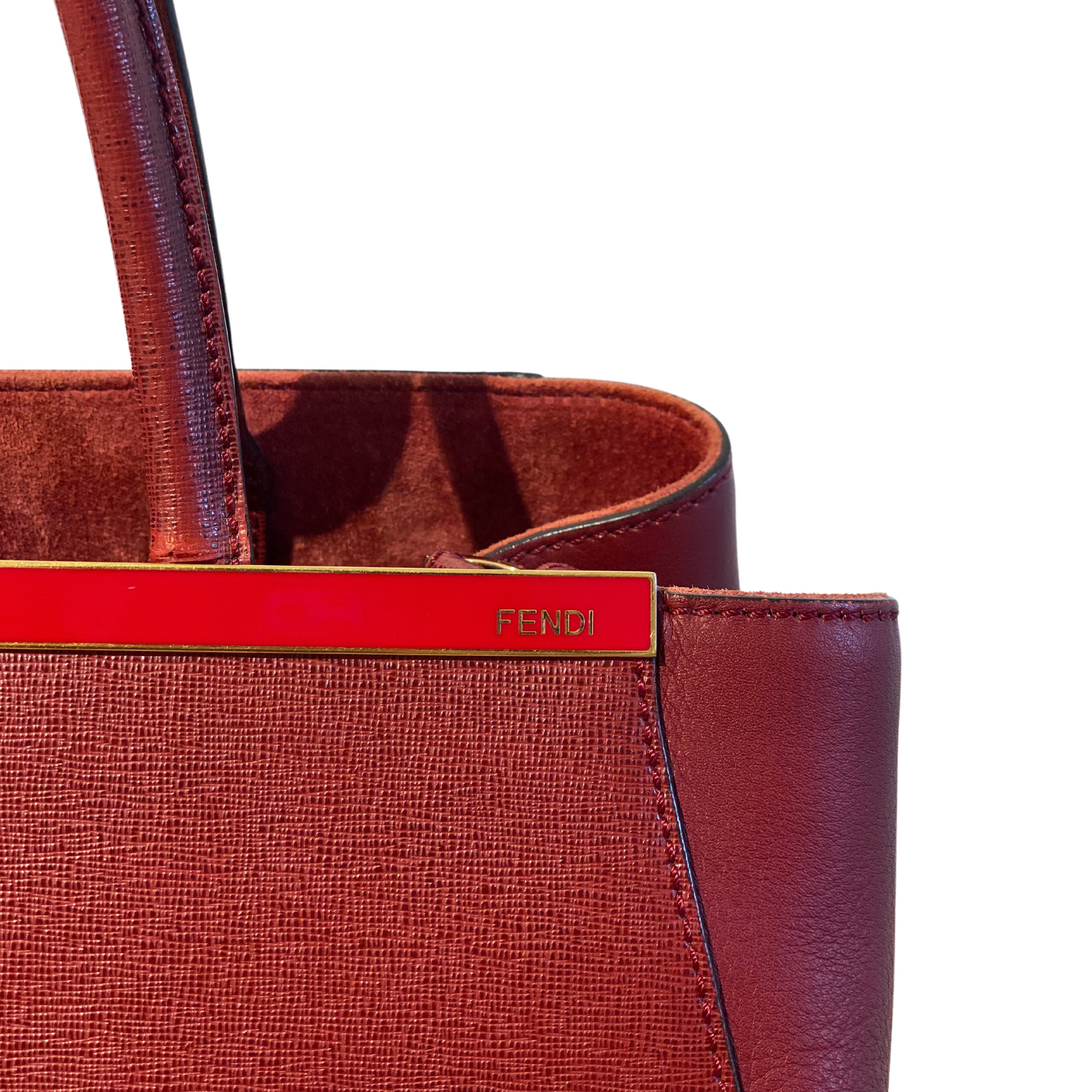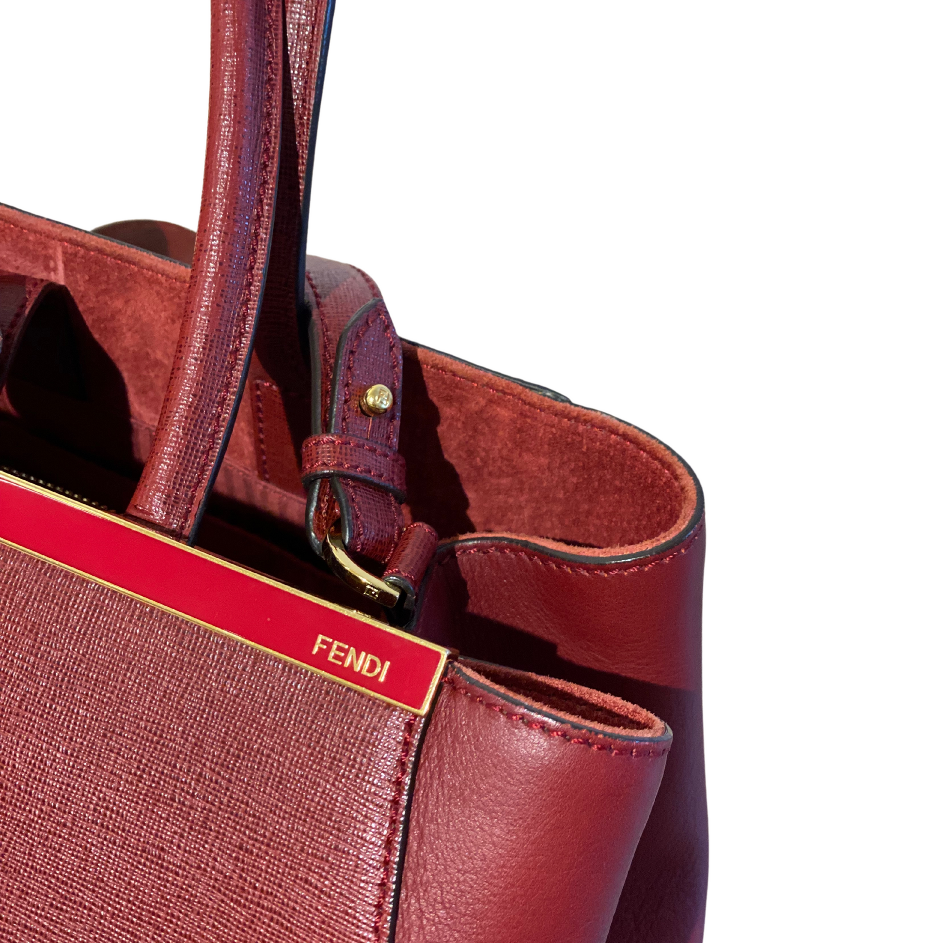 Borsa Fendi 2Jours in pelle saffiano rosso granato e pelle martellata lateralmente. Rifinitura superiore in metallo con logo. Doppi manici superiori, tracolla amovibile. Apertura con bottone. Metalleria dorata. Interno in alcantara, tre scomparti di cui quello centrale con cerniera. Cinque piedini d'appoggio.