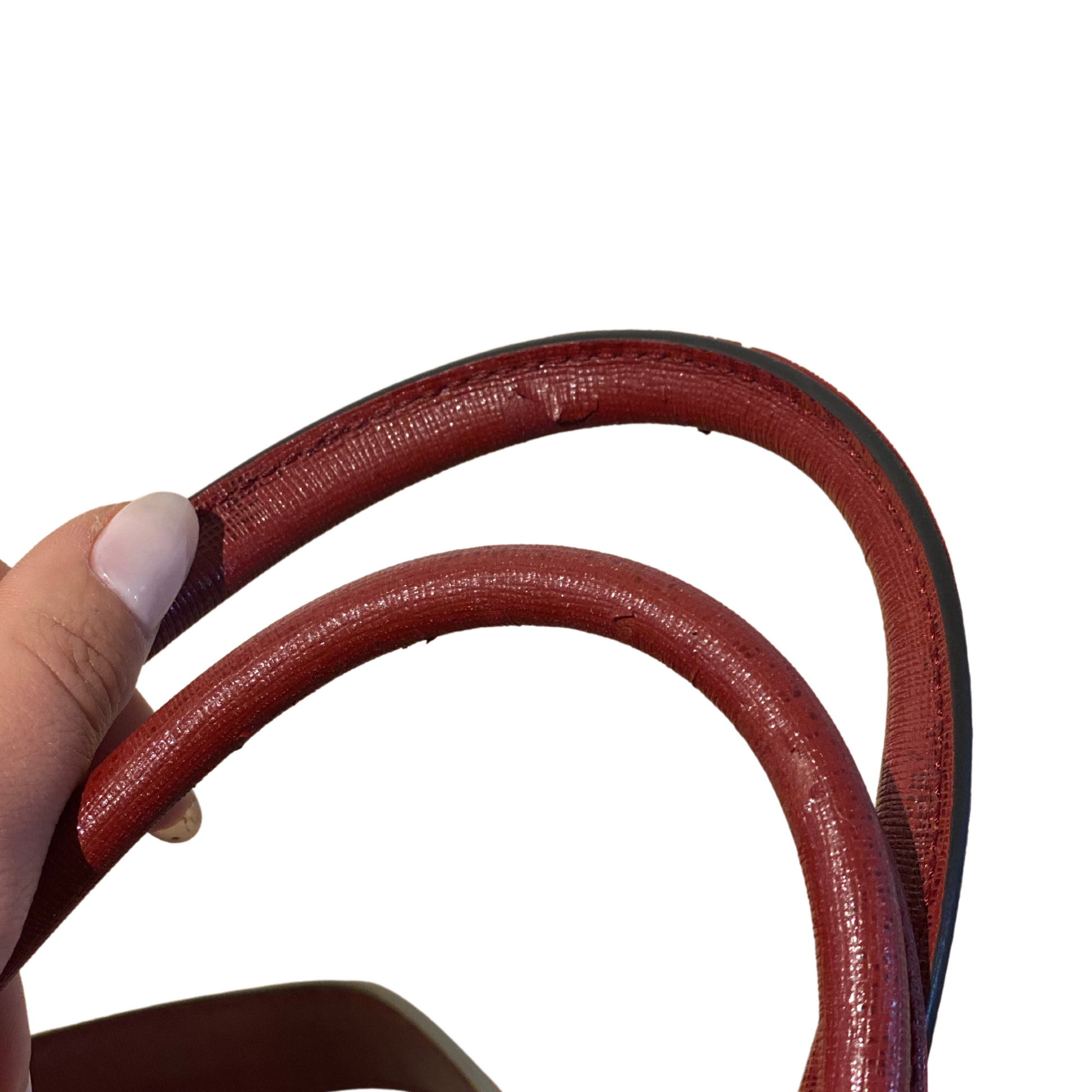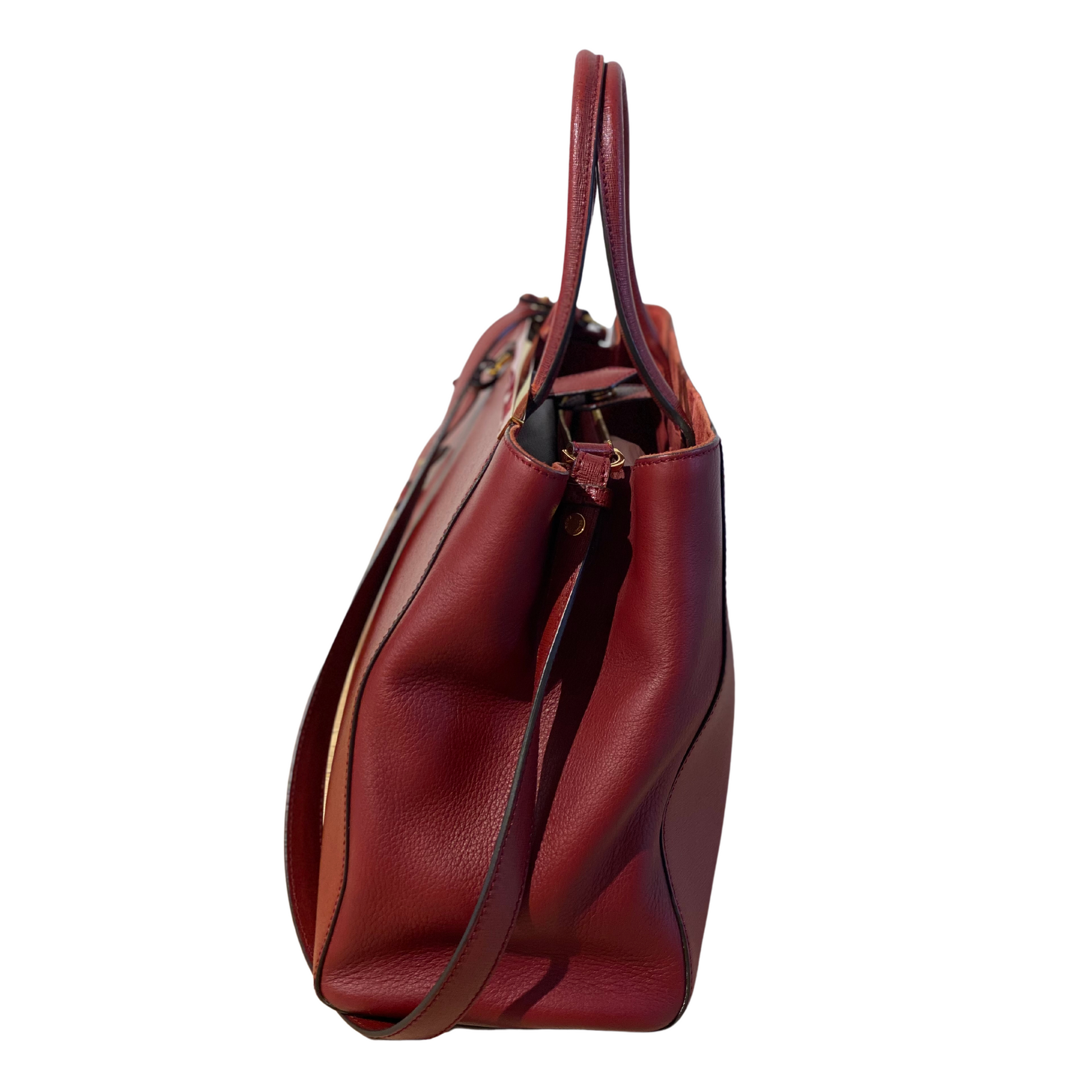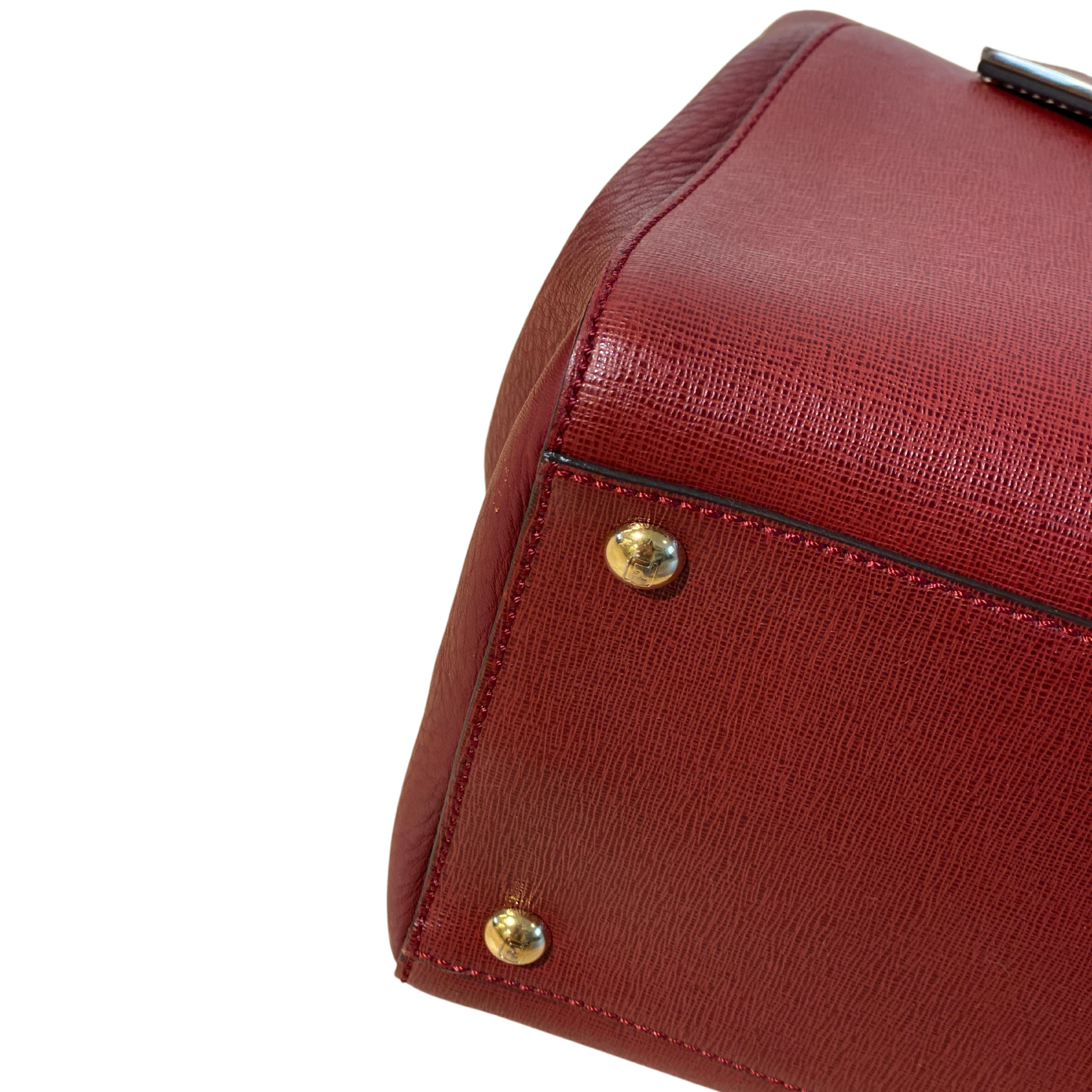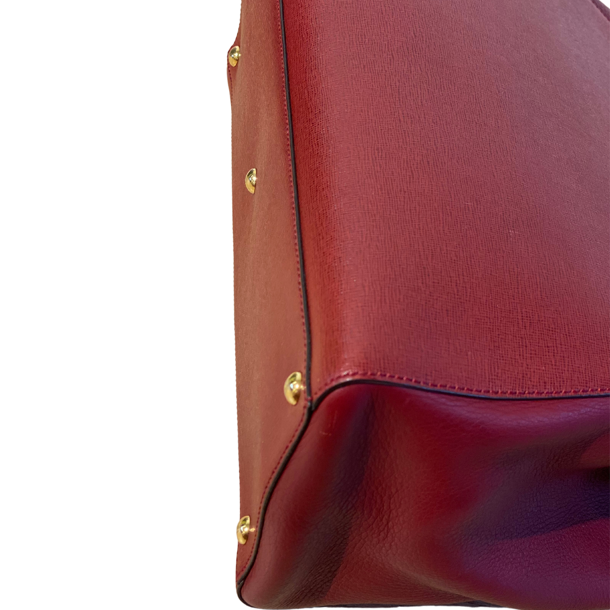 Borsa Fendi 2Jours in pelle saffiano rosso granato e pelle martellata lateralmente. Rifinitura superiore in metallo con logo. Doppi manici superiori, tracolla amovibile. Apertura con bottone. Metalleria dorata. Interno in alcantara, tre scomparti di cui quello centrale con cerniera. Cinque piedini d'appoggio.
