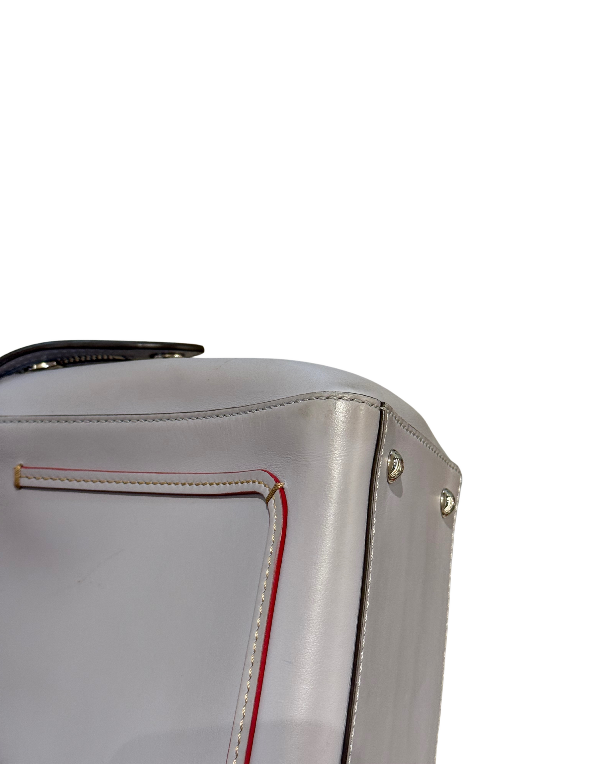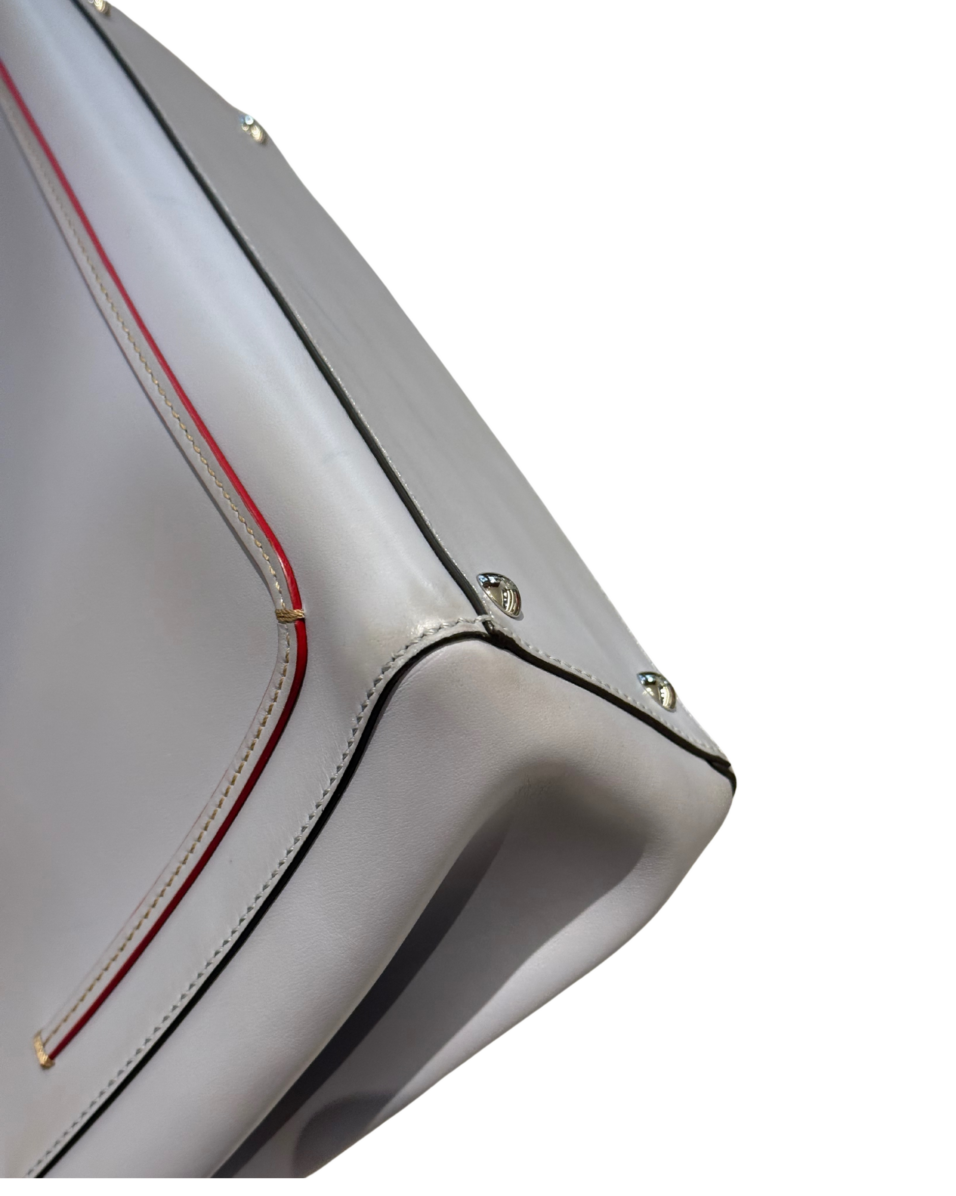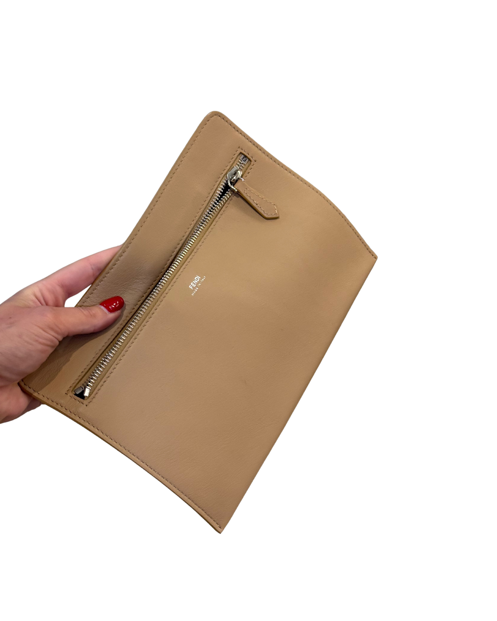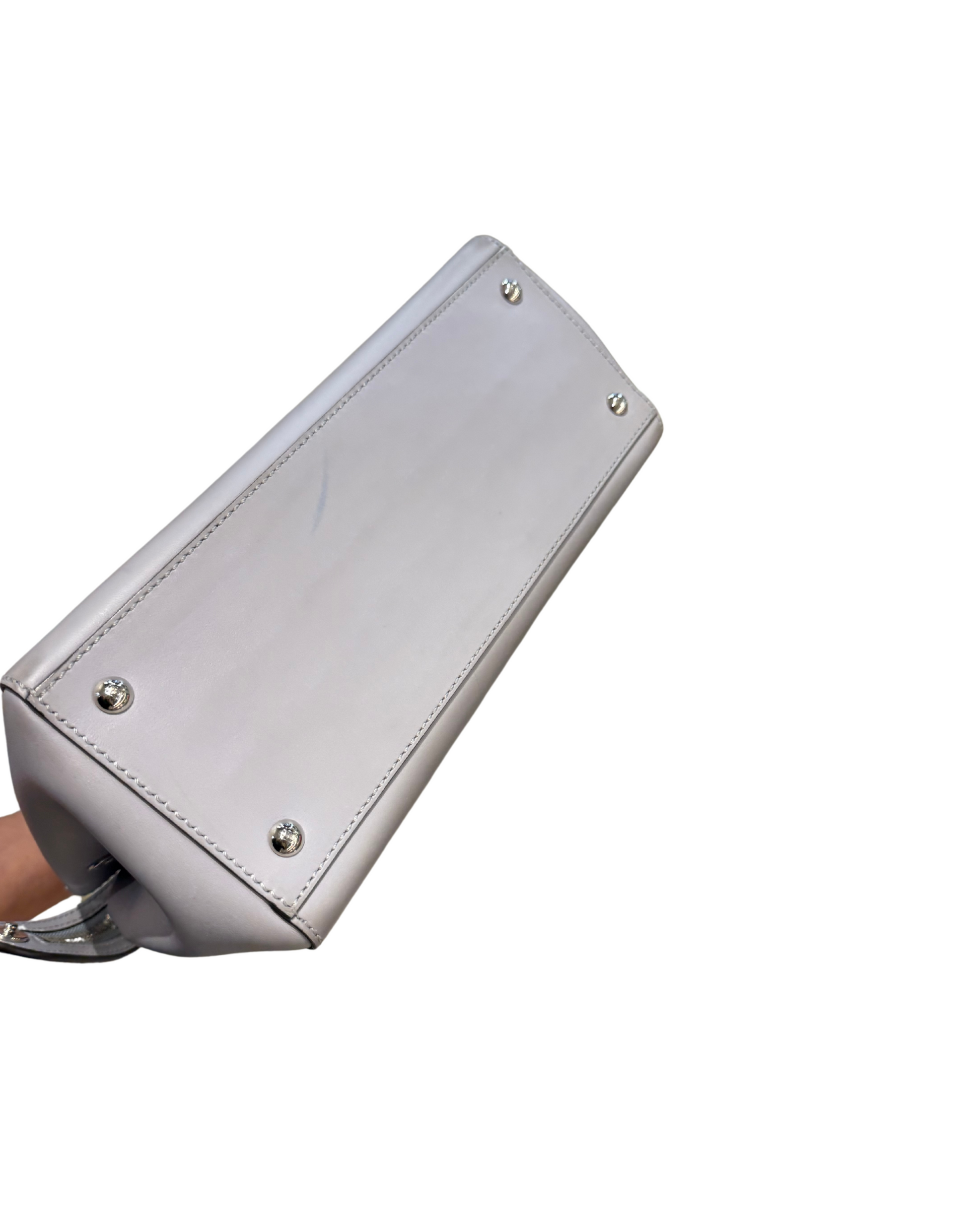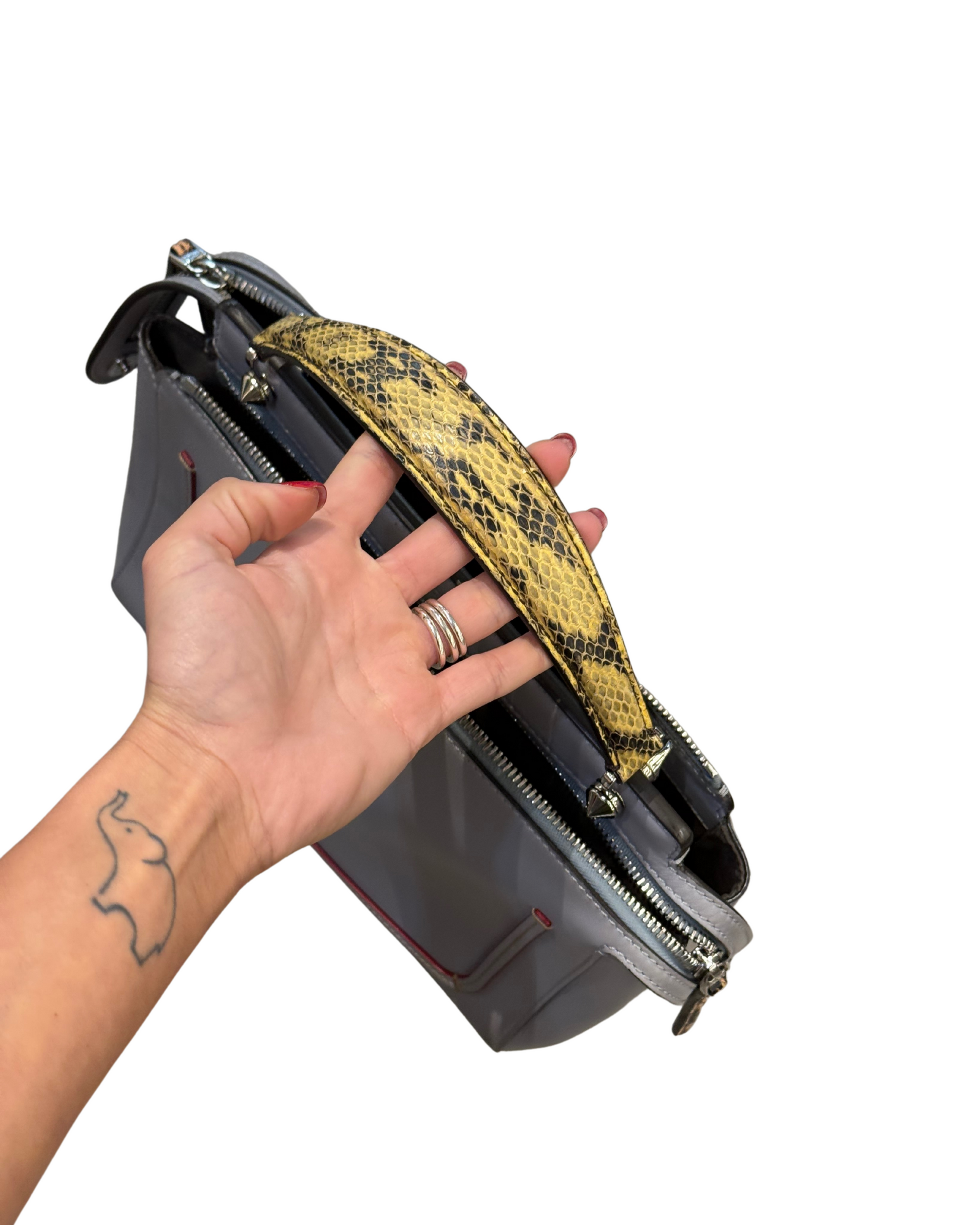 Una borsa che non passa inosservata: la Dotcom di Fendi unisce linee pulite, dettagli curati e un tocco grintoso grazie alla maxi tracolla e manico in pelle di serpente. Realizzata in morbida pelle azzurra carta da zucchero e cuciture a contrasto rosse. Arricchita da una pochette beige amovibile con borchia, perfetta anche come clutch. Interno suddiviso in due scomparti ,alcantara. Piedini metallici d'appoggio.