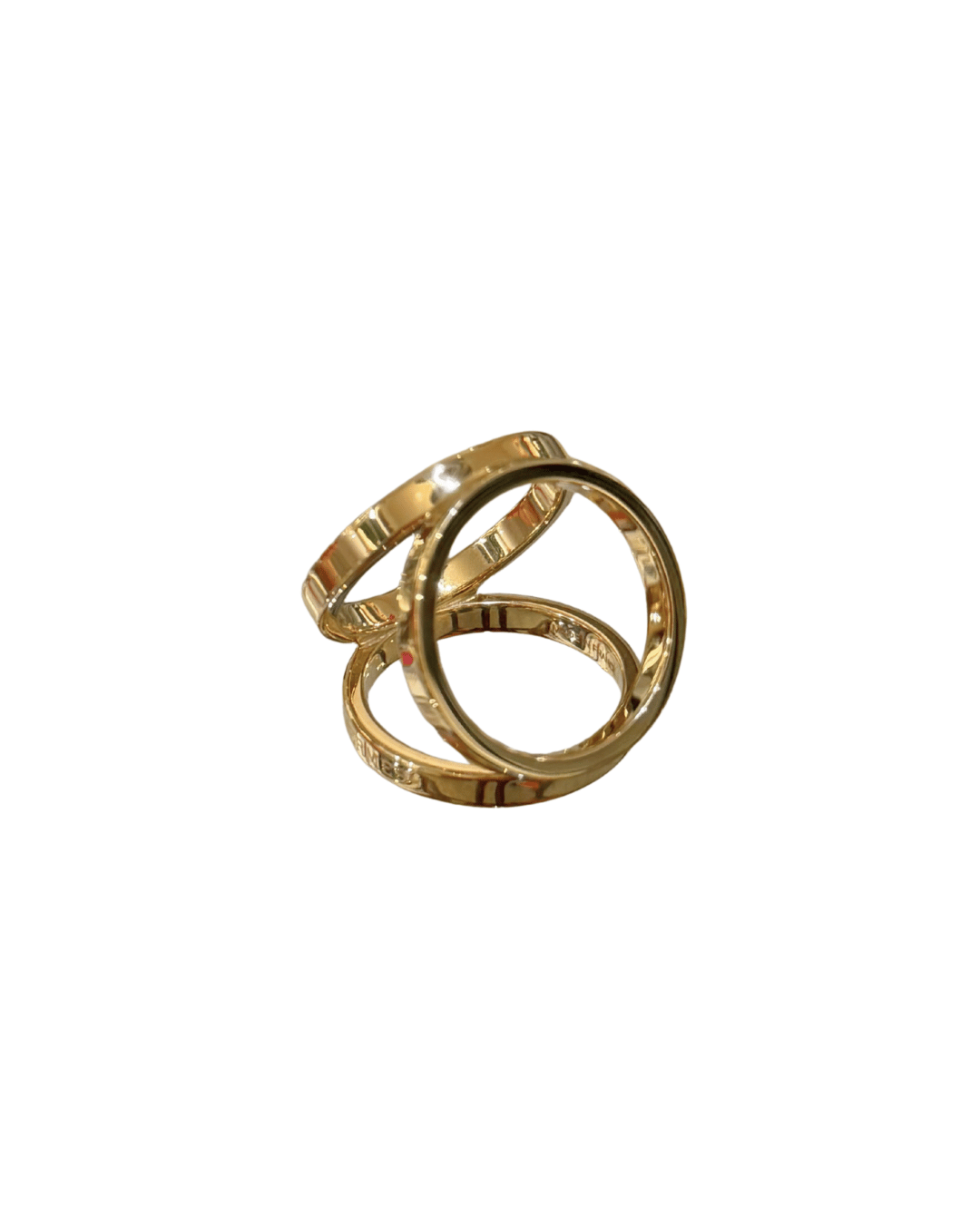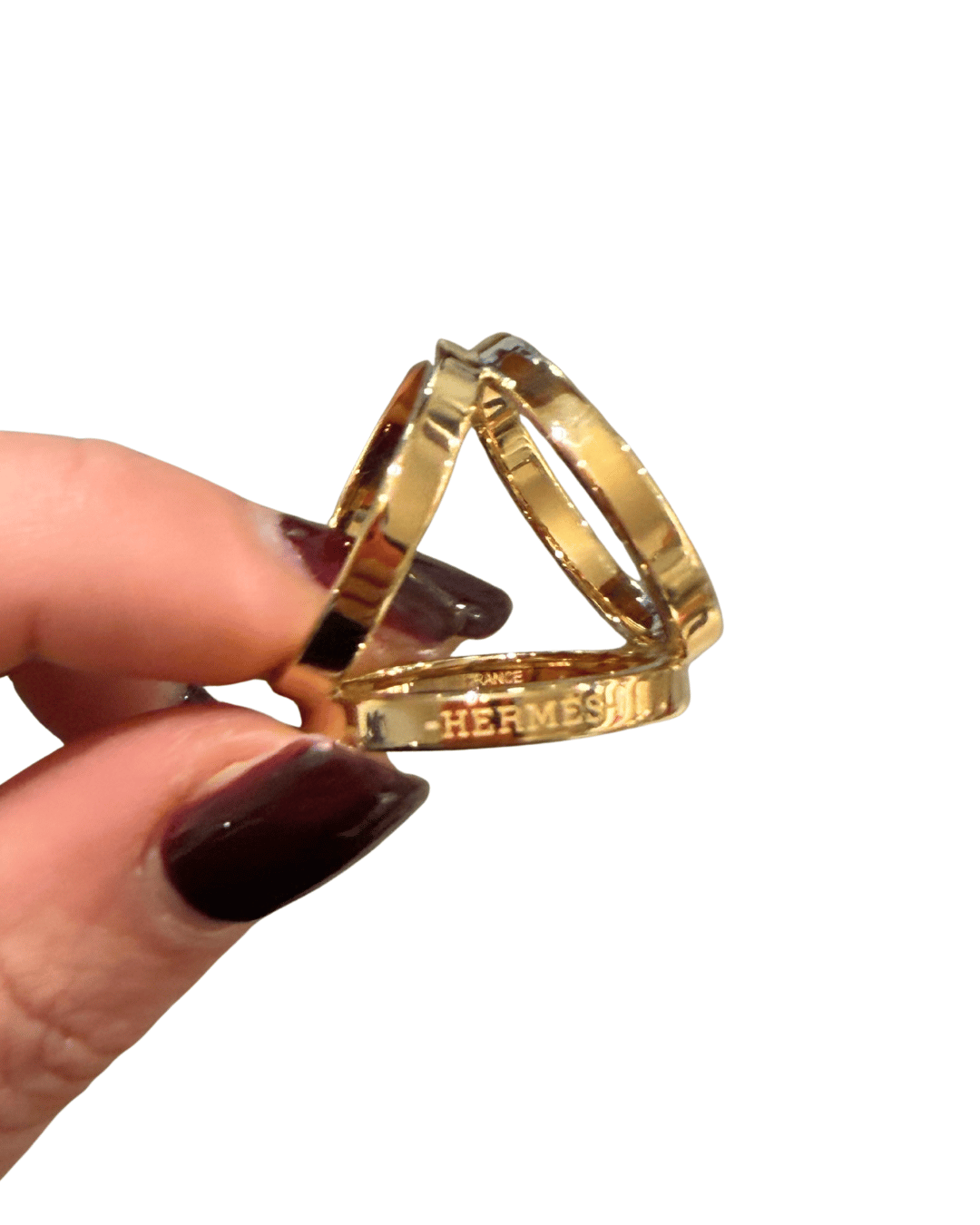 Questo ferma carré Hermès in metallo dorato è il dettaglio perfetto per trasformare un semplice foulard in un gesto di stile assoluto. La struttura geometrica, raffinata e moderna, crea un gioco tridimensionale luminoso e prezioso, rendendolo ideale per fermare un carré al collo, come cintura o anche come elemento decorativo su borse e accessori.