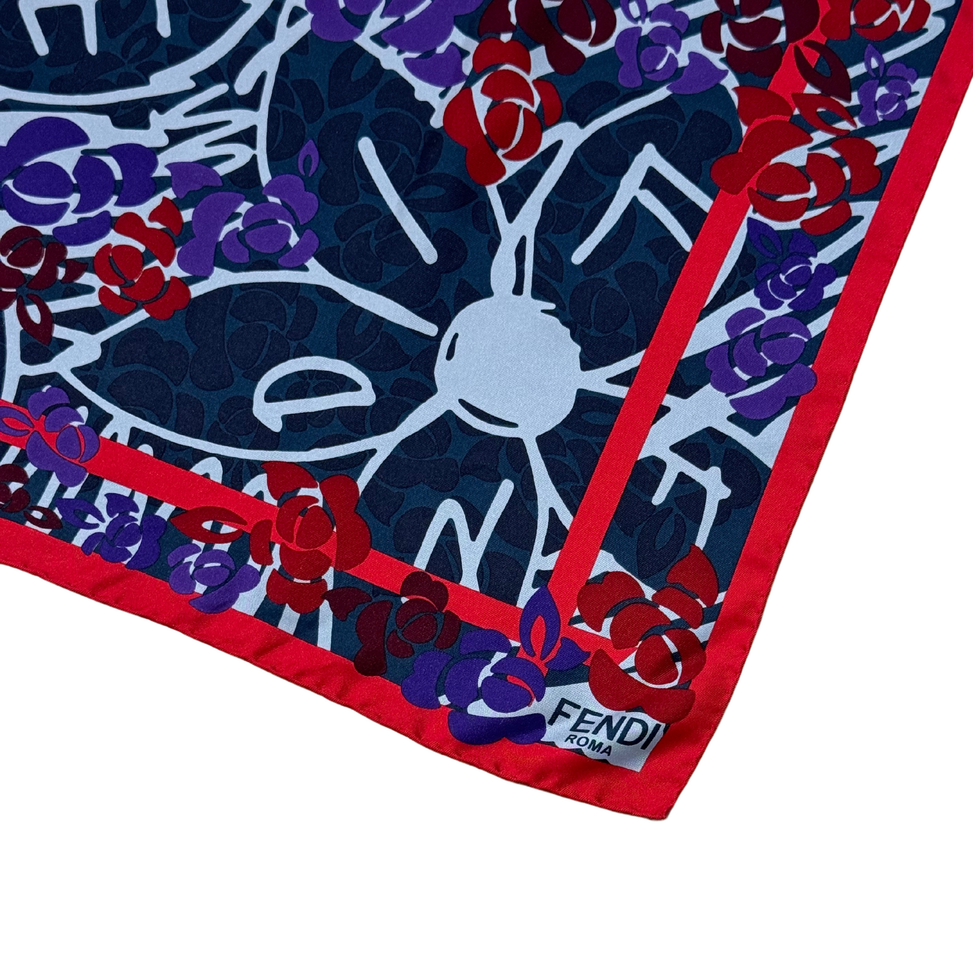 Foulard di Fendi impreziosito da margherite blu con lettere all'intento dei petali. Perimetro rosso. 100% seta