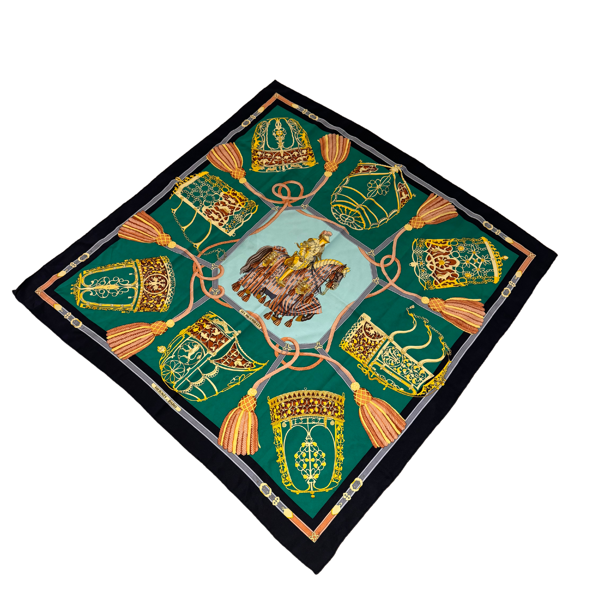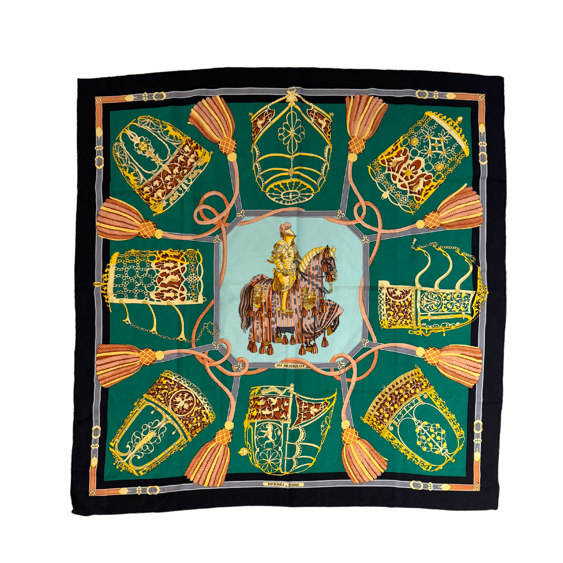 Foulard Hermes "Les Muserolles " , disegnato di Christiane Vauzelles. Edizione 1986. Al centro cavaliera con armatura su sfondo azzurro. Intorno motivo di museruole dorate su sfondo verde. Perimetro nero. 100%seta.