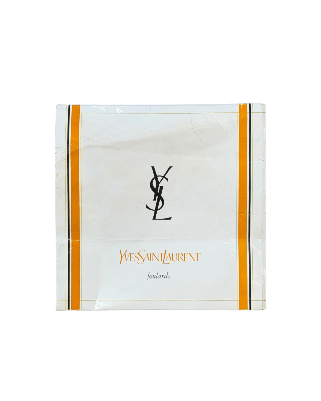 Un foulard d’archivio che profuma di storia e di eleganza francese. Questo splendido foulard Yves Saint Laurent, realizzato in 100% seta pura, appartiene alla linea storica “foulards” della Maison, riconoscibile anche dalla sua confezione originale d’epoca. Il motivo è vivace e giocoso: una pioggia di piccole forme colorate su un intenso sfondo blu cobalto, un mix che racconta perfettamente l’anima artistica e audace di YSL. Le finiture in verde smeraldo aggiungono un tocco raffinato e completano l’equilibrio cromatico. La seta è leggera, fresca e piacevolissima da indossare, perfetta sia annodata al collo con un look minimal, sia portata lunga come accessorio protagonista.