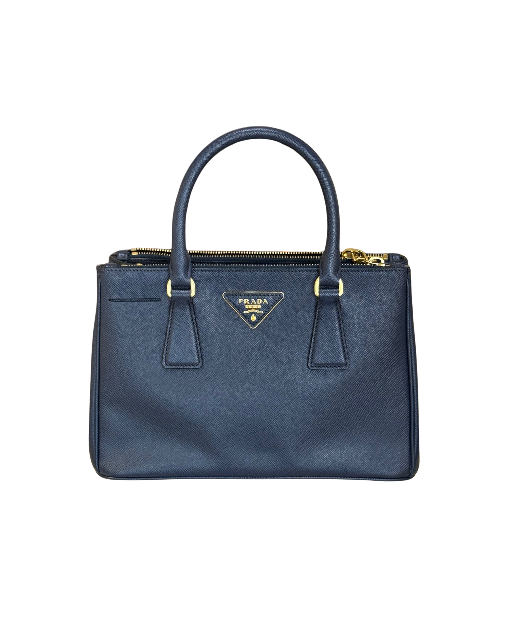 Galleria di Prada small realizzata in pelle saffiano blu navy. Logo lettering frontale. Doppi manici in pelle e tracolla regolabile ed amovibile che consente di indossarla a tracolla. Interno suddiviso in tre scomparti, quelli esterni chiusura con cerniera. Fodera interna logata tono su tono. Bottoni laterali che consentono di ampliare le dimensioni della borsa. Quattro piedini d'appoggio. Metalleria dorata.