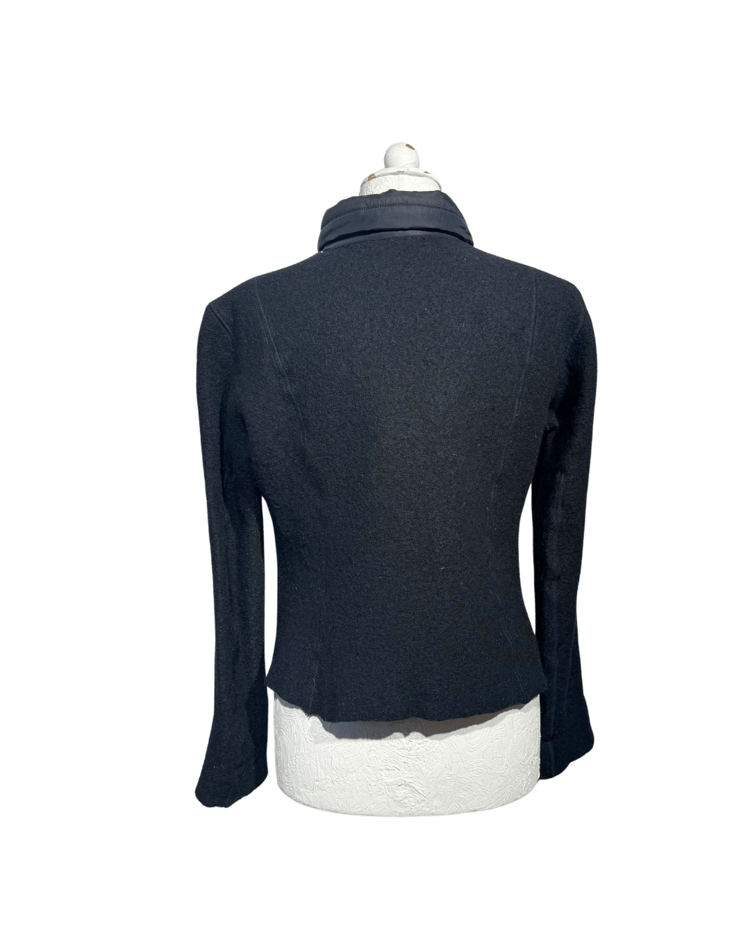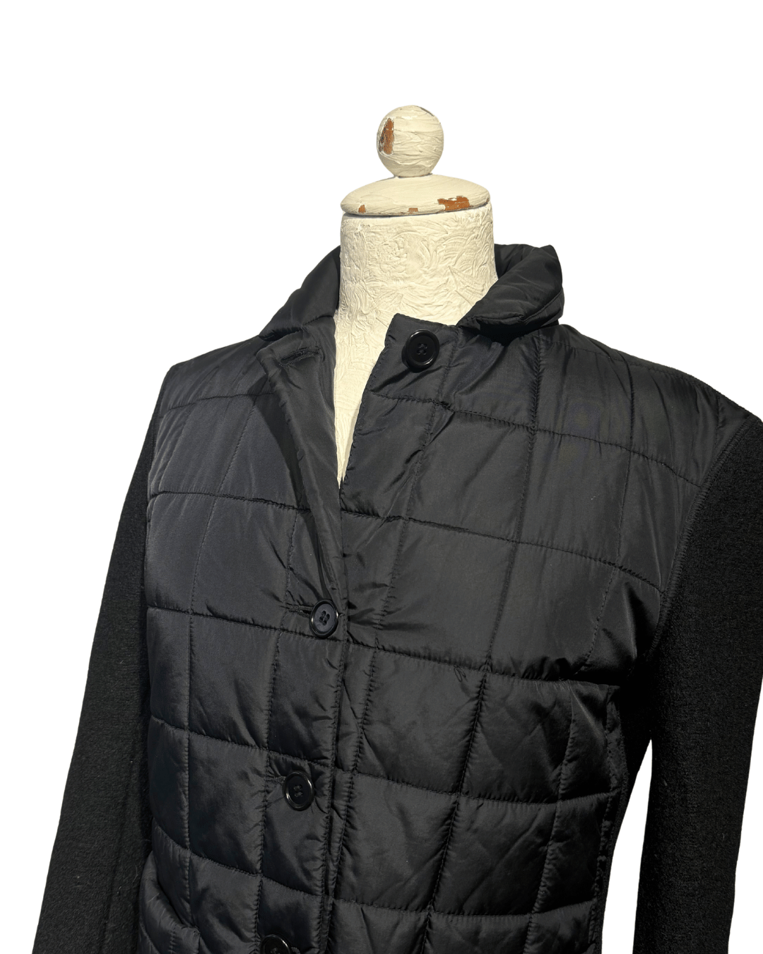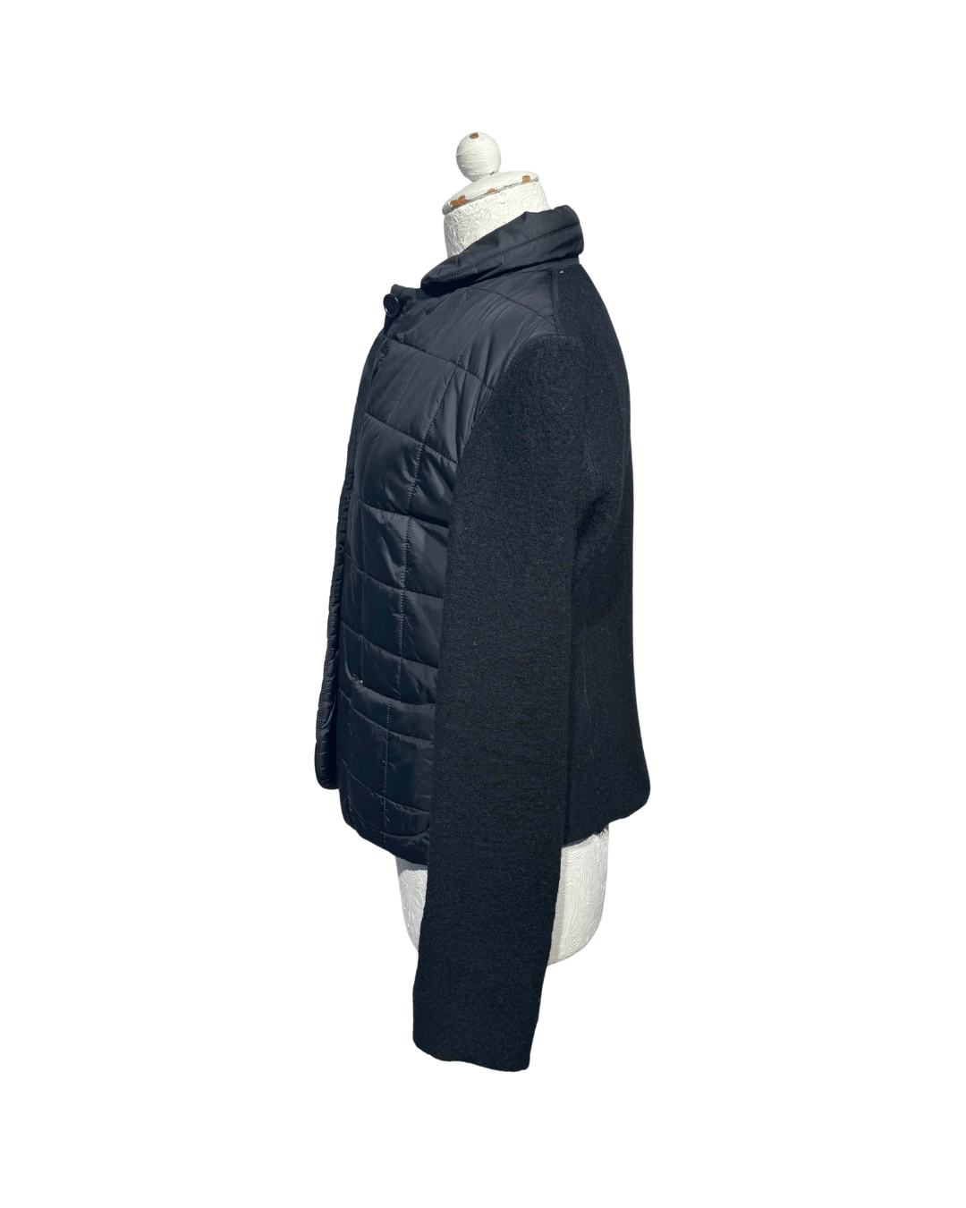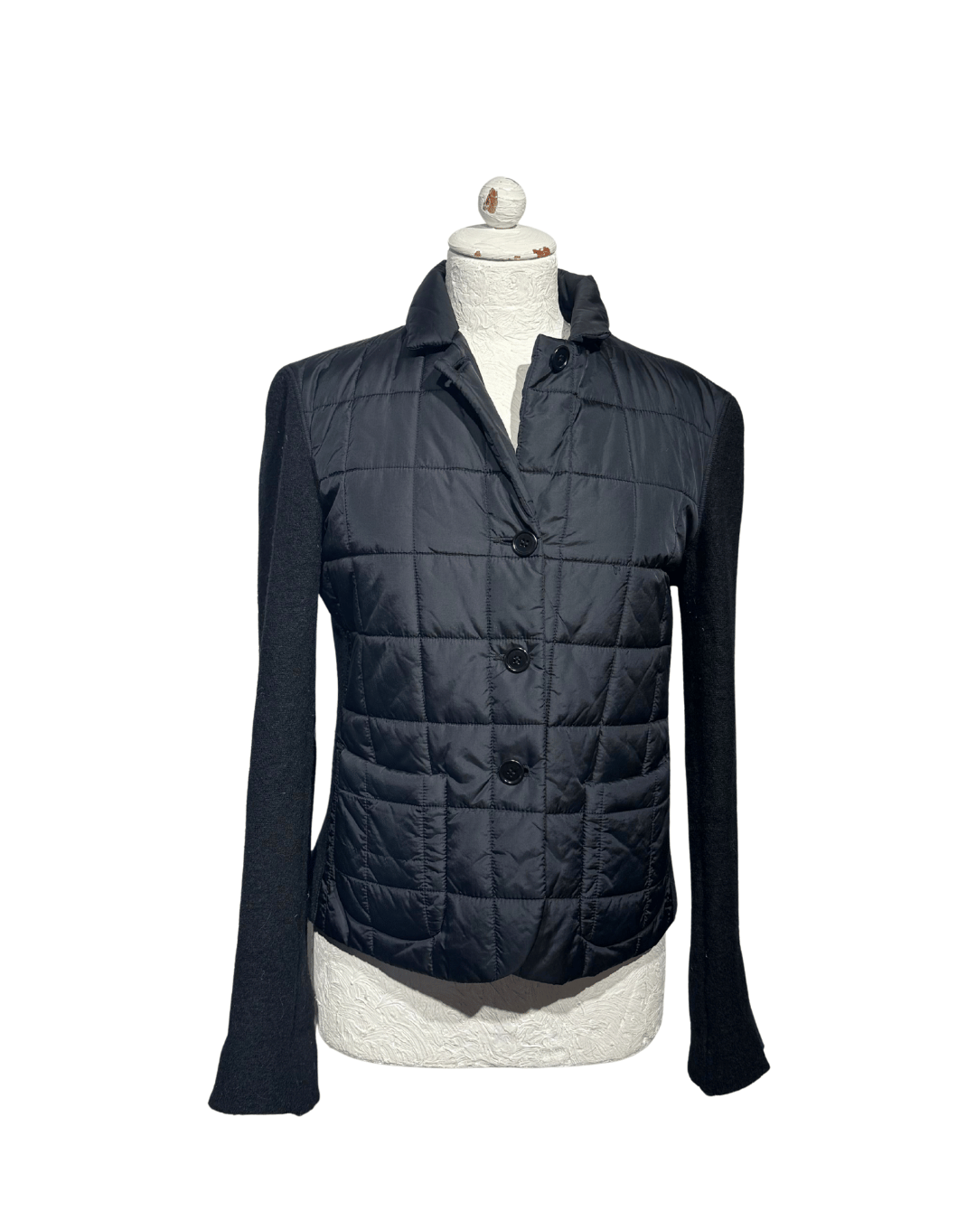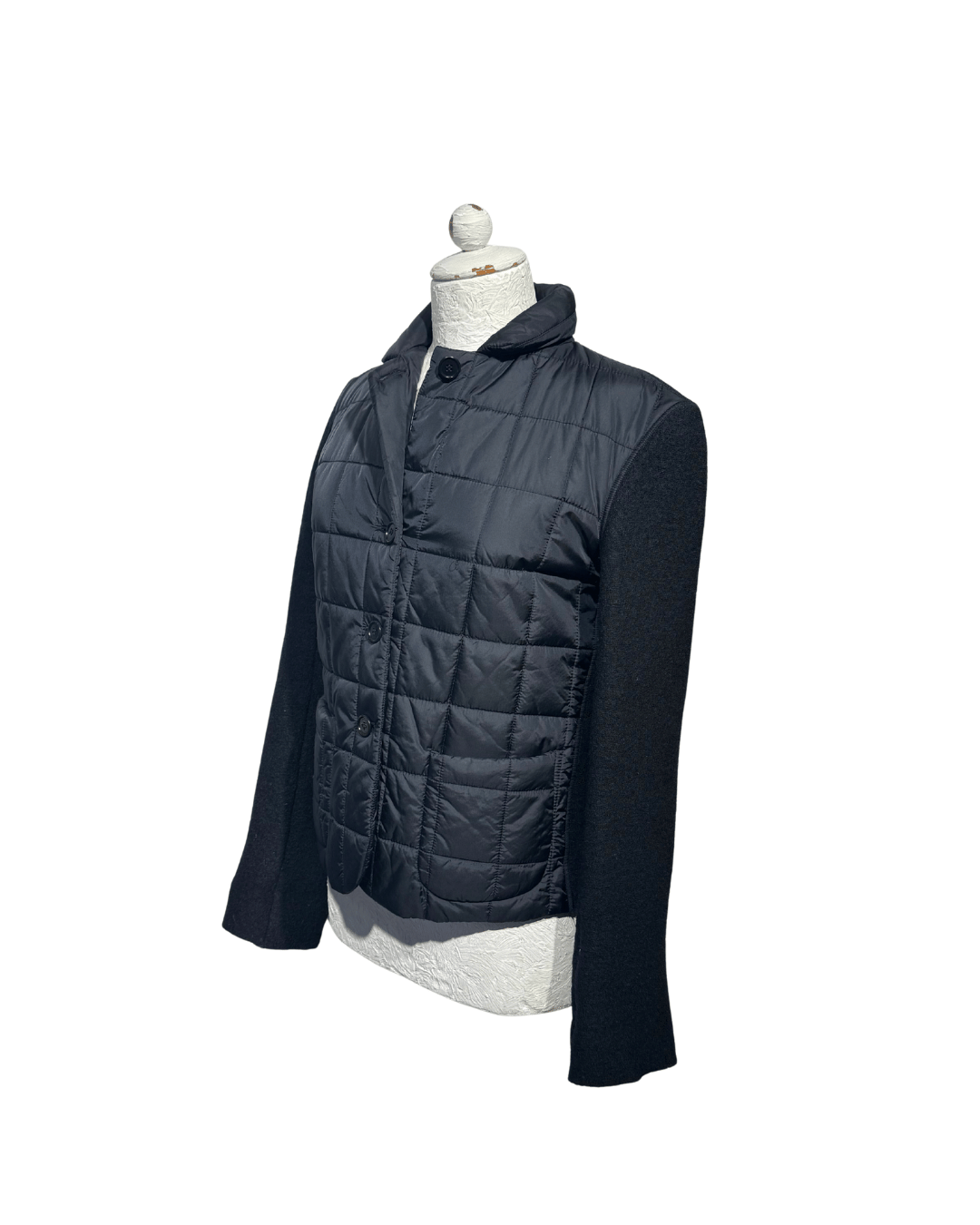 Giacca Aspesi dallo stile pulito e sofisticato, perfetta per le mezze stagioni. Realizzata in misto materiali, combina la leggerezza del nylon trapuntato sul davanti con la morbidezza della lana sulle maniche e sul retro. L’imbottitura Thermore garantisce un ottimo comfort termico senza rinunciare alla vestibilità femminile e asciutta tipica del brand.