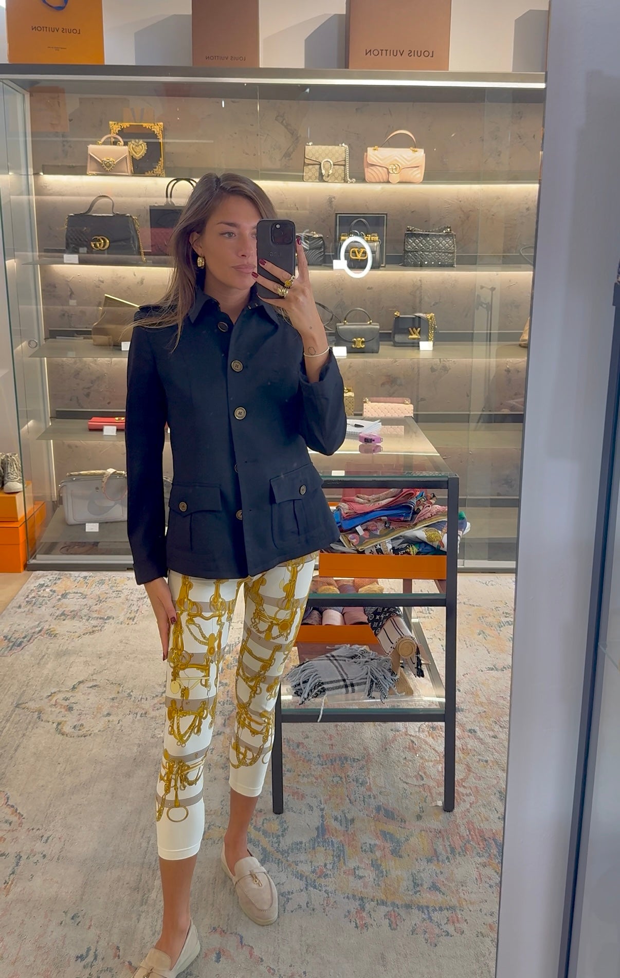 Chiusura frontale a bottoni, collo a camicia e dettagli iconici tipici del brand.