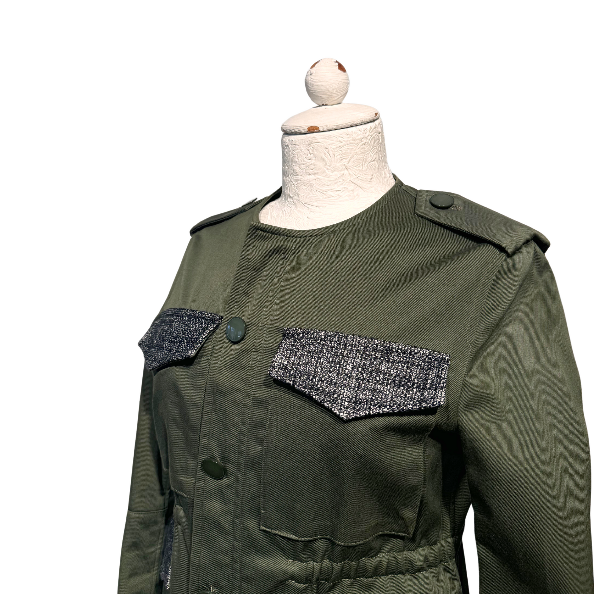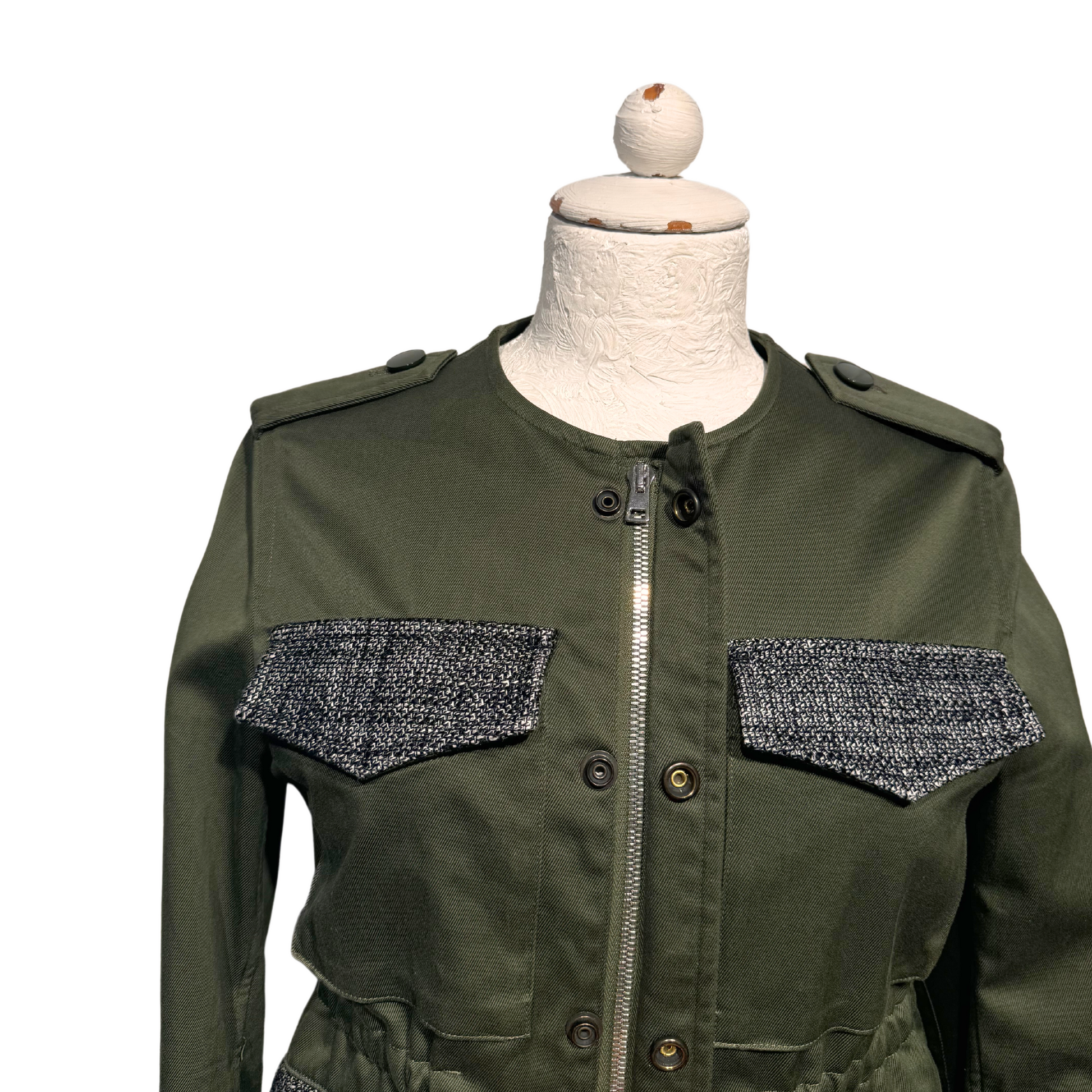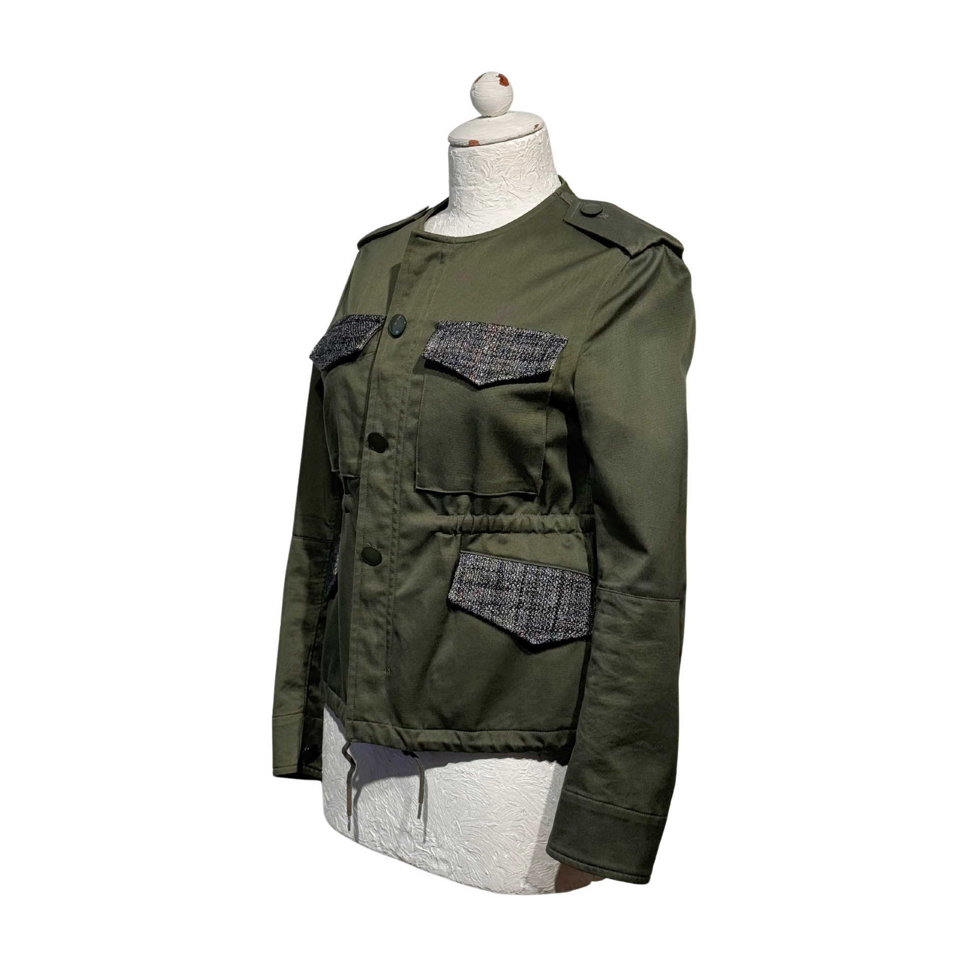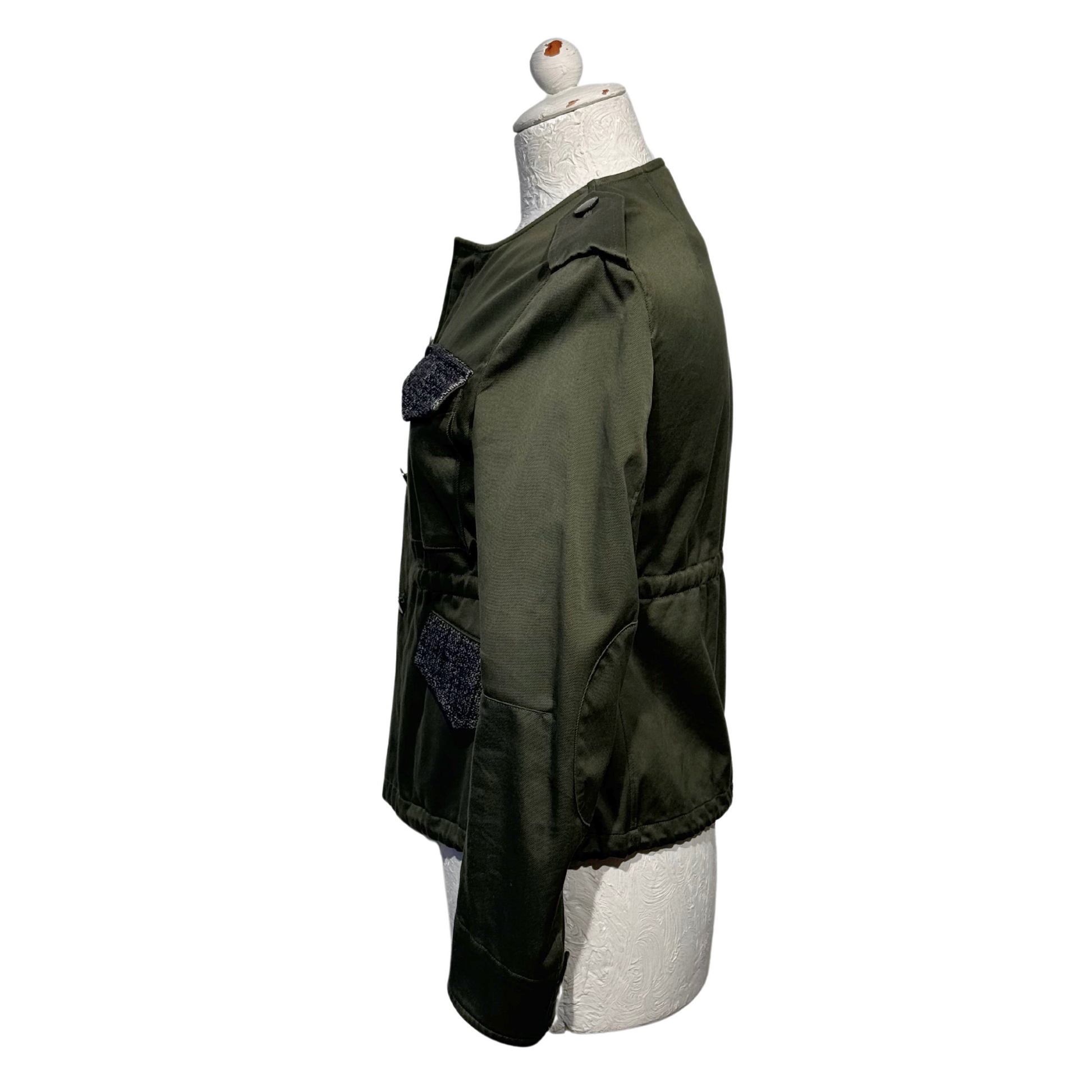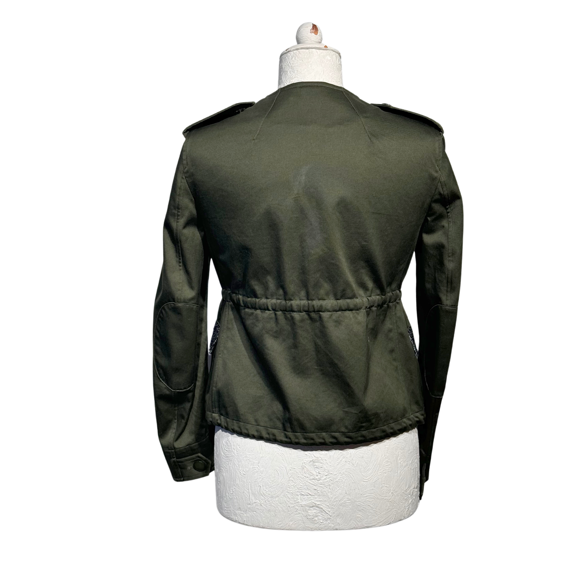 Giacca Golden Goose verde scuro , tasche impreziosite da inserto in tessuto grigio. Coulisse in corrispondenza della vita. Apertura frontale con cerniera e bottoni.
