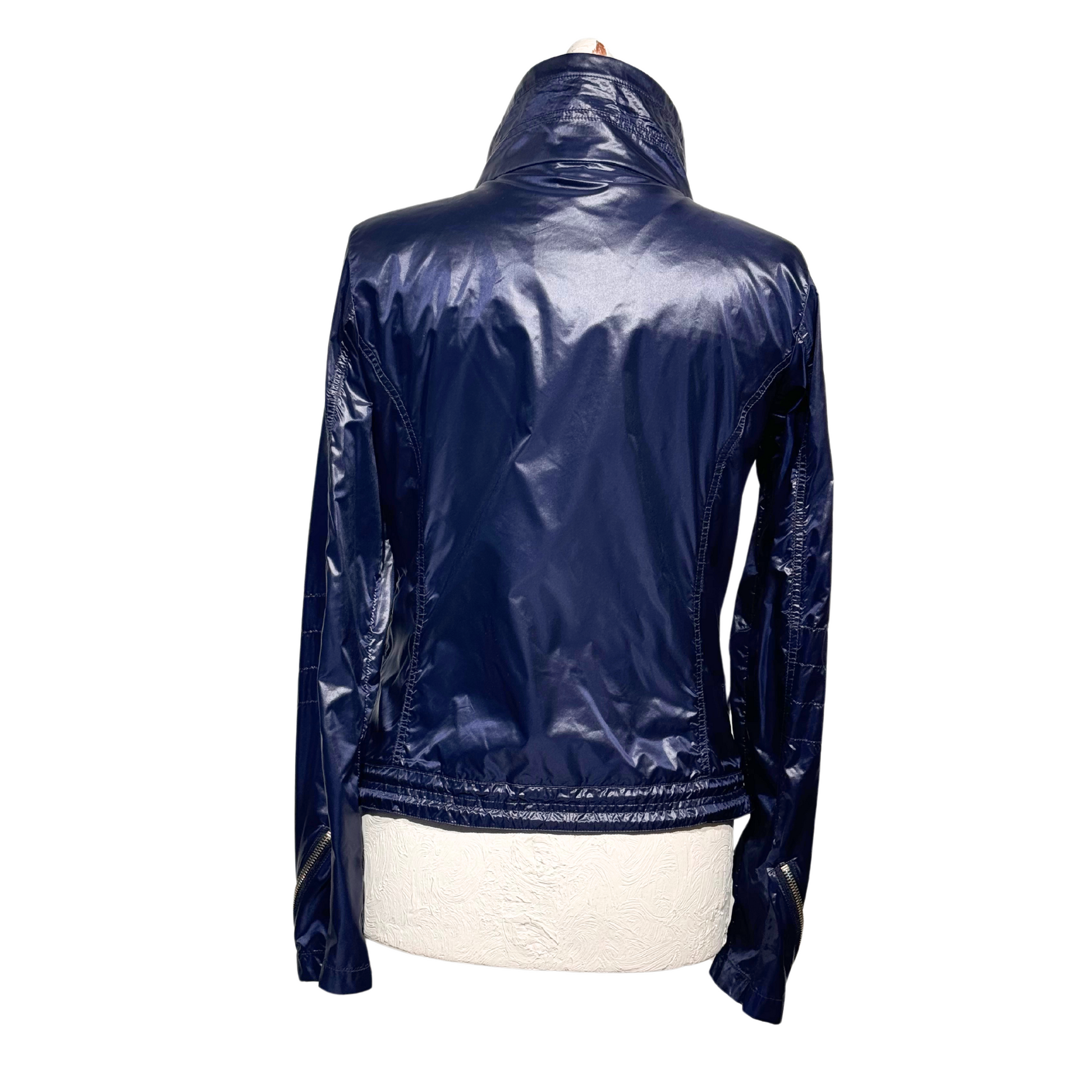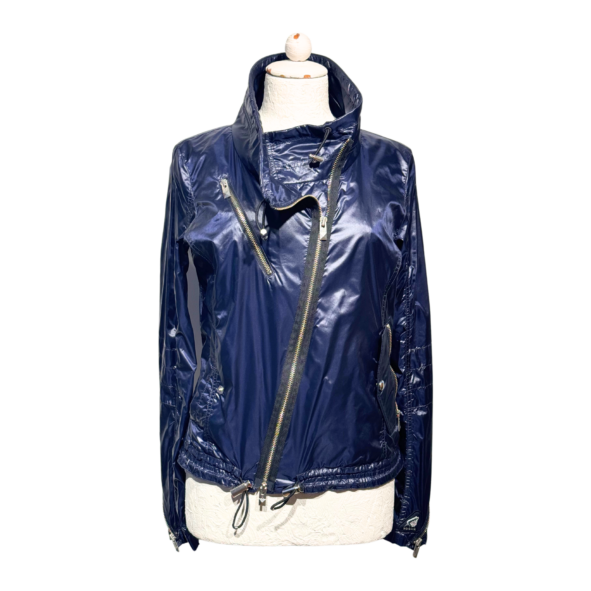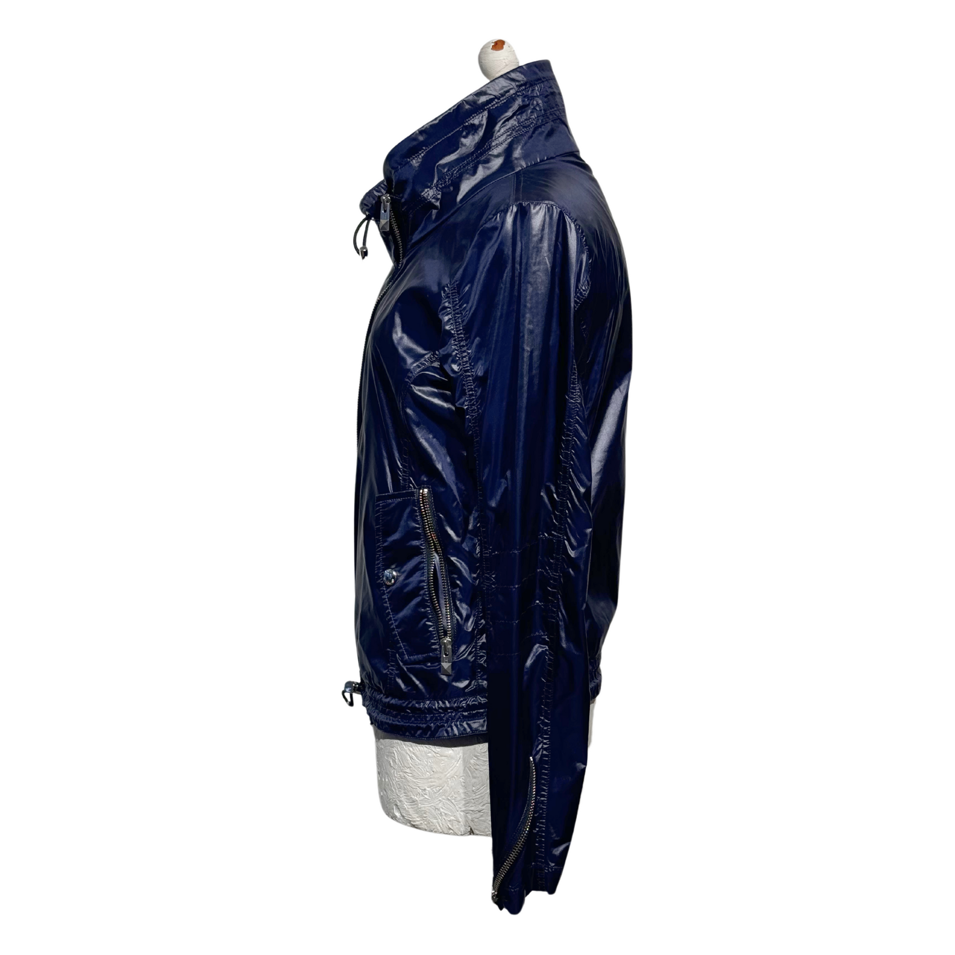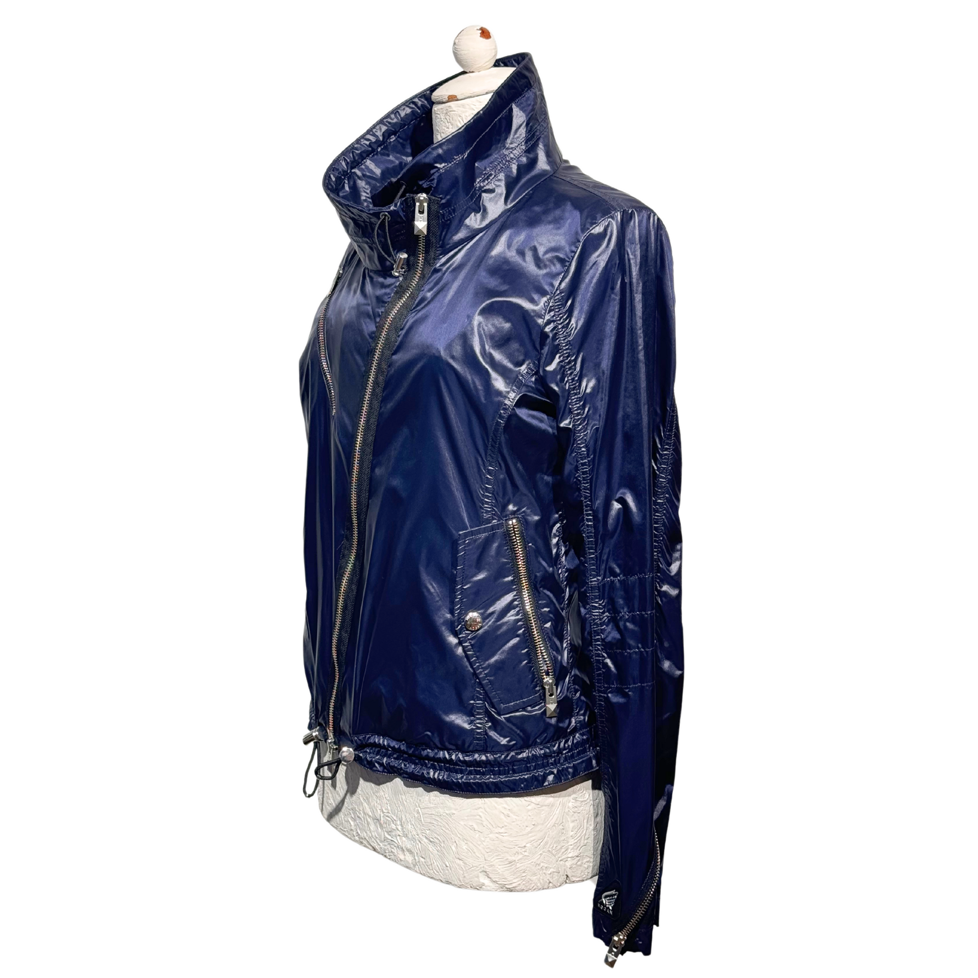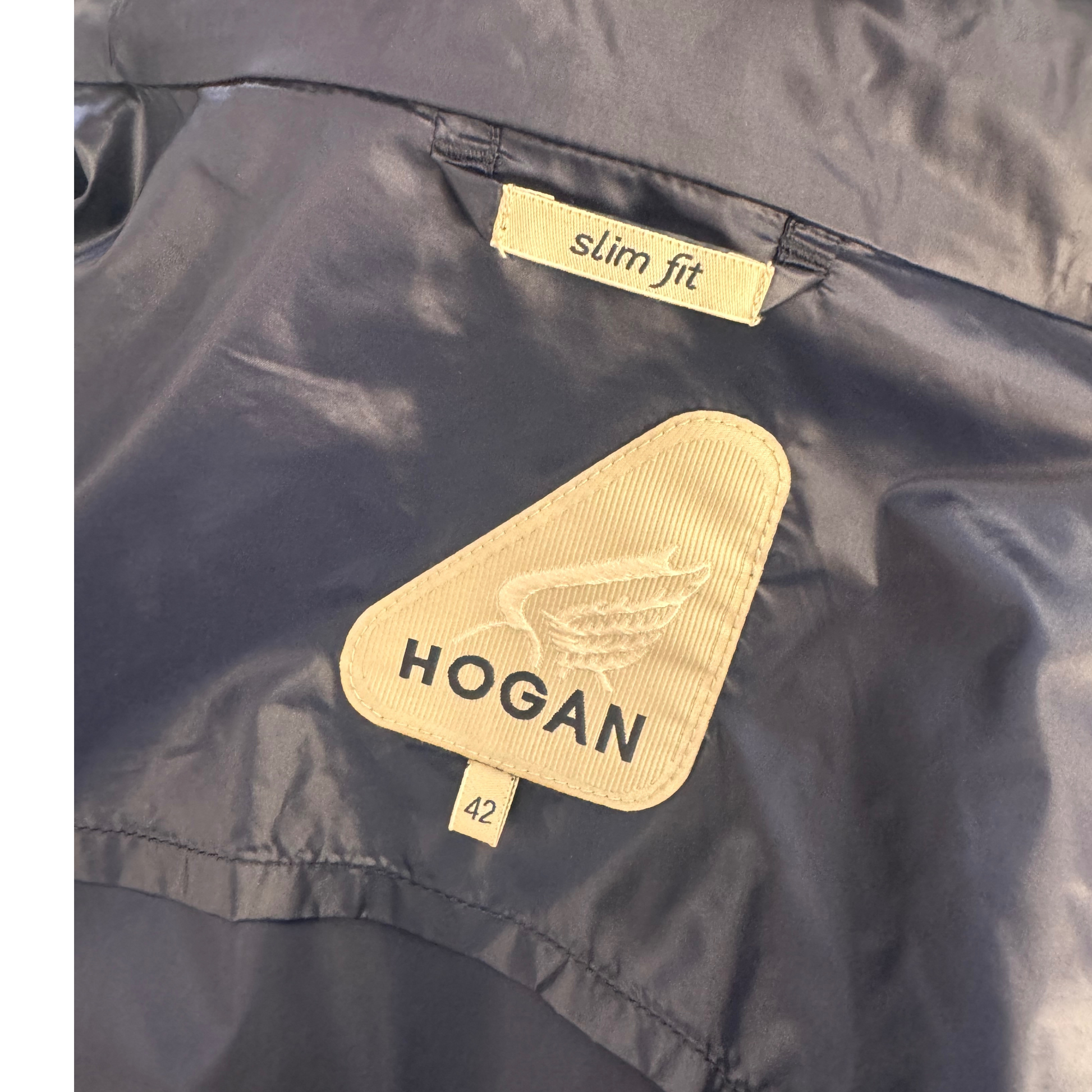 Giacca impermeabile Hogan blu metallizzato. Apertura frontale con cerniera, cerniera anche in corrispondenza degli tasche e delle maniche. Metalleria argentata. Laccetti in corrispondenza della vita che consentono di stringerla per non far trapassare l'aria.