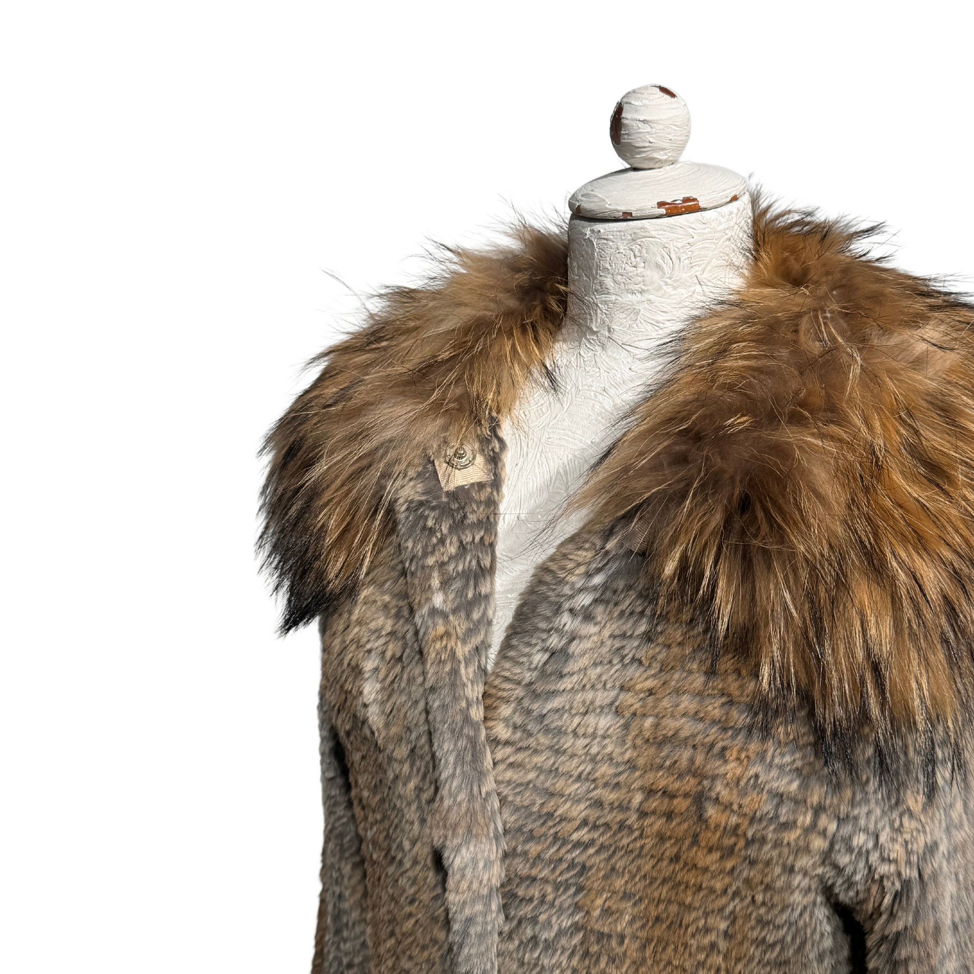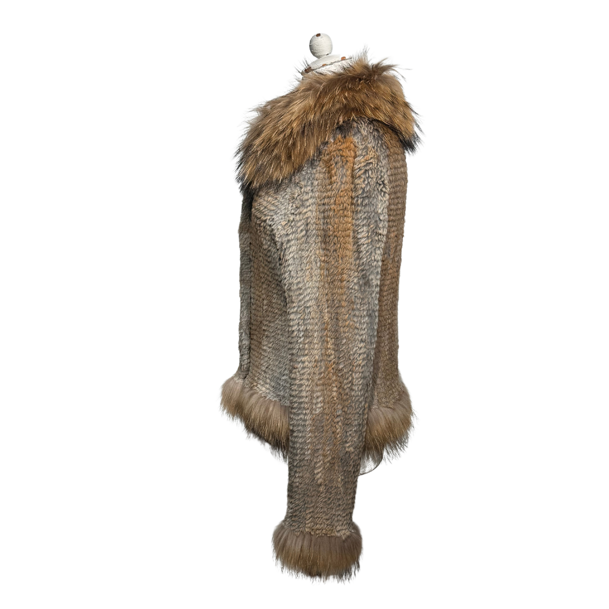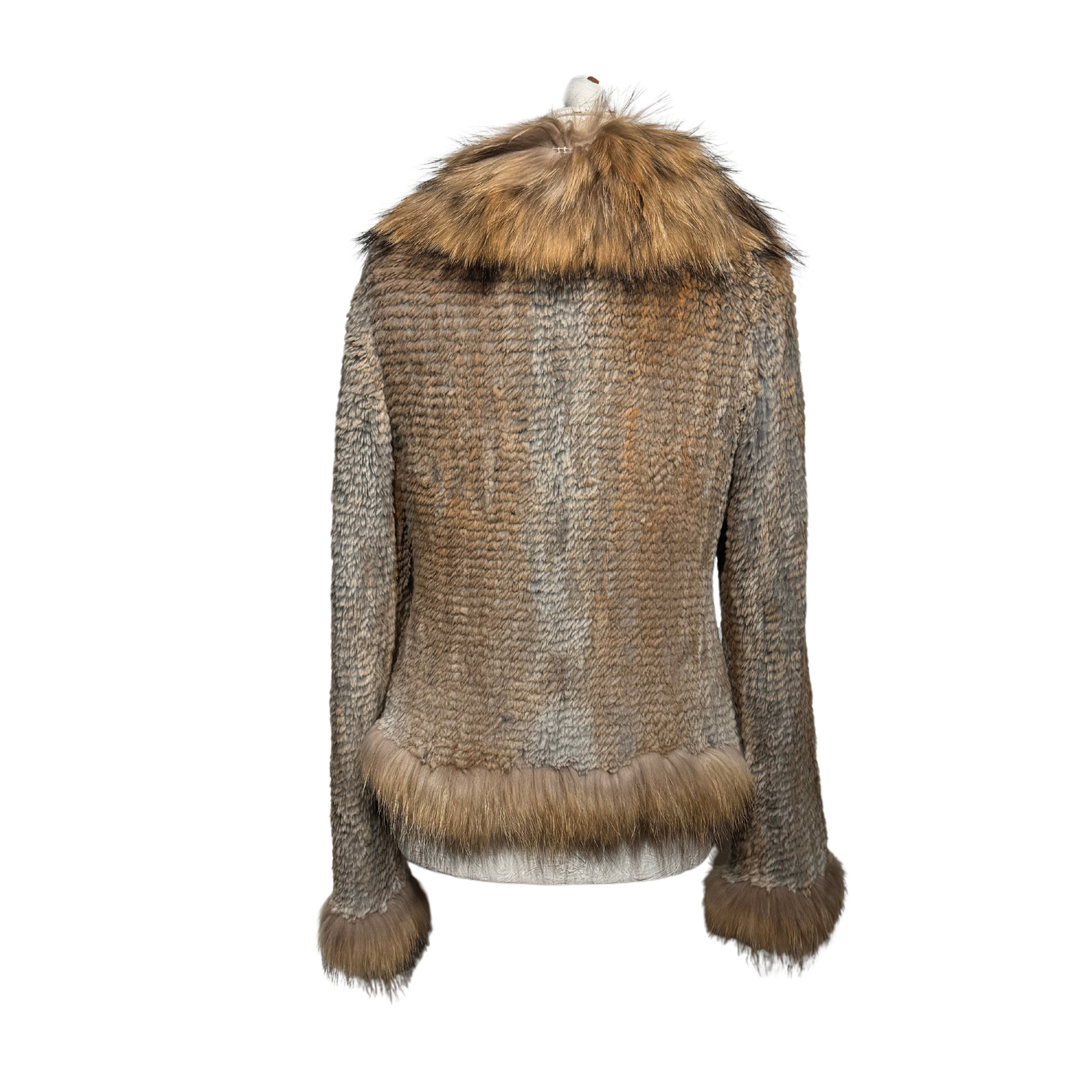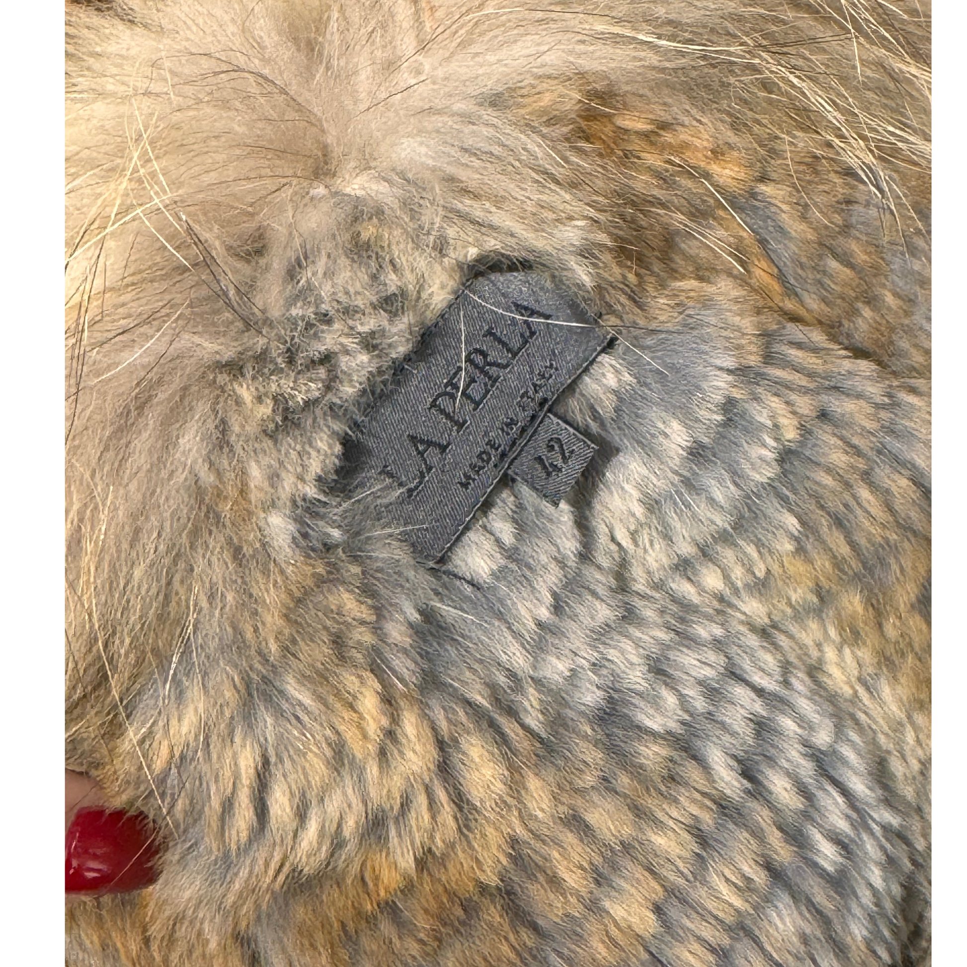 Giacchina LA PERLA in Lapin intrecciato. Impreziosita da pelo di volpe in corrispondenza del collo, della vita e dei polsini. Apertura frontale con ganci.