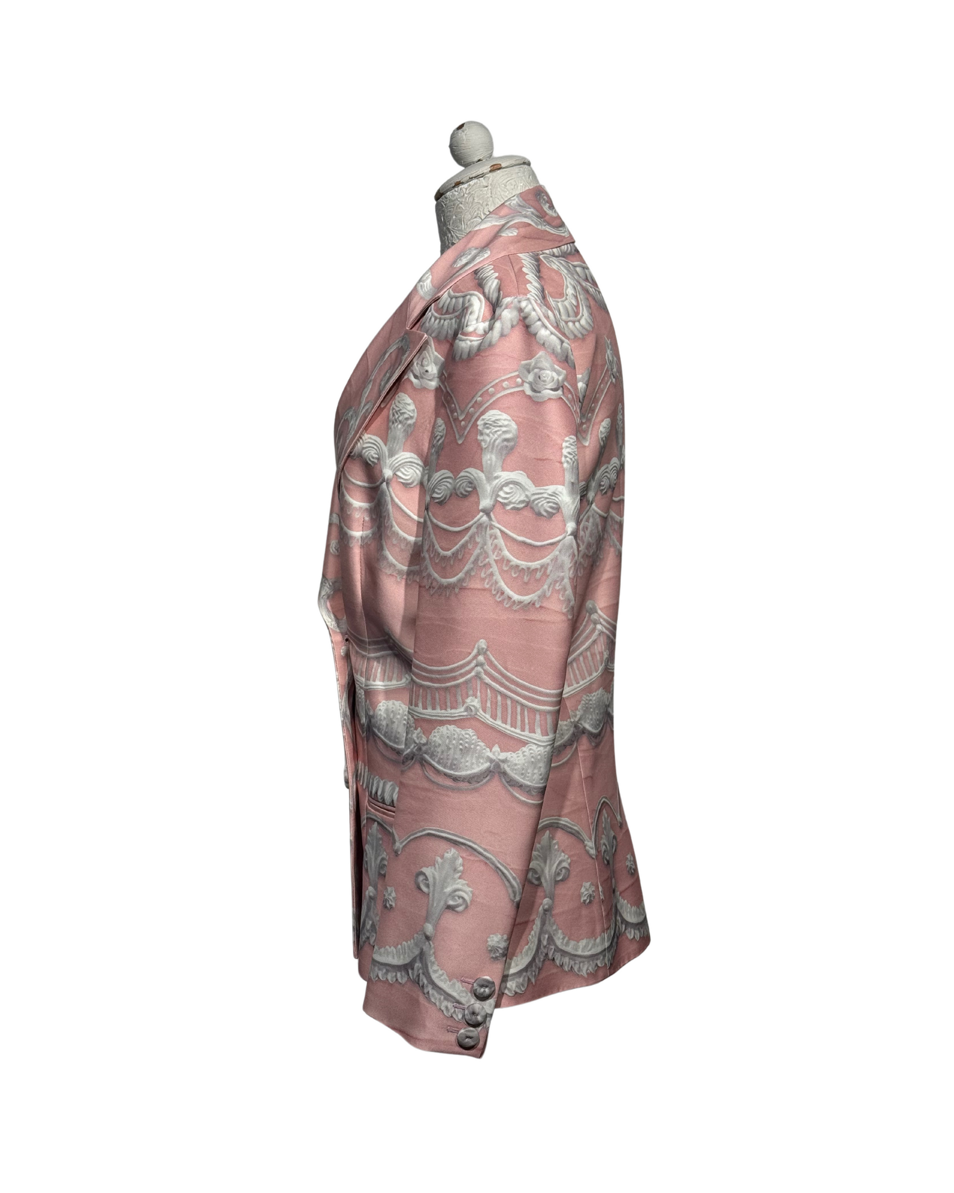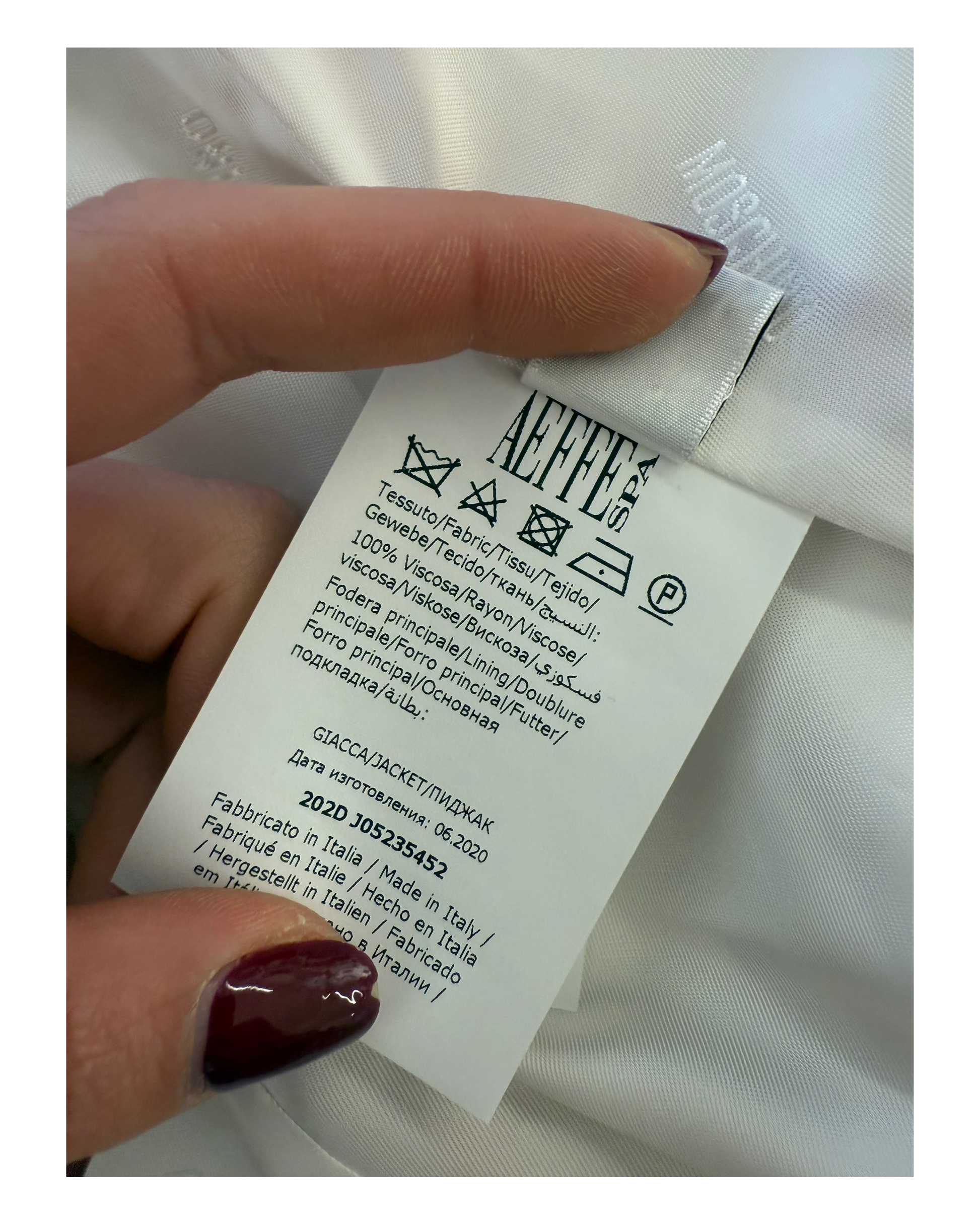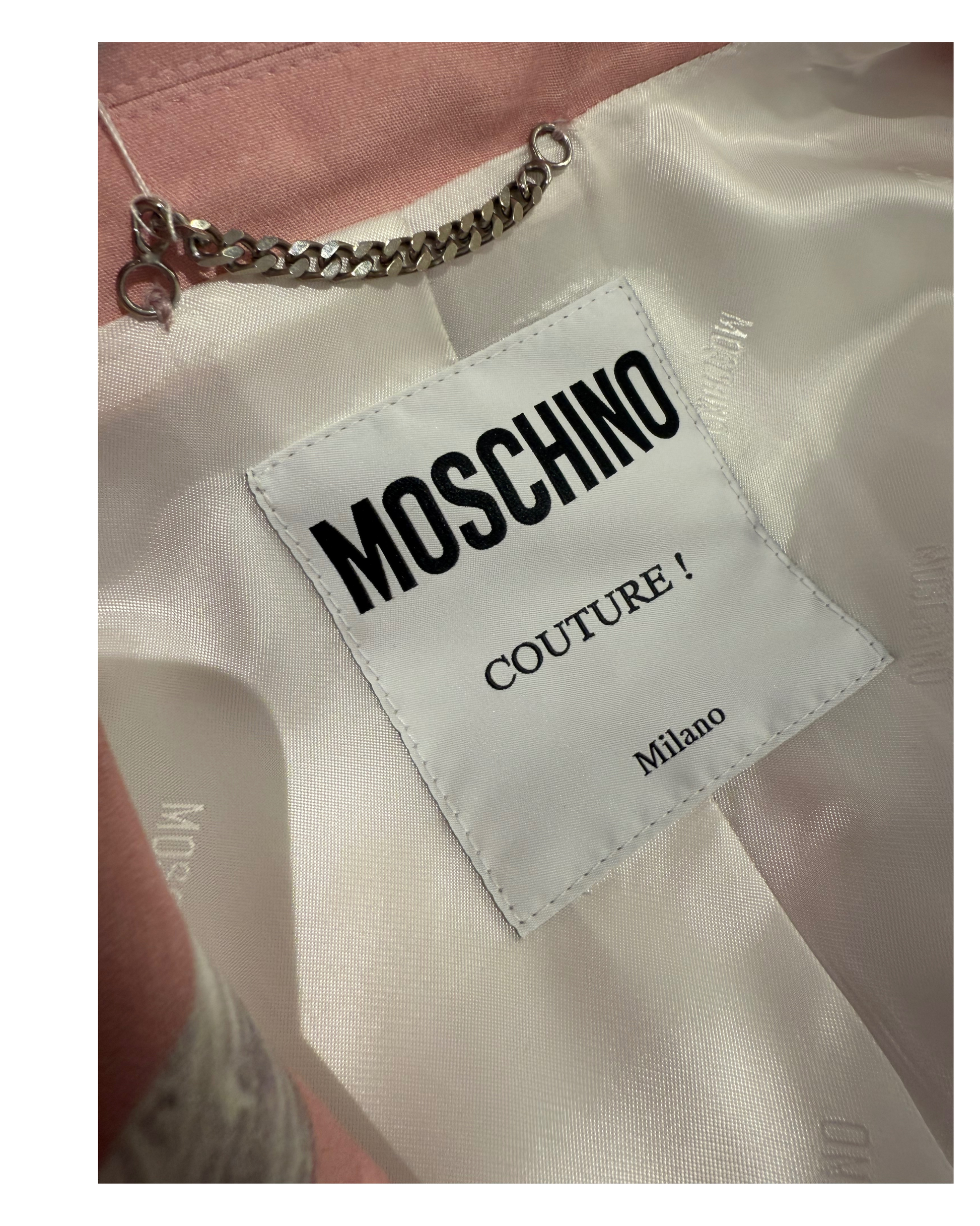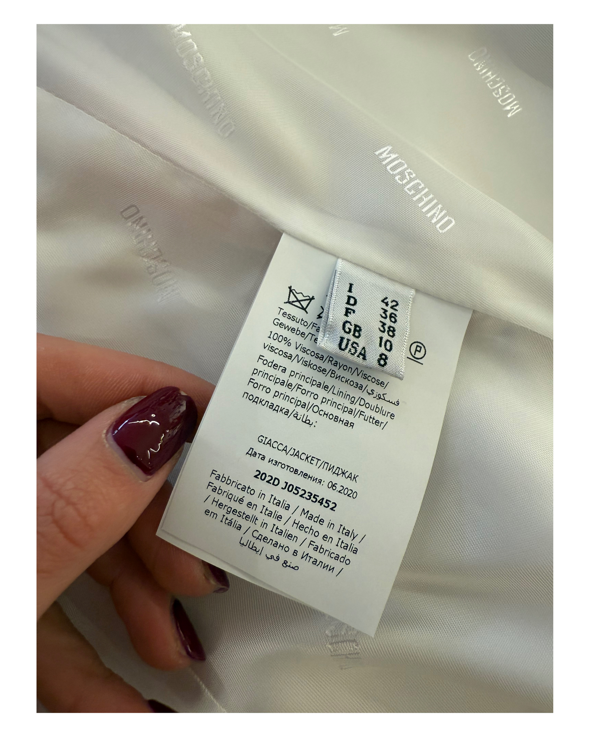 Giacca Moschino in viscosa rosa chiaro con trama argento/bianca. Apertura frontale con quattro bottoni rivestiti in tessuto. Bottoni in corrispondenza delle maniche. Sfiancata. Interno in tessuto bianco logato.