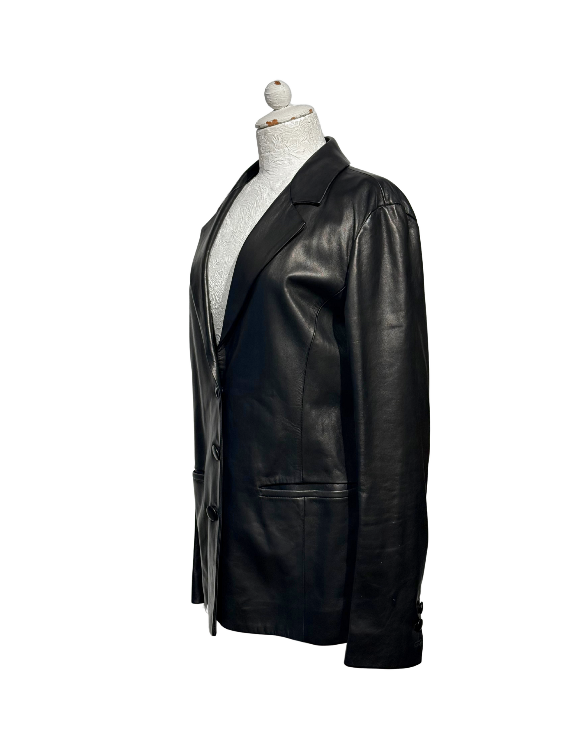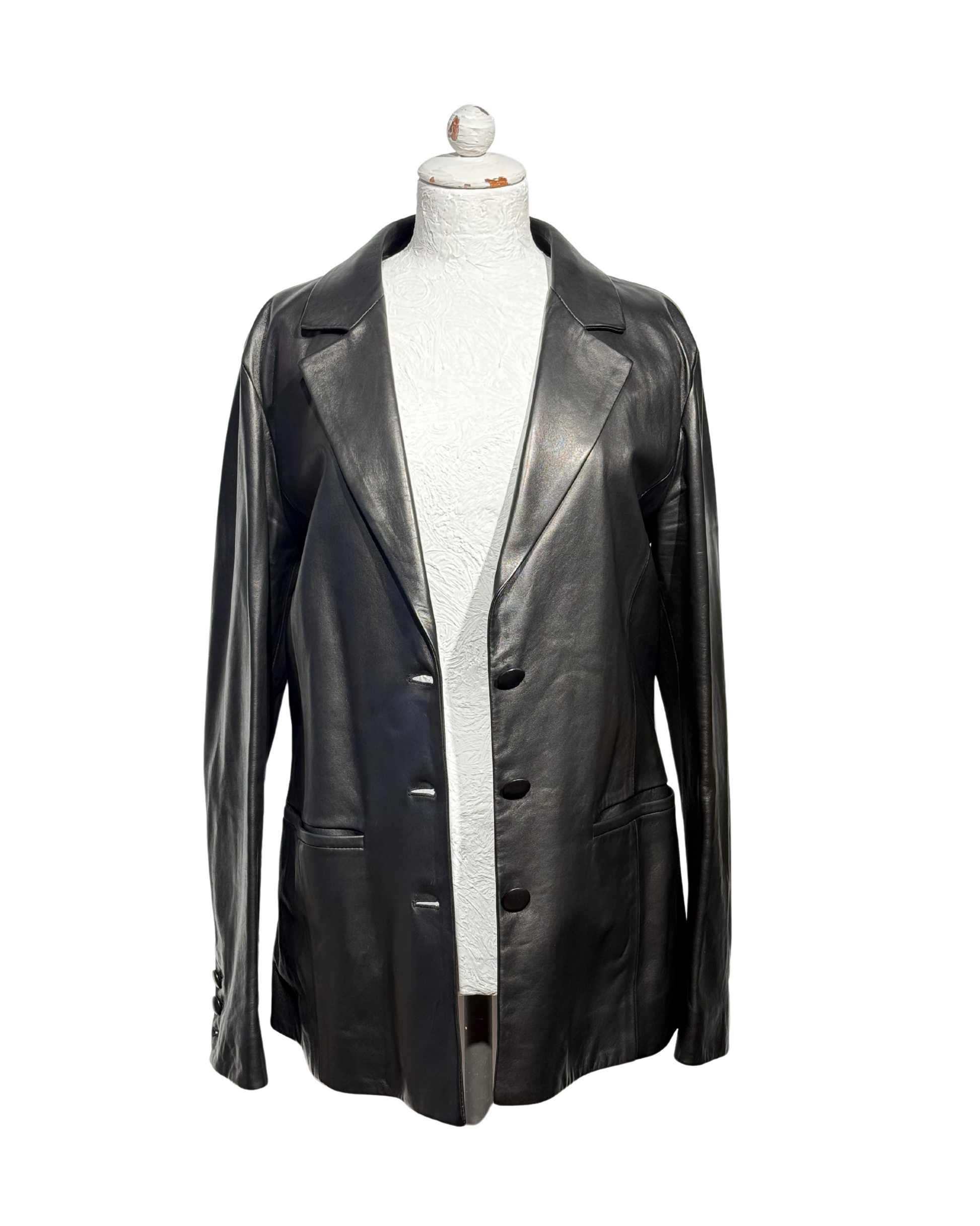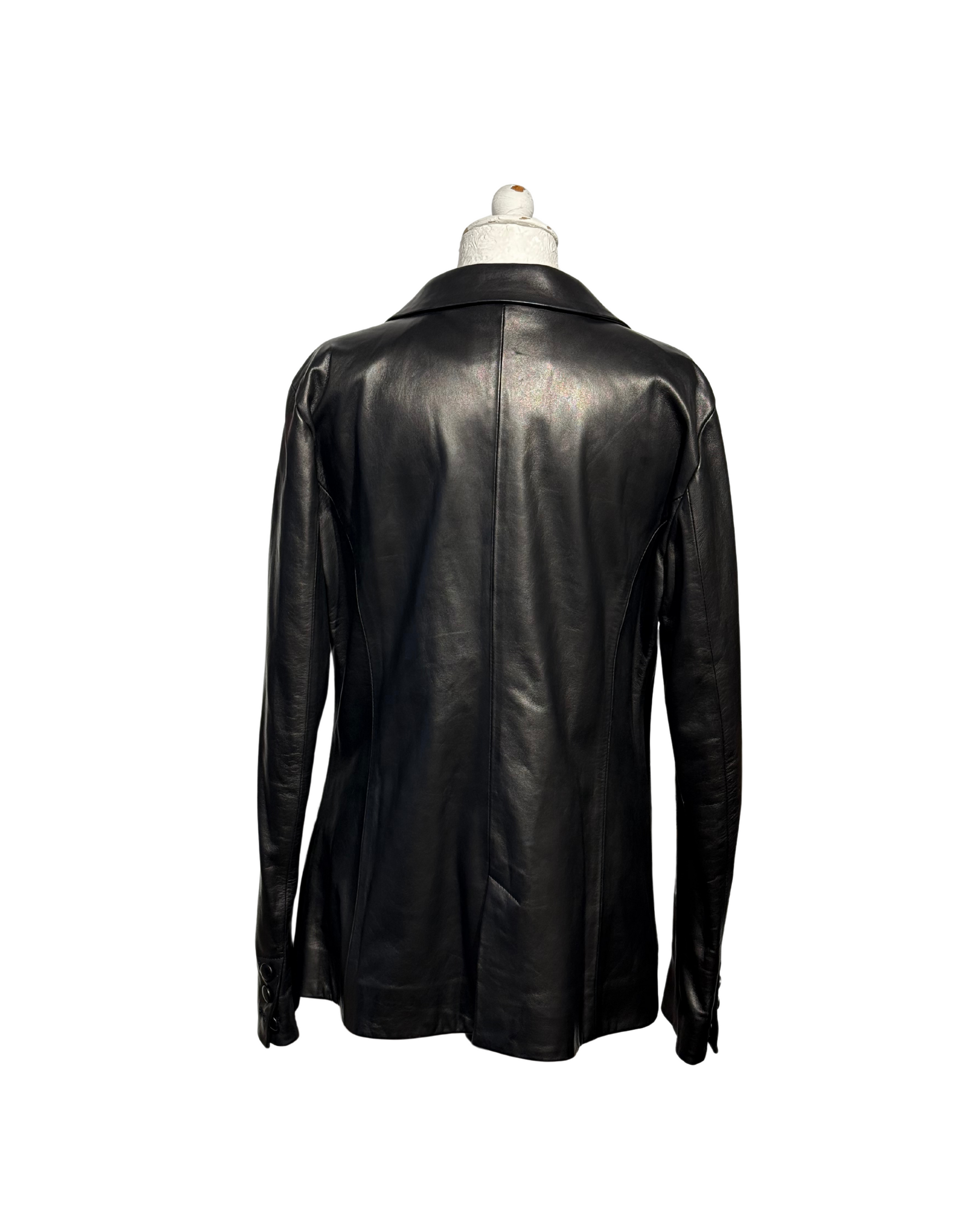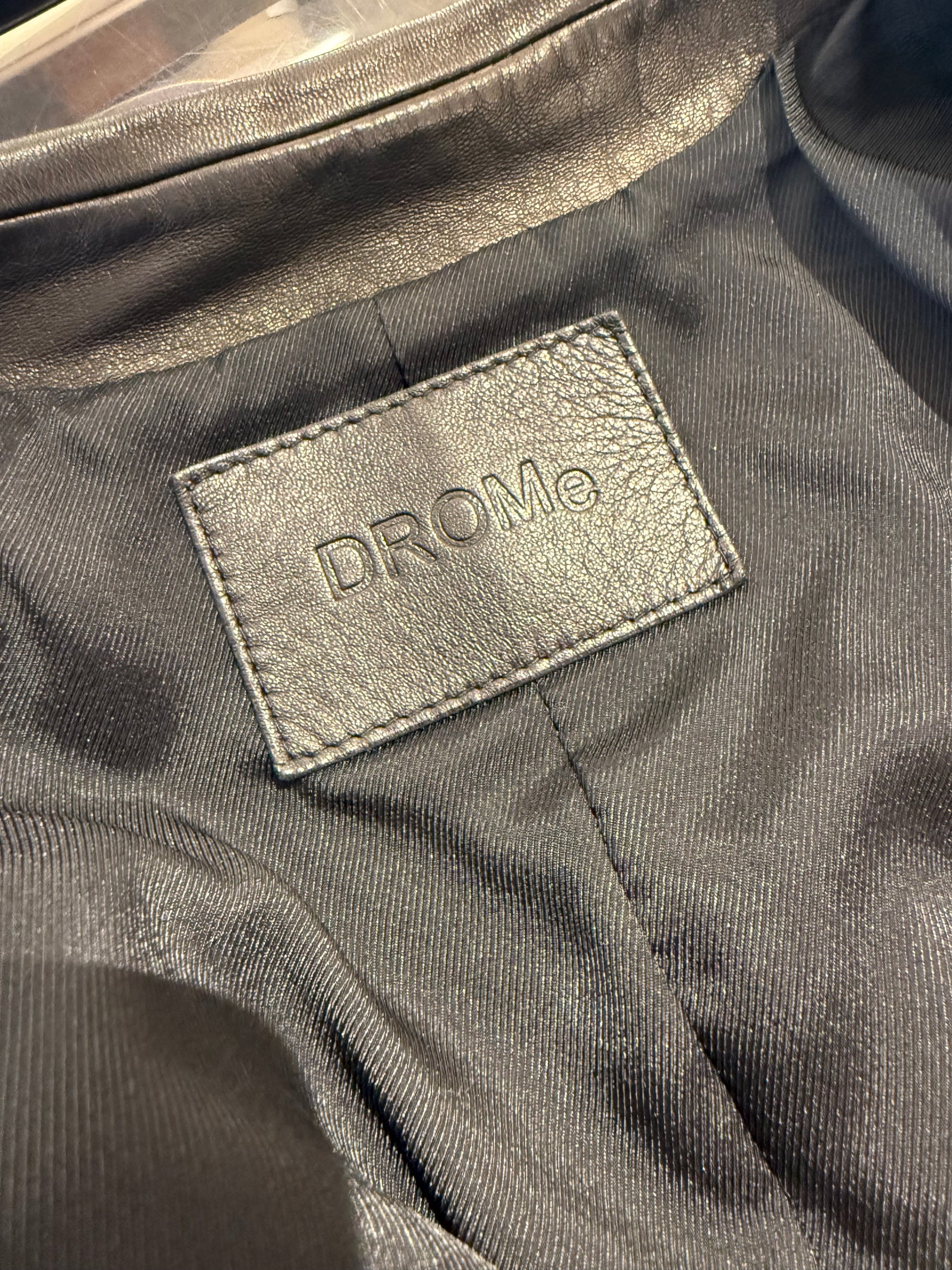 Giacca DROMe in pelle di agnello nera morbidissima. Apertura frontale con maxibottoni. Tasche laterali. Interno fodera nera.