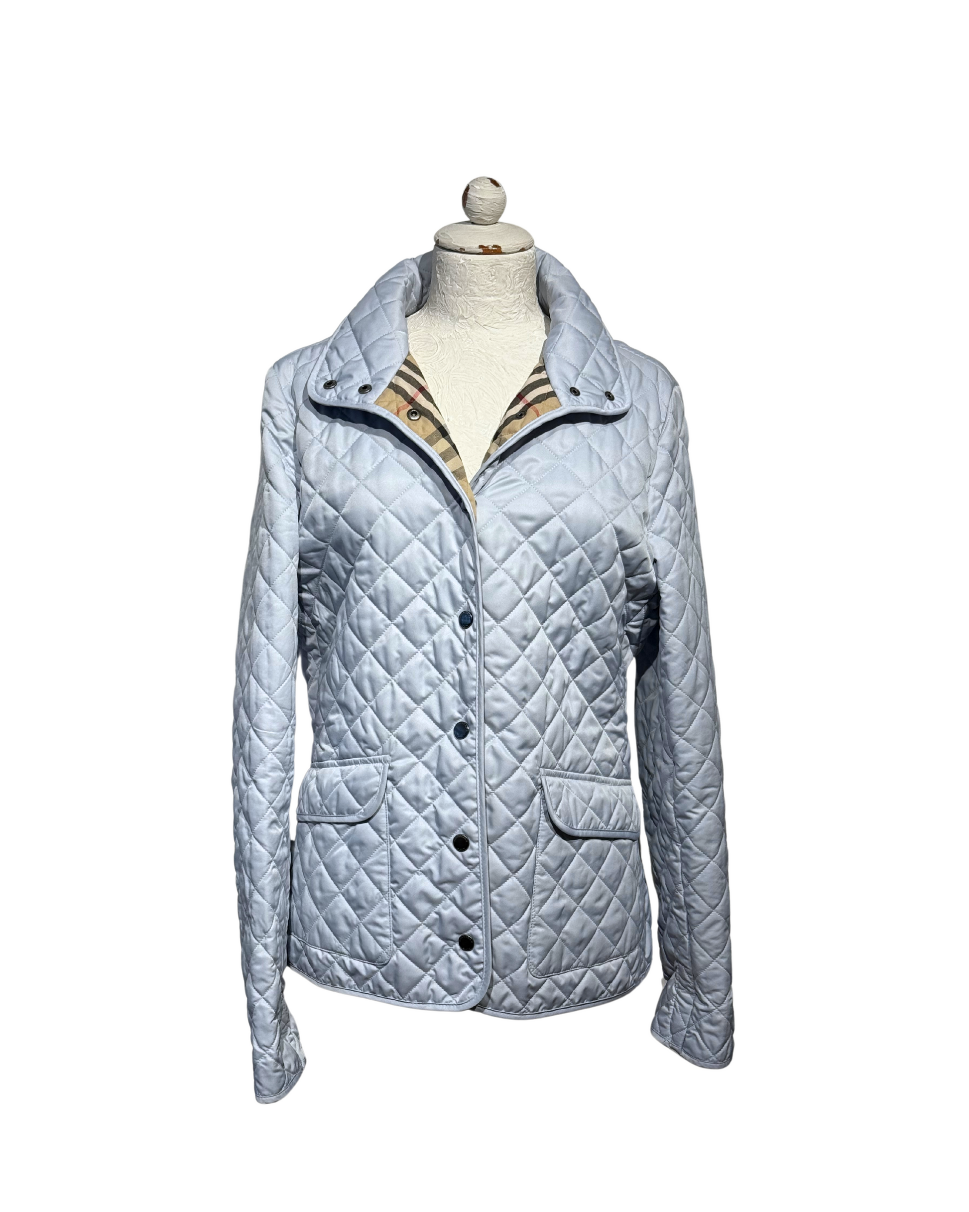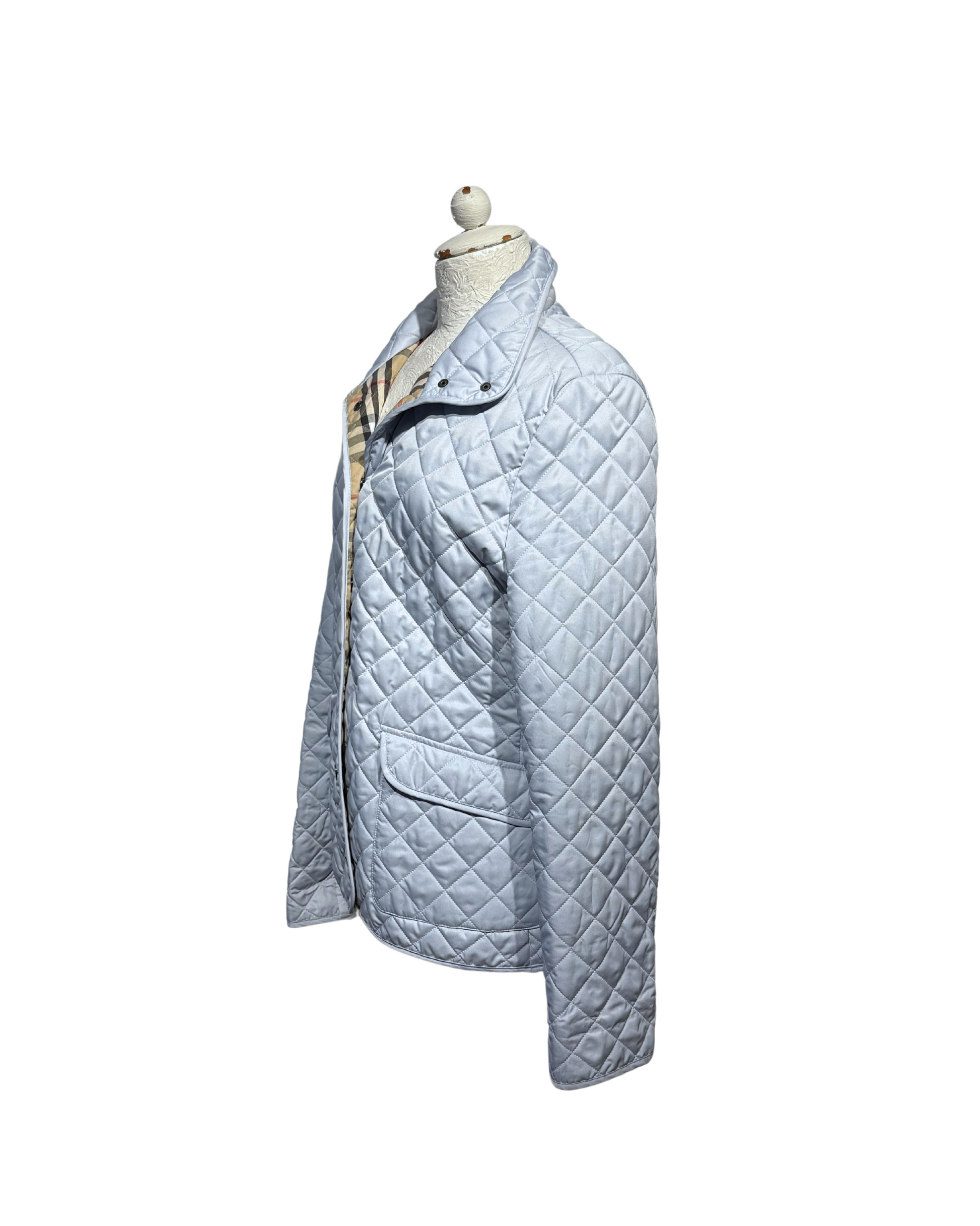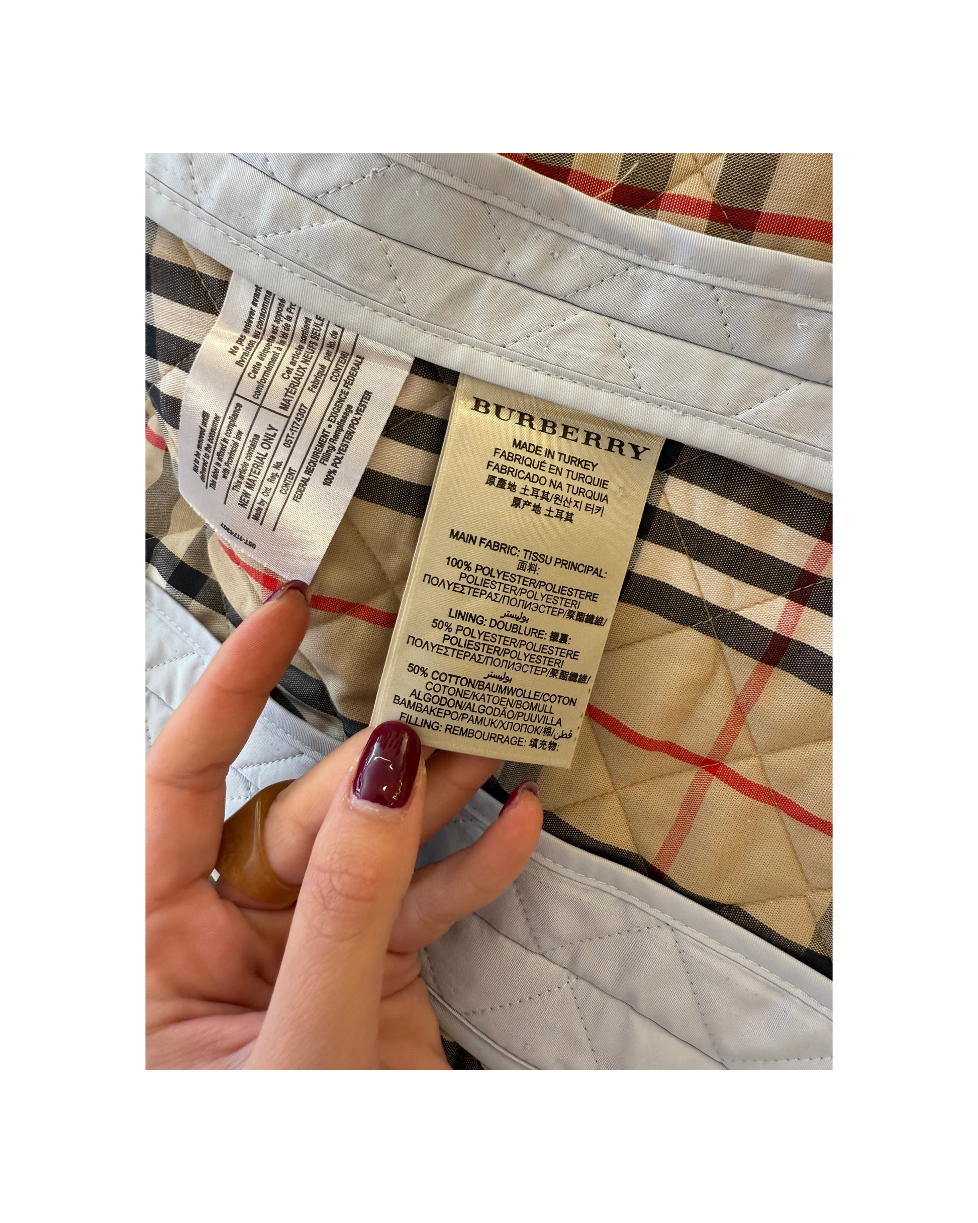 Giacca trapuntata leggera di Burberry da donna con trama a rombi azzurro polvere. Chiusura con bottoni logati, due tasche laterali. Interno classica trama tartan. Perfetta per la mezza stagione.