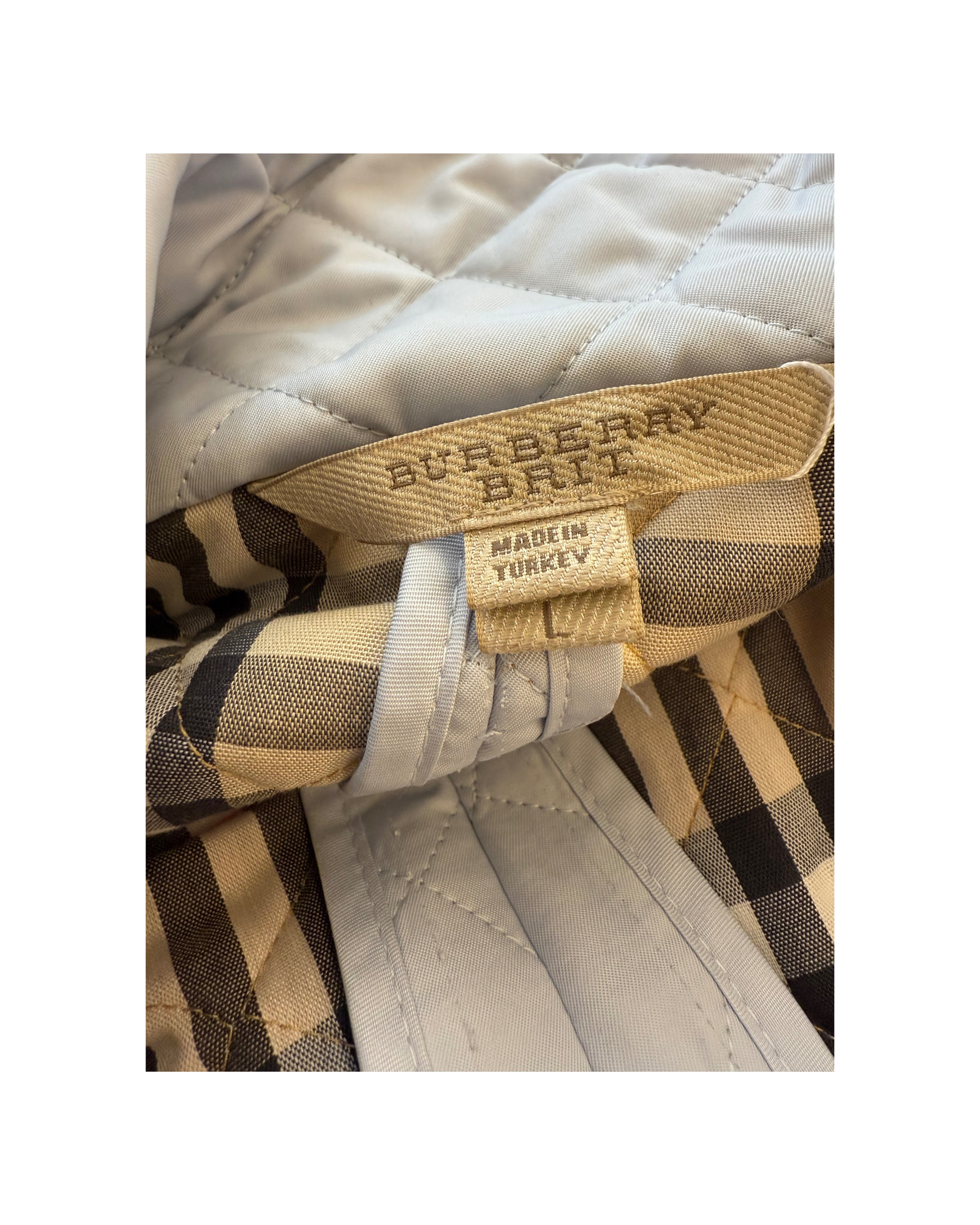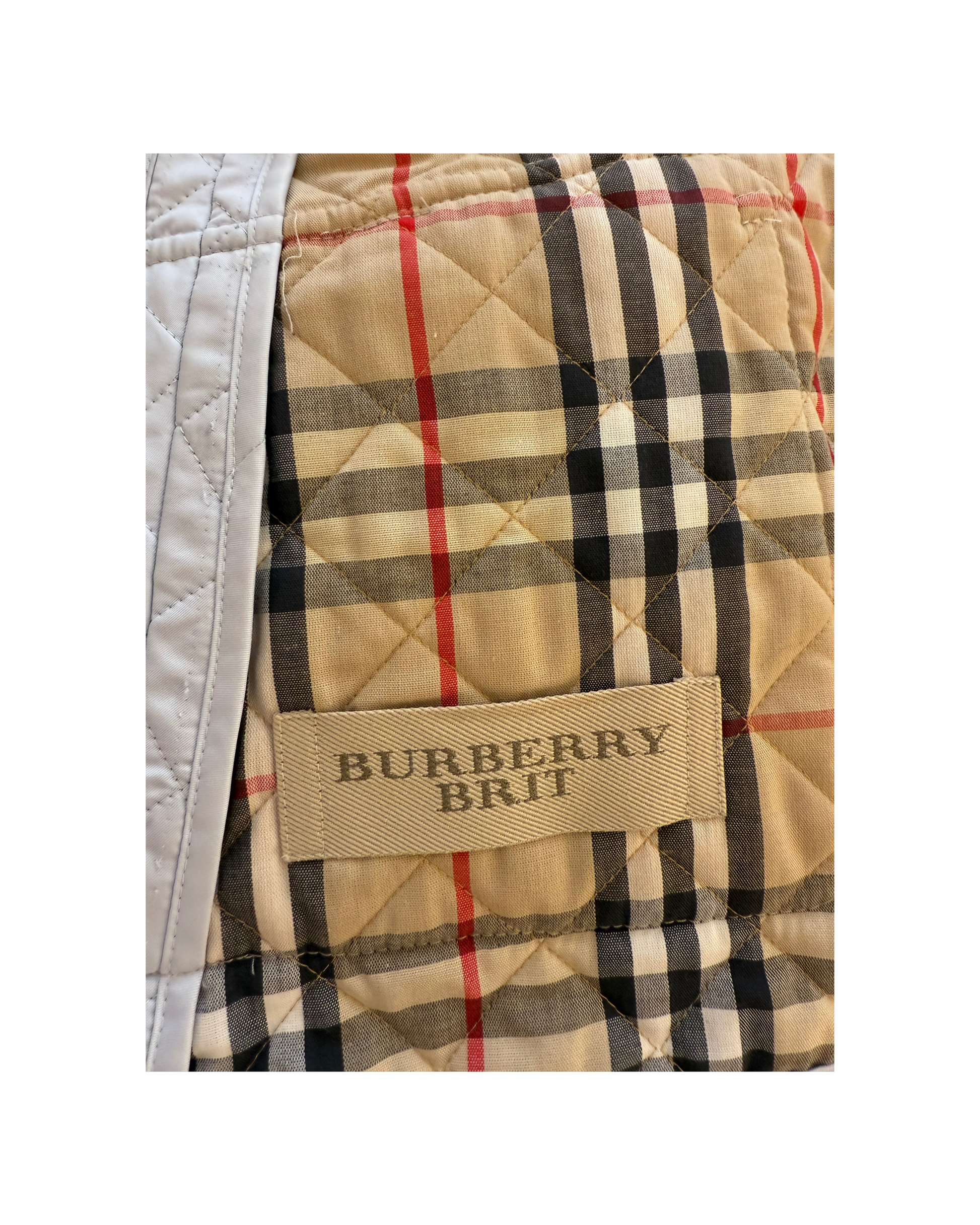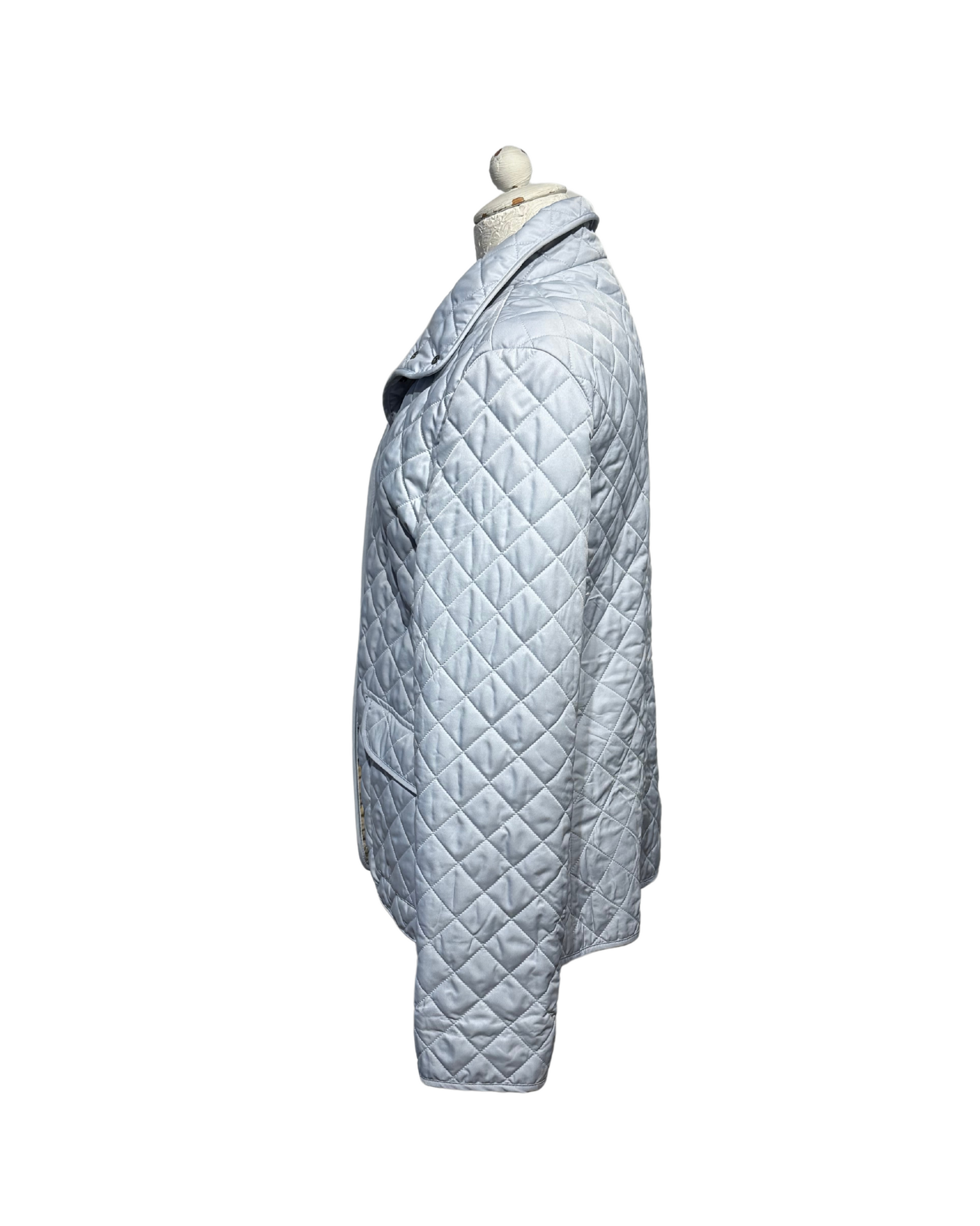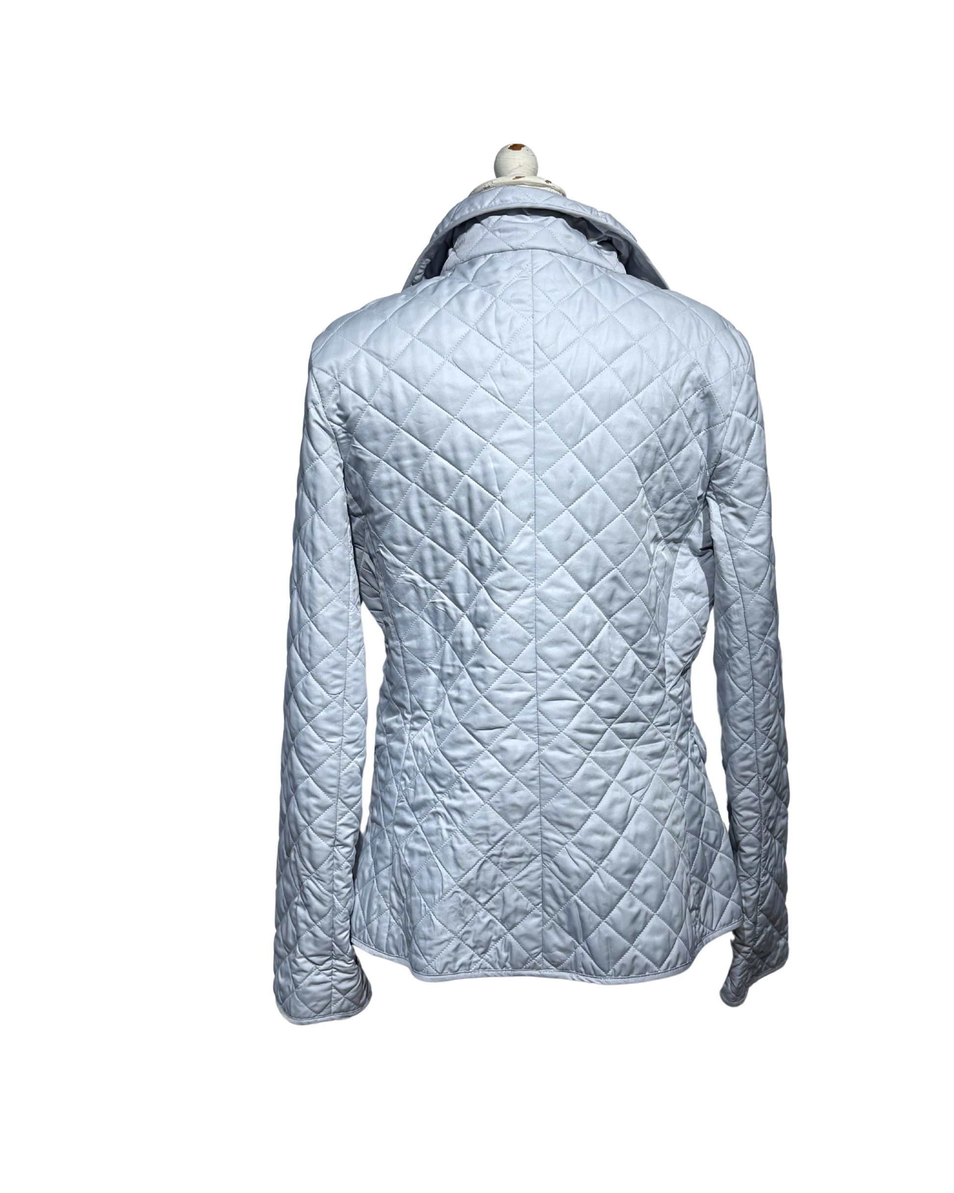 Giacca trapuntata leggera di Burberry da donna con trama a rombi azzurro polvere. Chiusura con bottoni logati, due tasche laterali. Interno classica trama tartan. Perfetta per la mezza stagione.