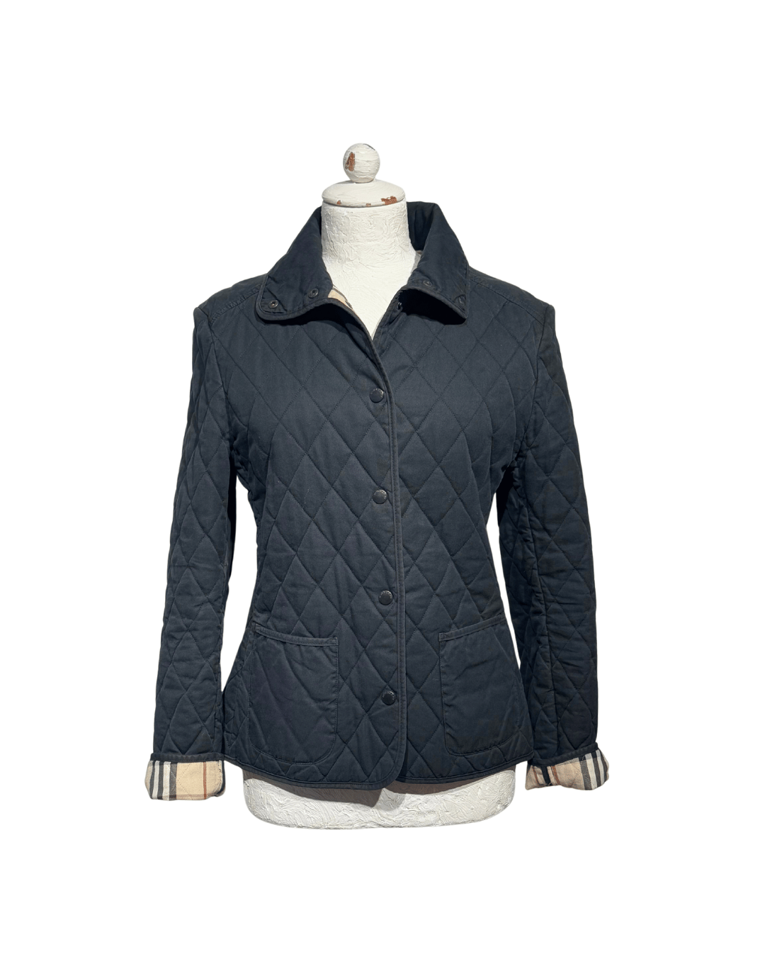 Iconica giacca trapuntata firmata Burberry London, realizzata in 100% cotone con la classica fodera interna in check beige, simbolo intramontabile della Maison britannica.