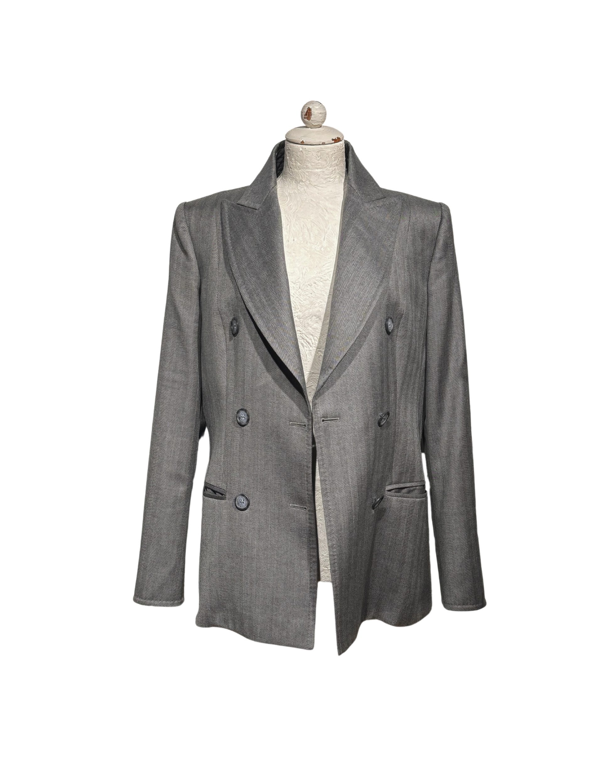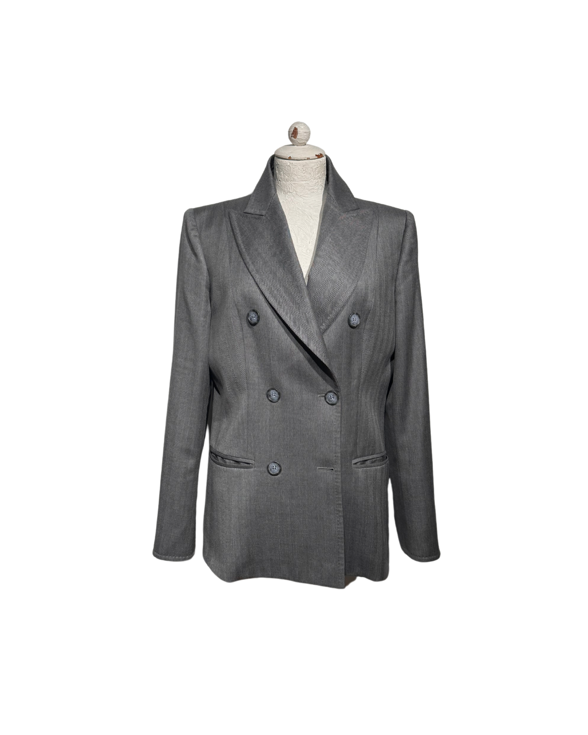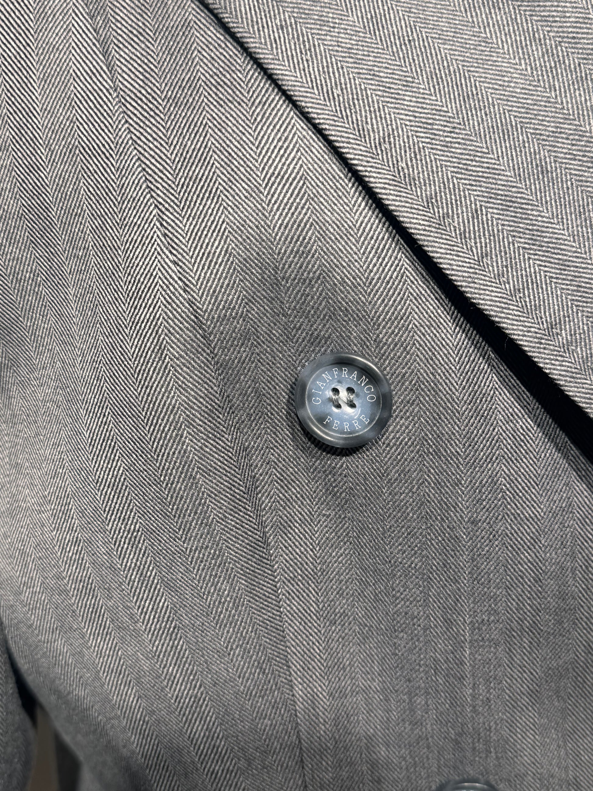 Giacca vintage Ferre realizzata in lana grigia a spina di pesce. Apertura doppio petto con bottoni grigi logati. Tasche laterali e spalline imbottite. Interno in seta.