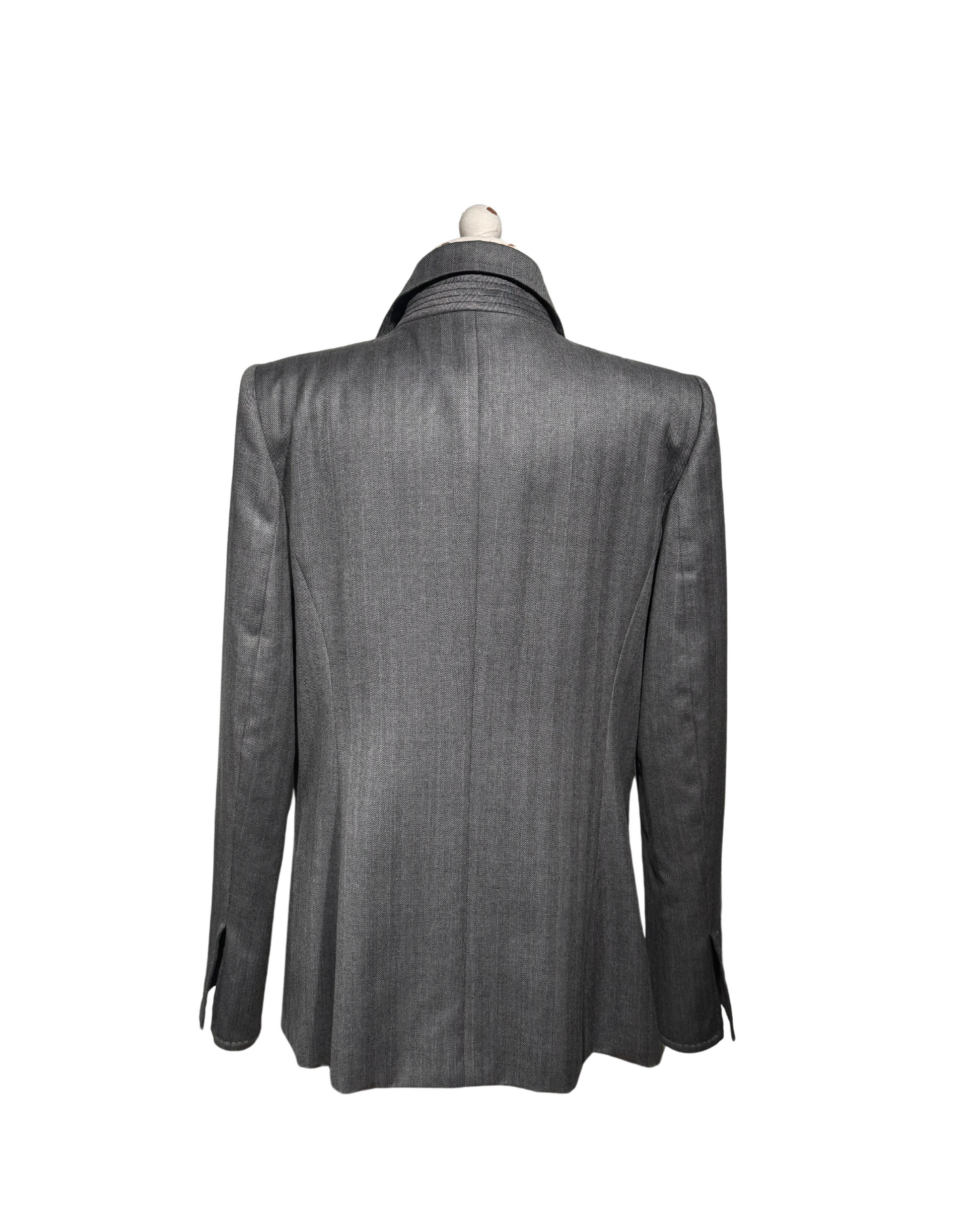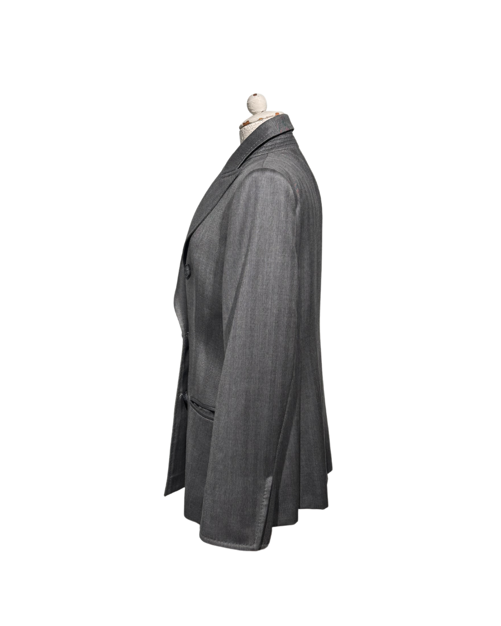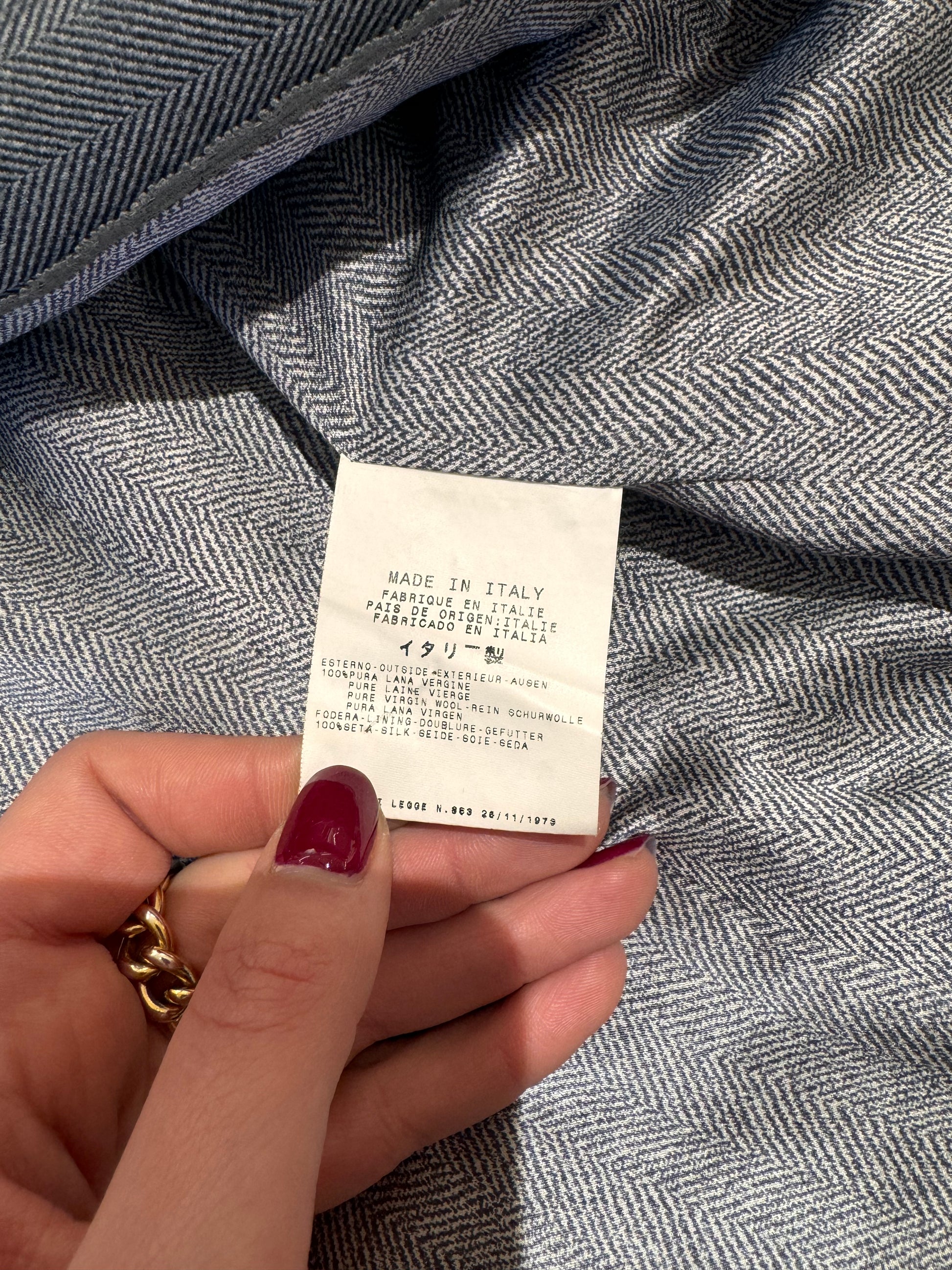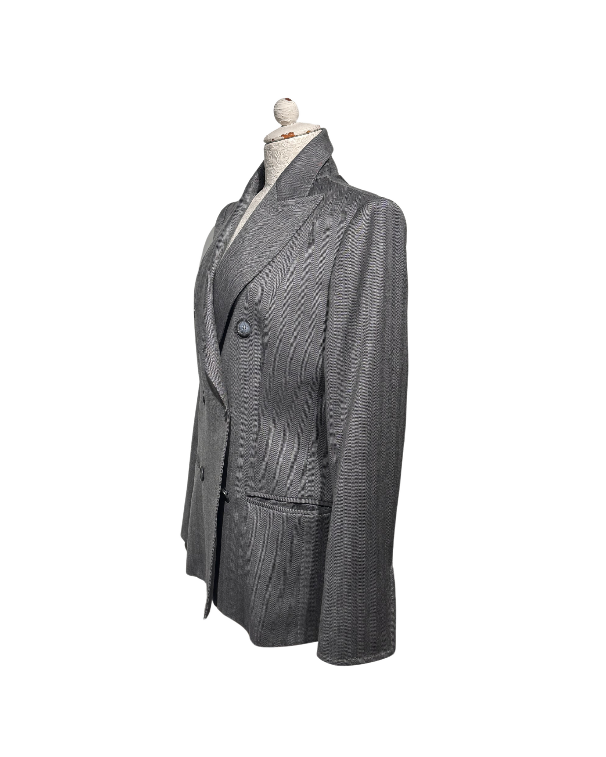 Giacca vintage Ferre realizzata in lana grigia a spina di pesce. Apertura doppio petto con bottoni grigi logati. Tasche laterali e spalline imbottite. Interno in seta.
